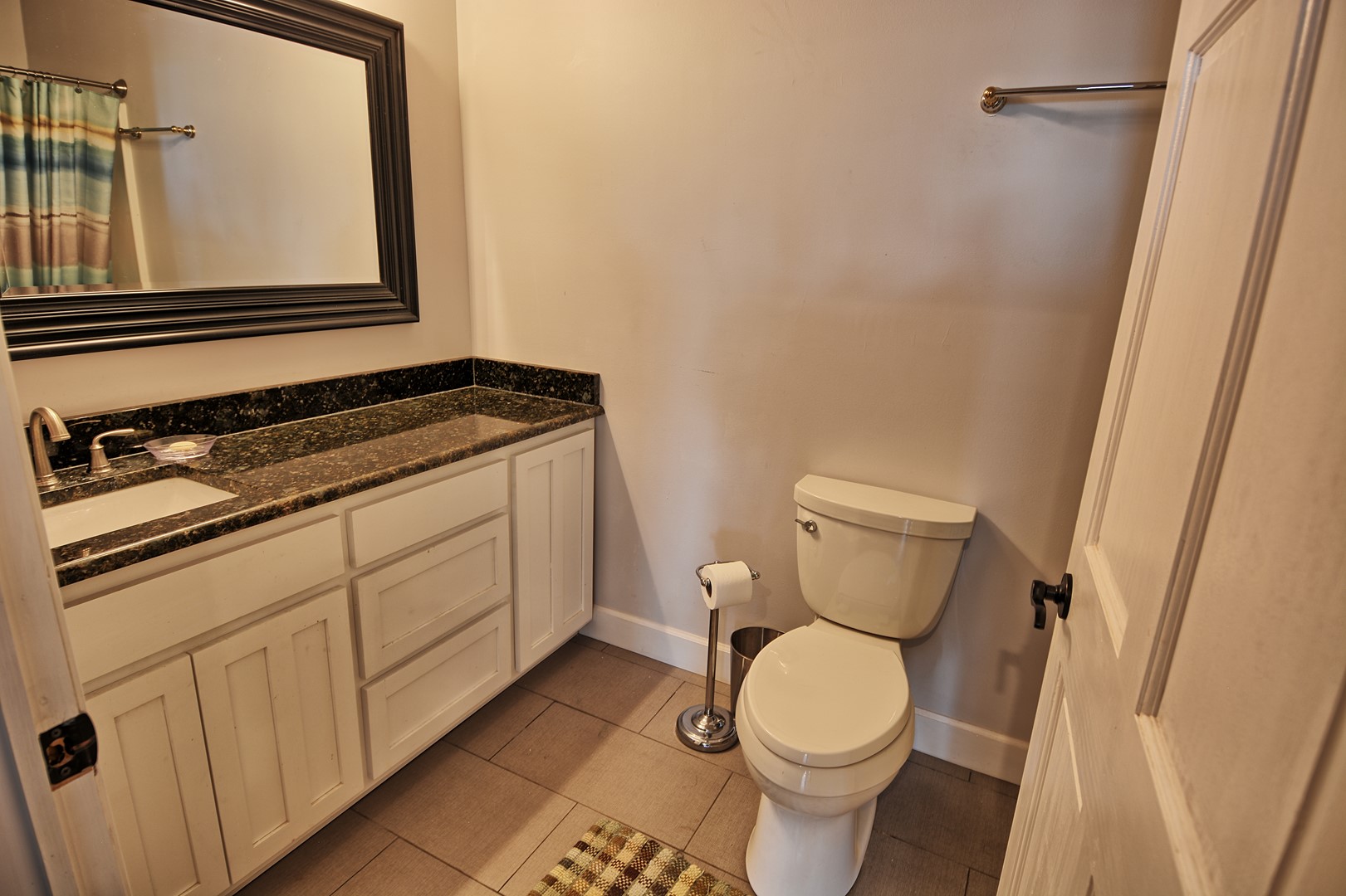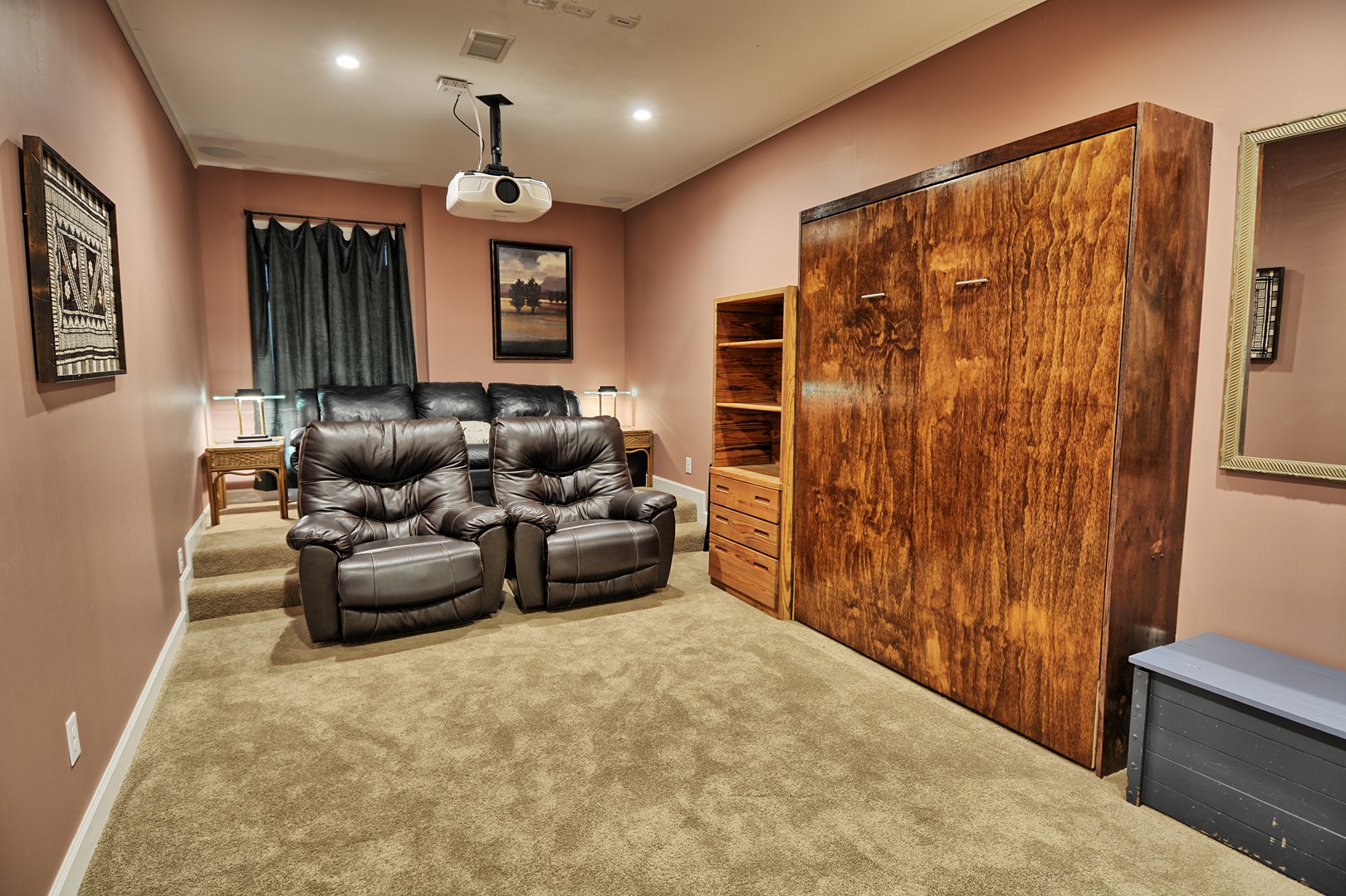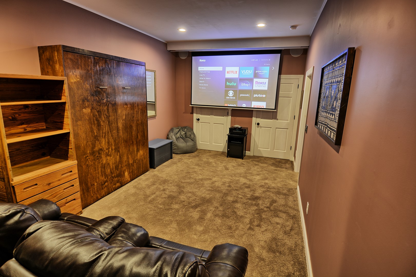 We know you’ll love spending time in our large theater room with a 90” movie screen, over head projector with surround sound. The projector has a Roku device to stream your favorite movie. The theater room also has the 3rd sleeping area with a queen size Murphy bed. The third full bathroom is in the hallway on the lower level that has a tub/shower combo.