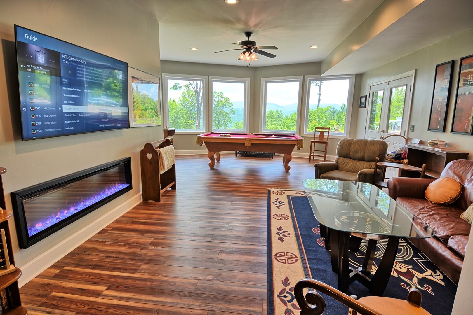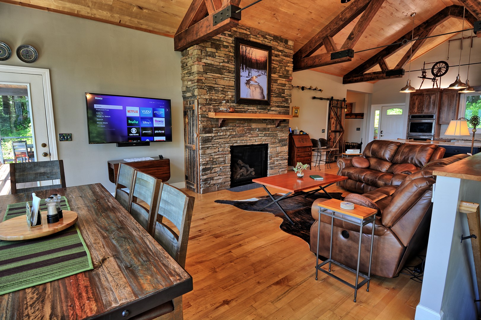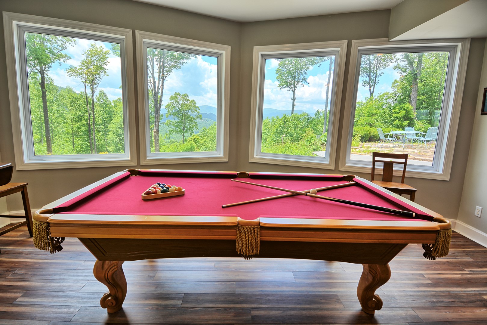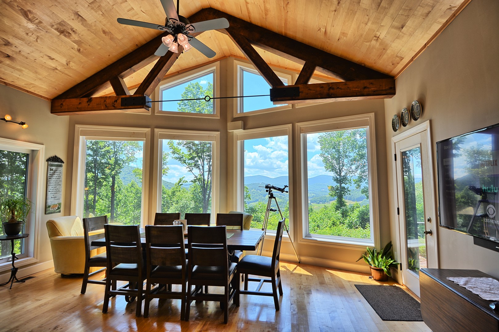 The dining area has plenty of seating and a wall of windows to enjoy your meal while gazing at the beautiful Blue Ridge Mountains. Behind the dining table are 2 swivel chairs to relax, drink your favorite beverage while your stress fades away!