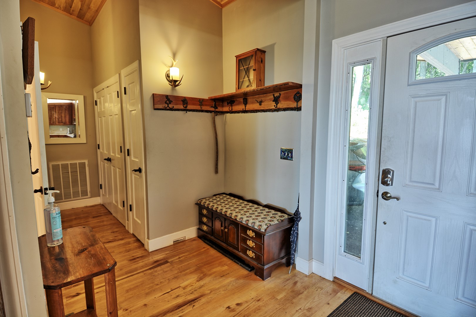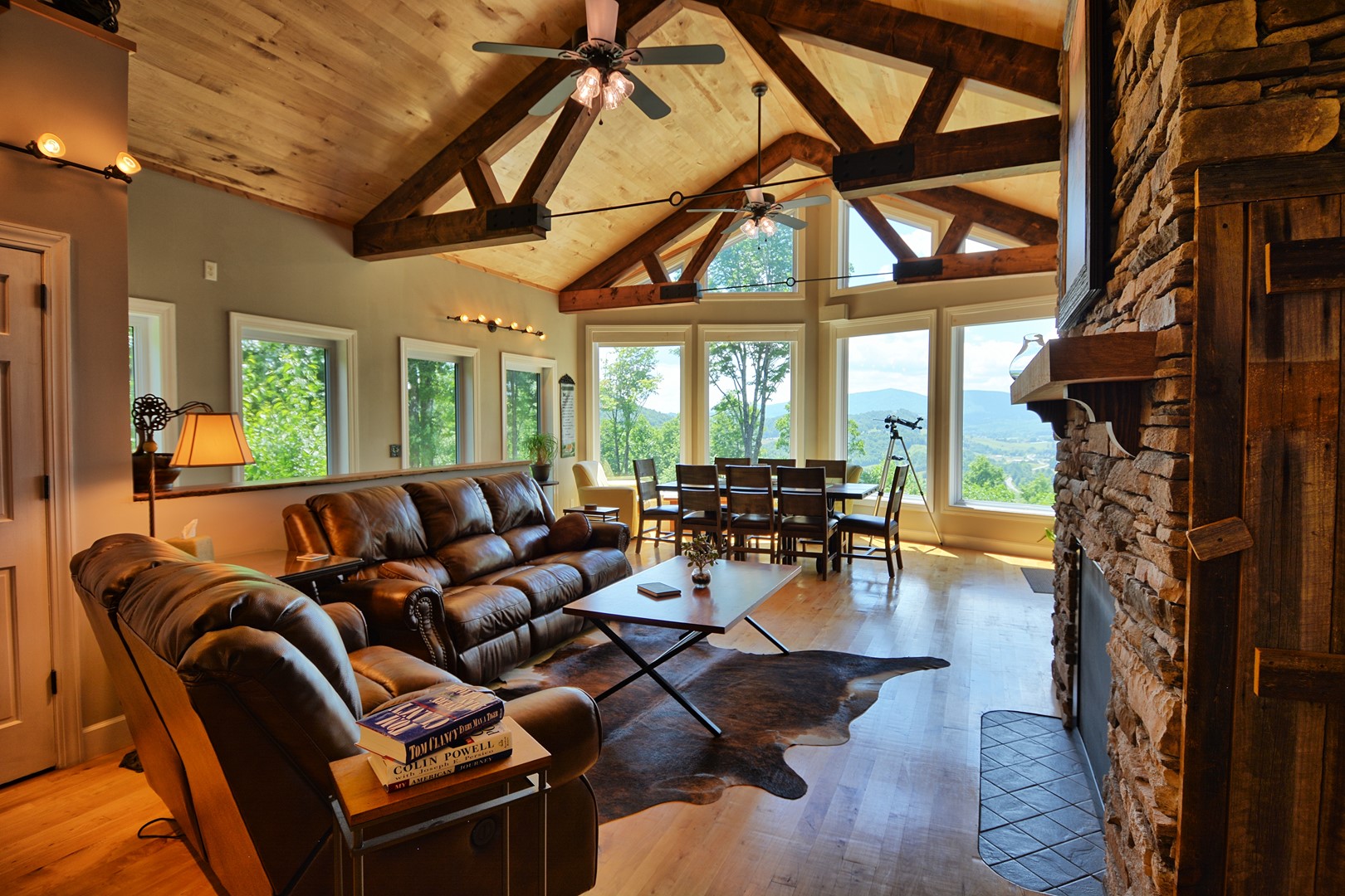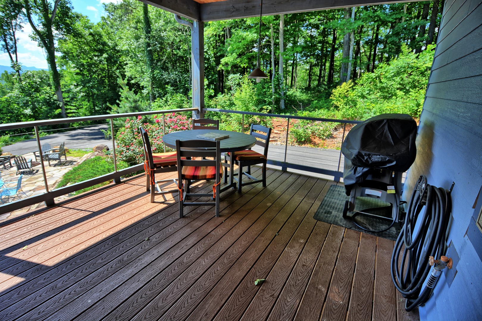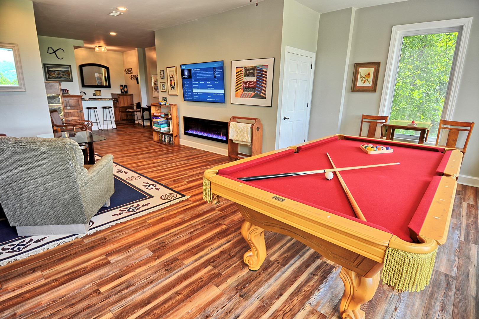 The dining area has plenty of seating and a wall of windows to enjoy your meal while gazing at the beautiful Blue Ridge Mountains. Behind the dining table are 2 swivel chairs to relax, drink your favorite beverage while your stress fades away!