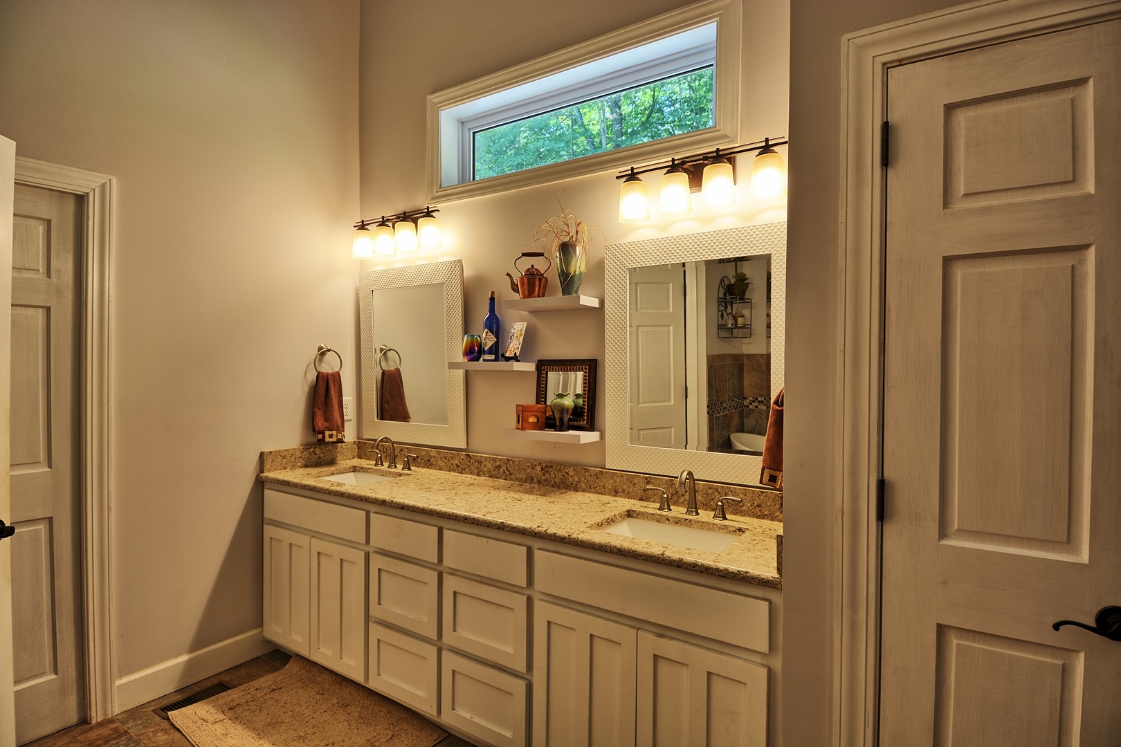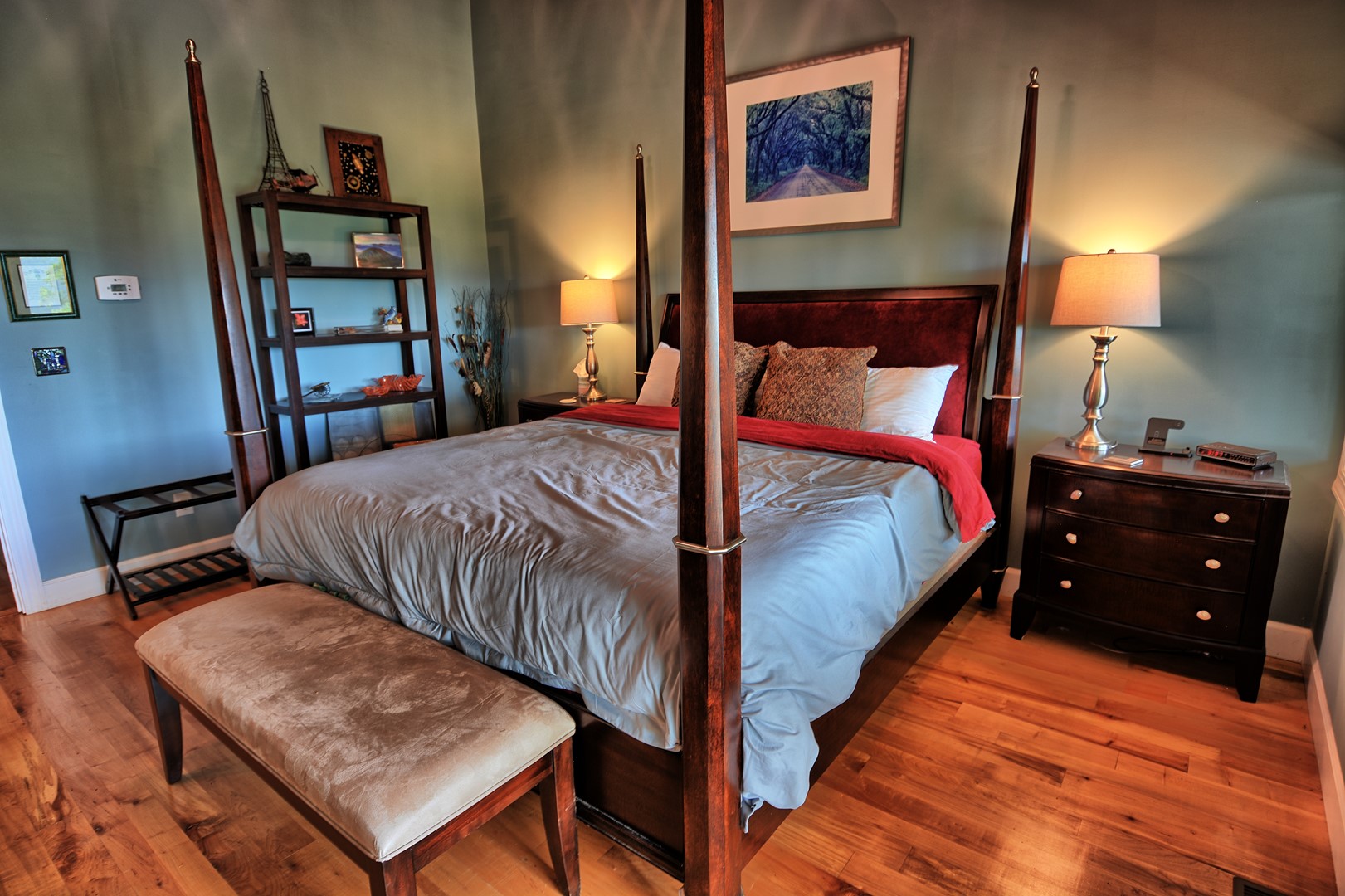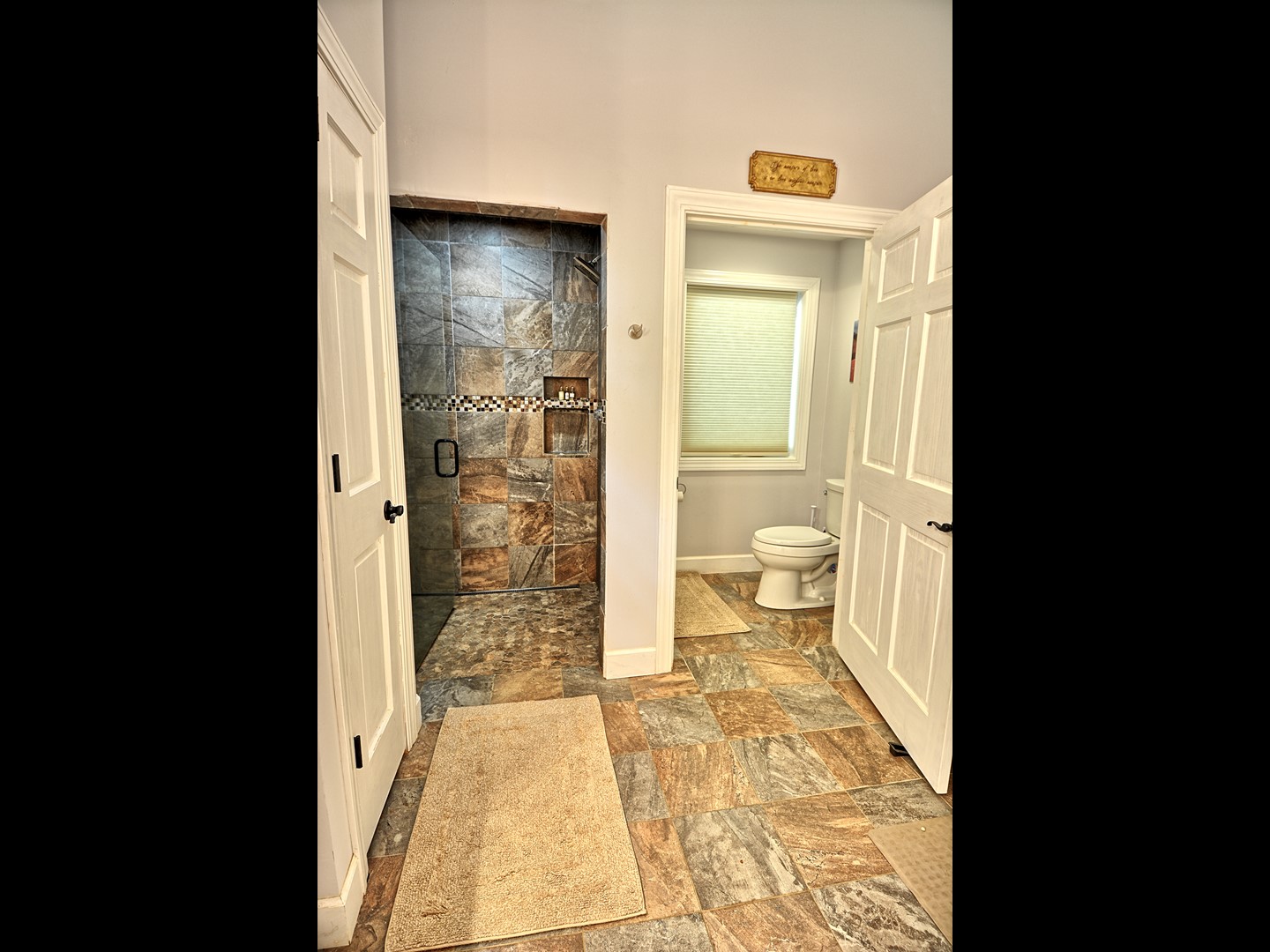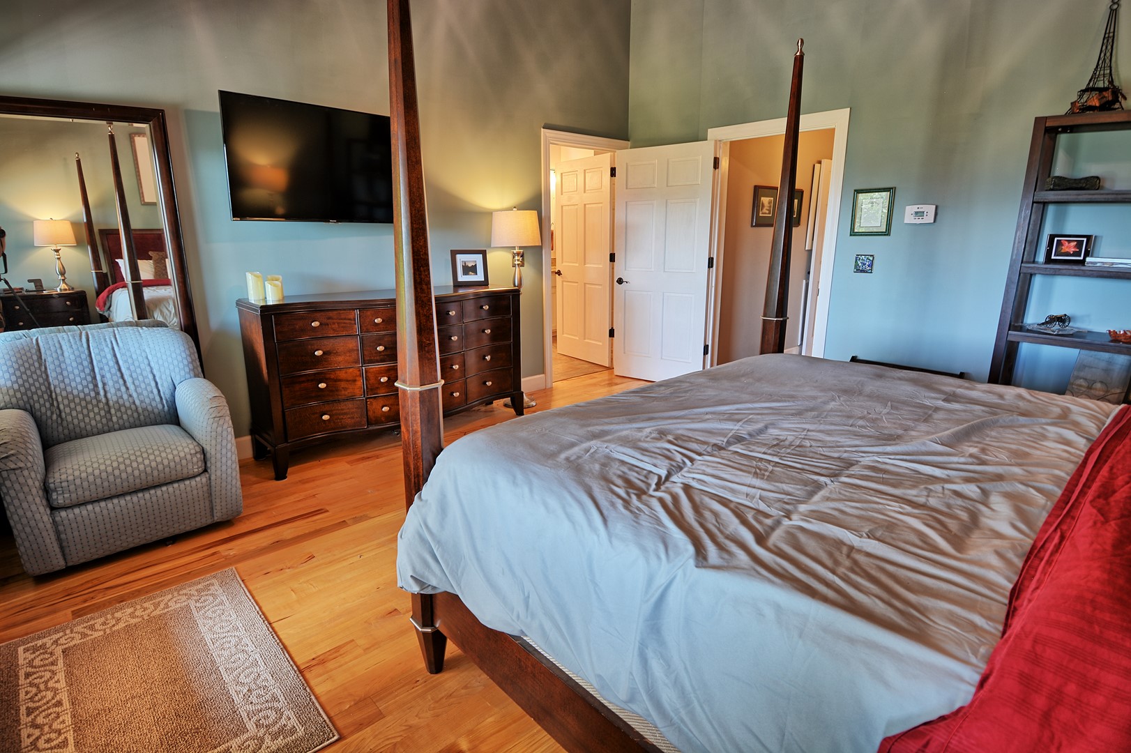 The master bedroom has a king size bed with Roku TV, En Suite bathroom. Master bathroom has a soaking tub, walk-in stone/tile shower and double vanity sinks. You can access the marvelous, covered deck from the bedroom that has a porch swing, table with chairs and a gas grill. The bedroom has its own thermostat to control the heat/AC.