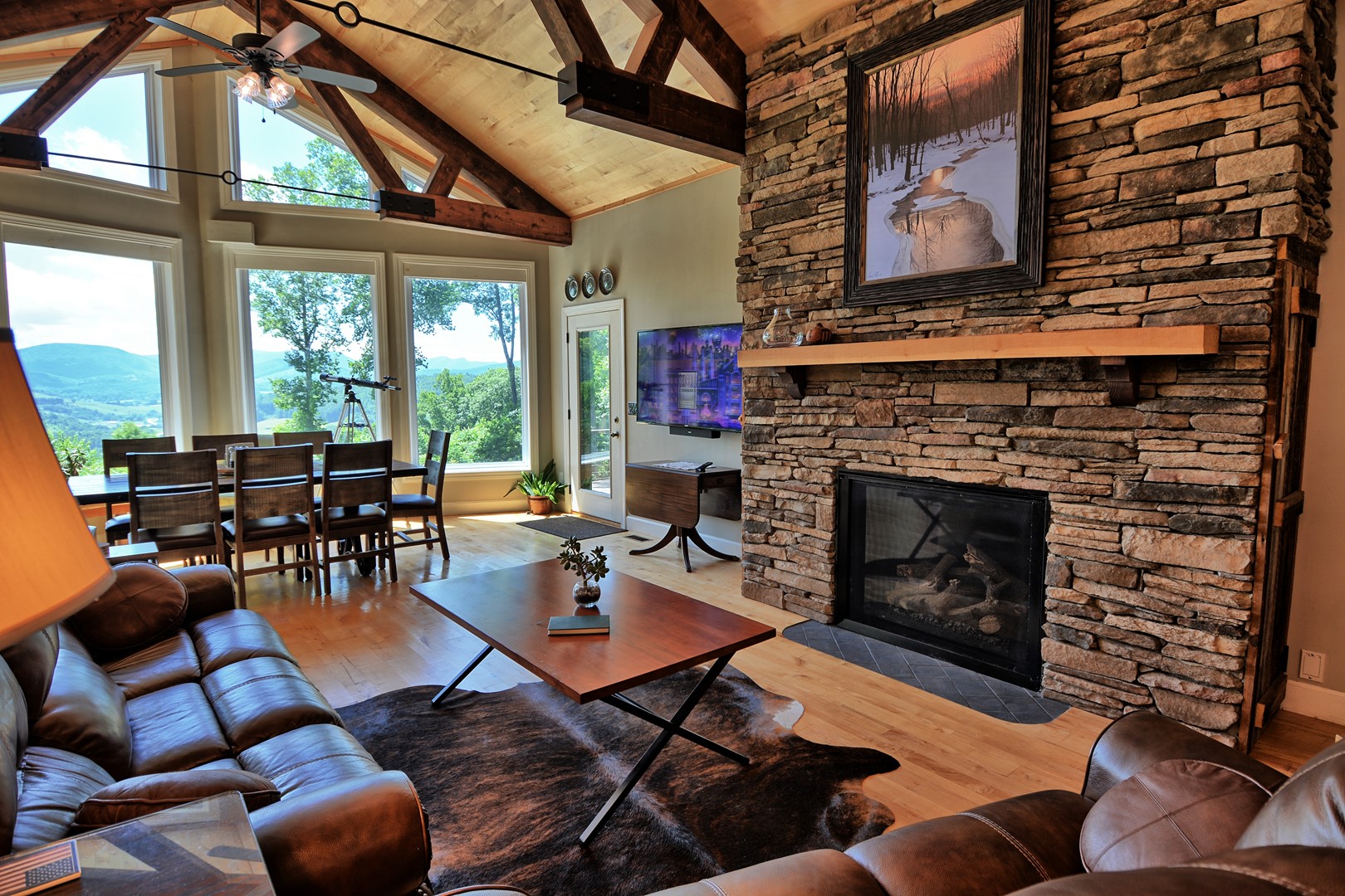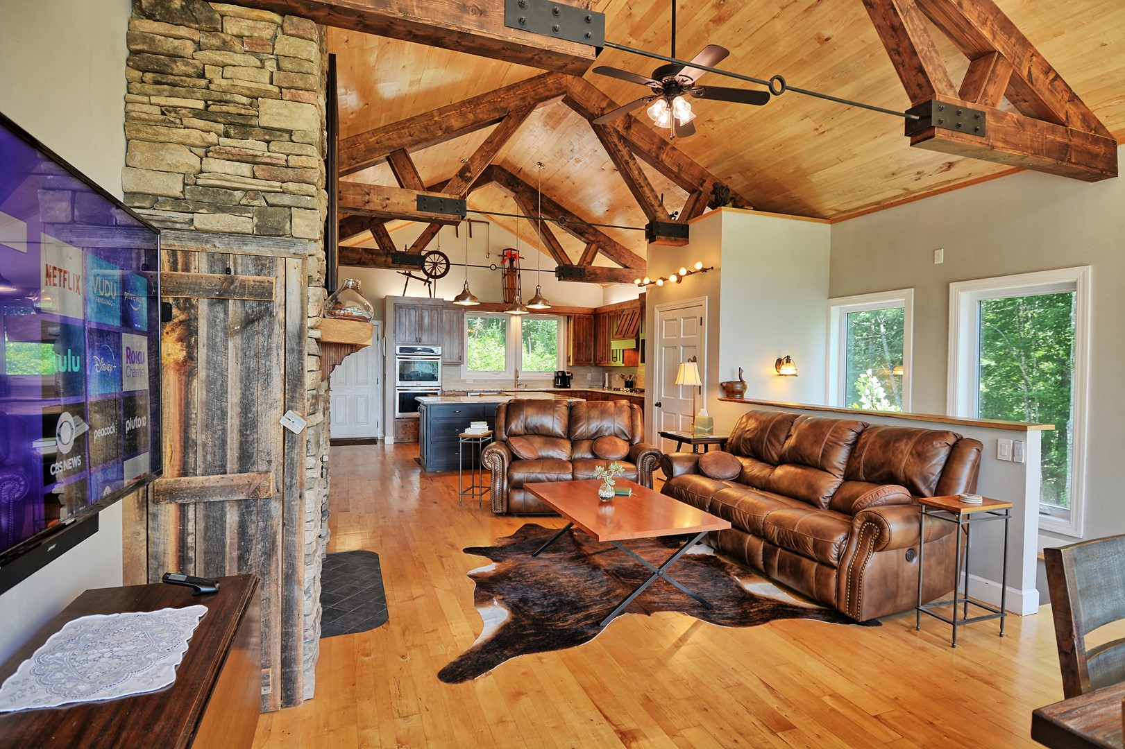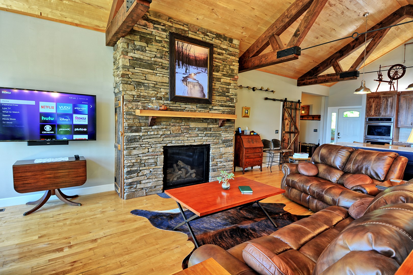 MAIN FLOOR: The spacious and beautiful living area is on the main floor. The living room has a stacked stone gas fireplace (fireplace operational from Oct. 1 – April 1) with comfortable leather furniture. There is a large 65” flat screen TV with Roku for streaming your favorite app (YOUR login information is required).