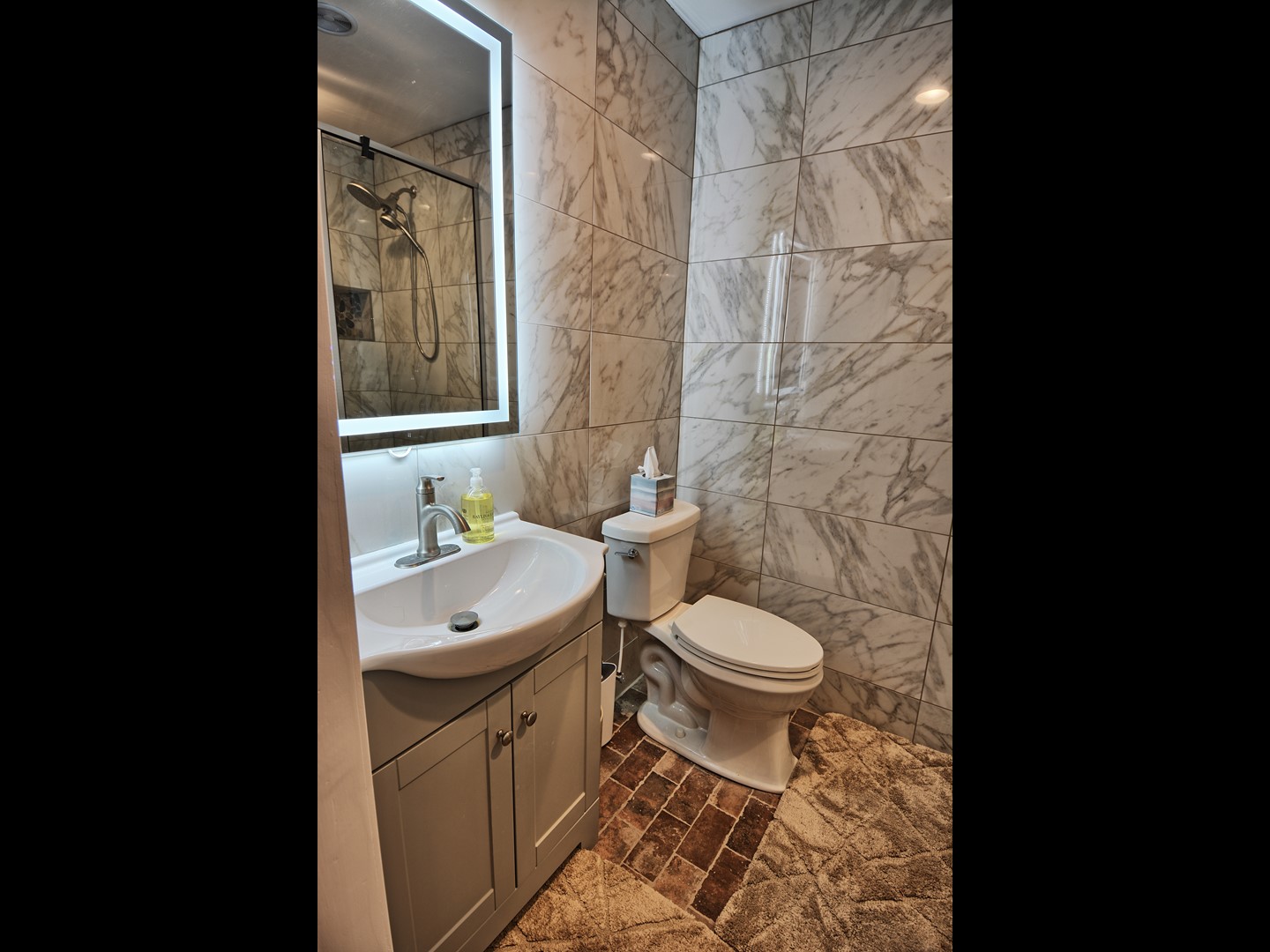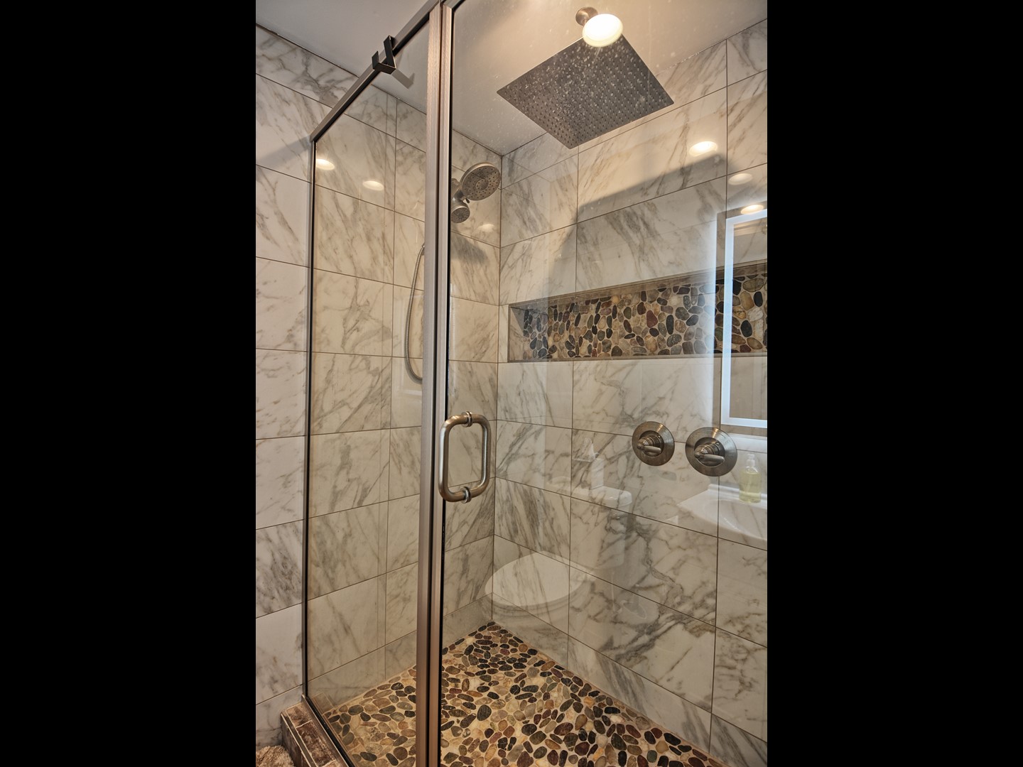 The second bedroom is a Jr. Master bedroom with a king size bed, Roku TV, private En Suite bathroom with a step in tiled shower with a rain shower head.