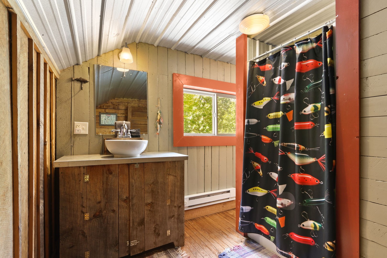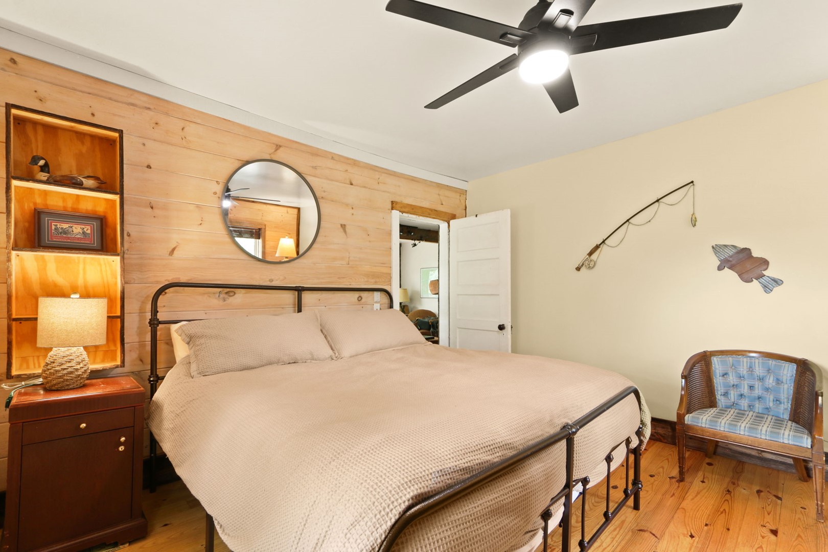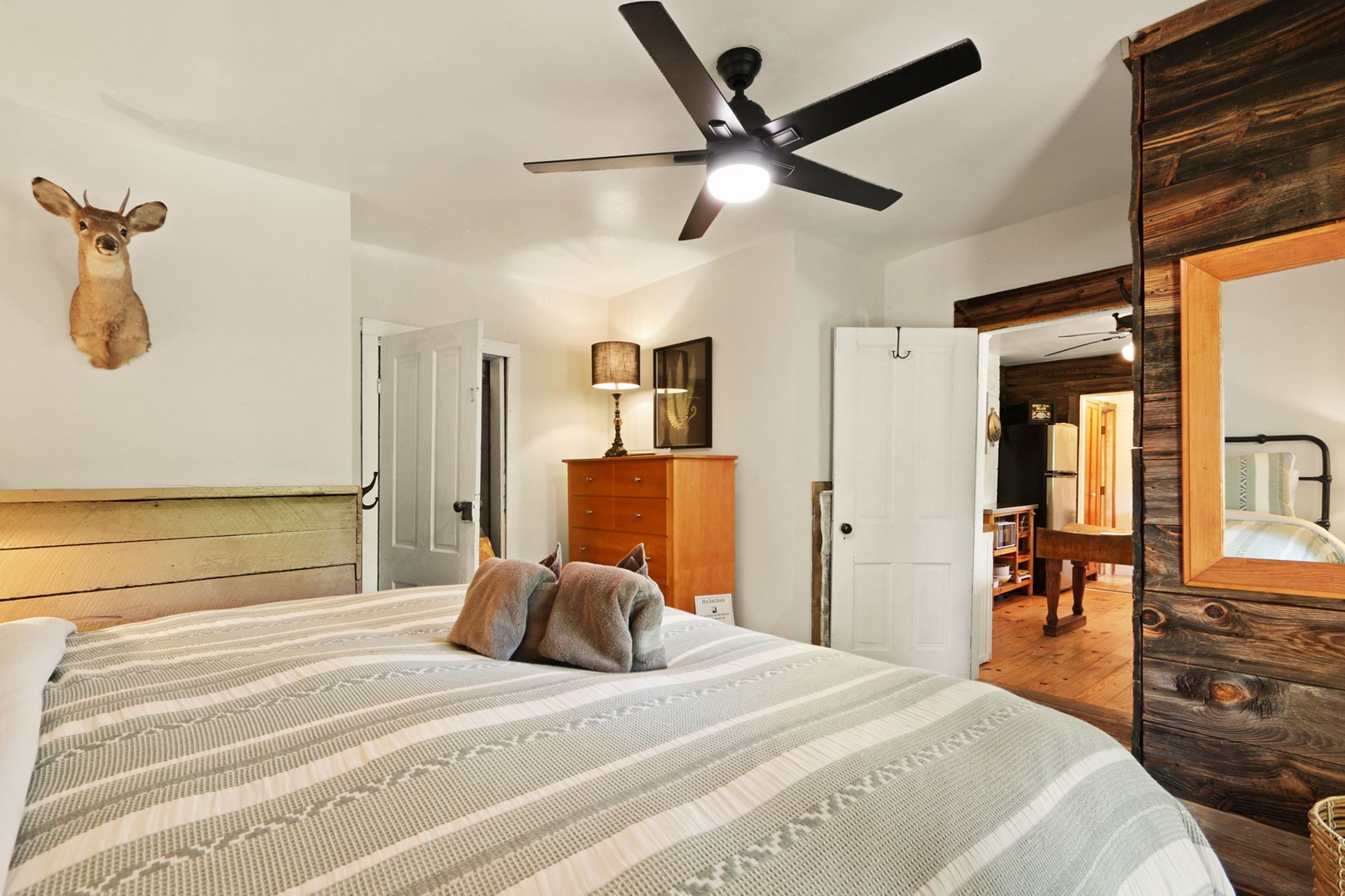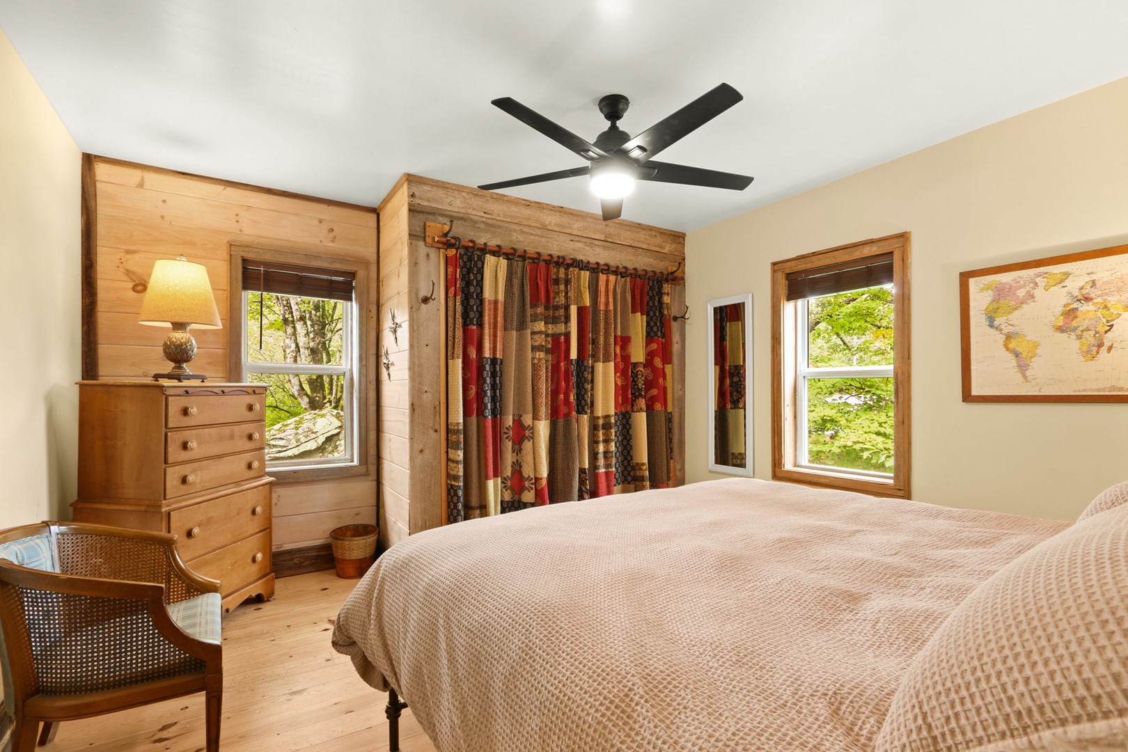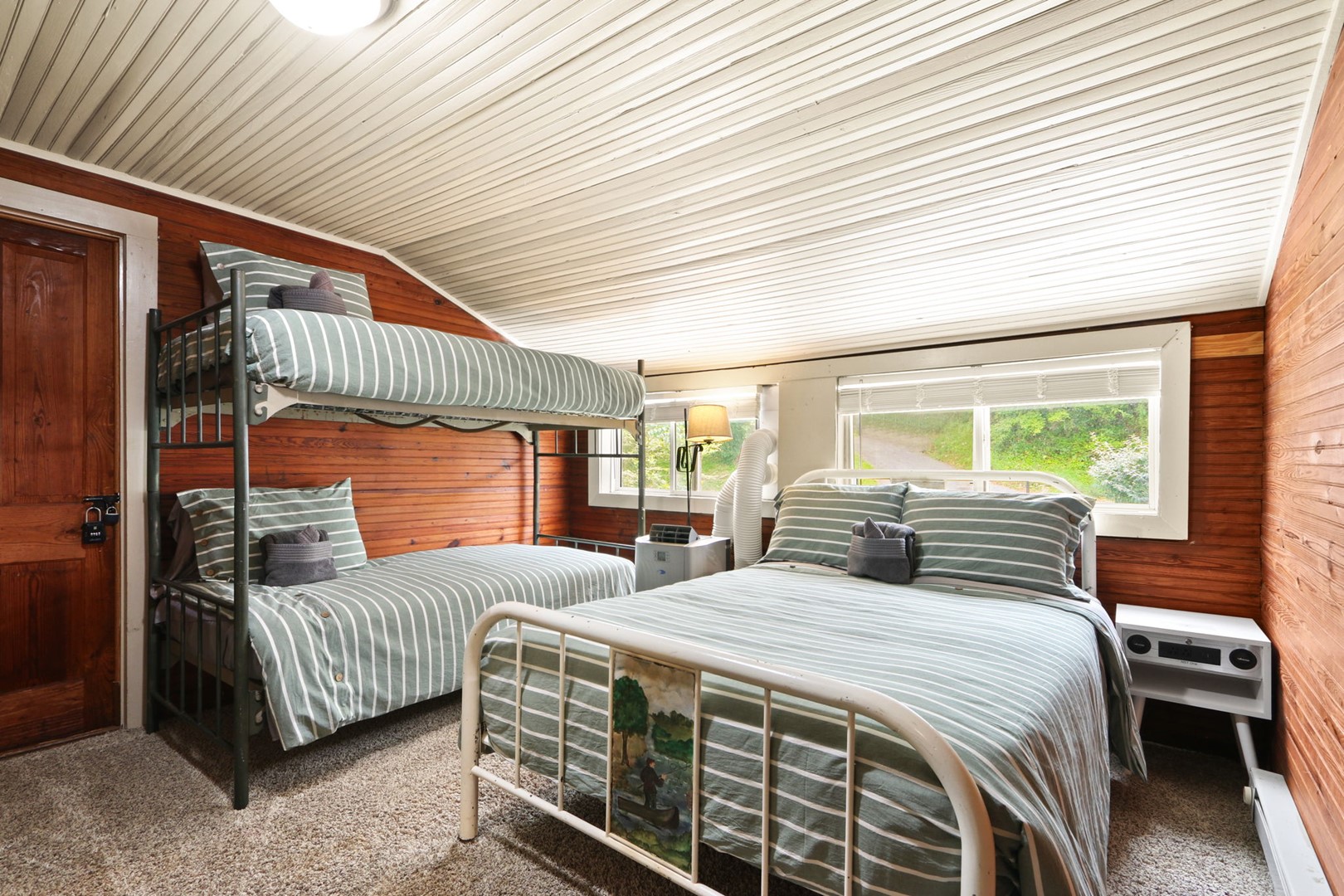 Upper Floor: The upper floor has a bedroom with a full size bed and a bunk bed along with a full bathroom. This bedroom has a portable floor AC unit with remote control.