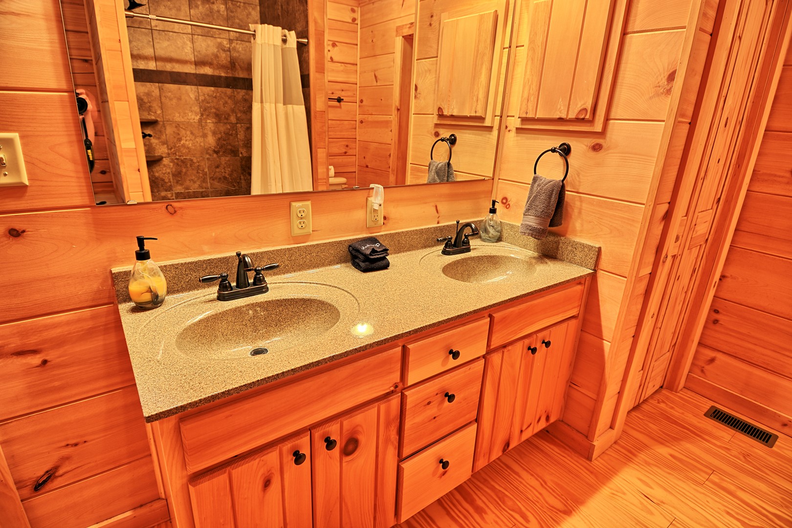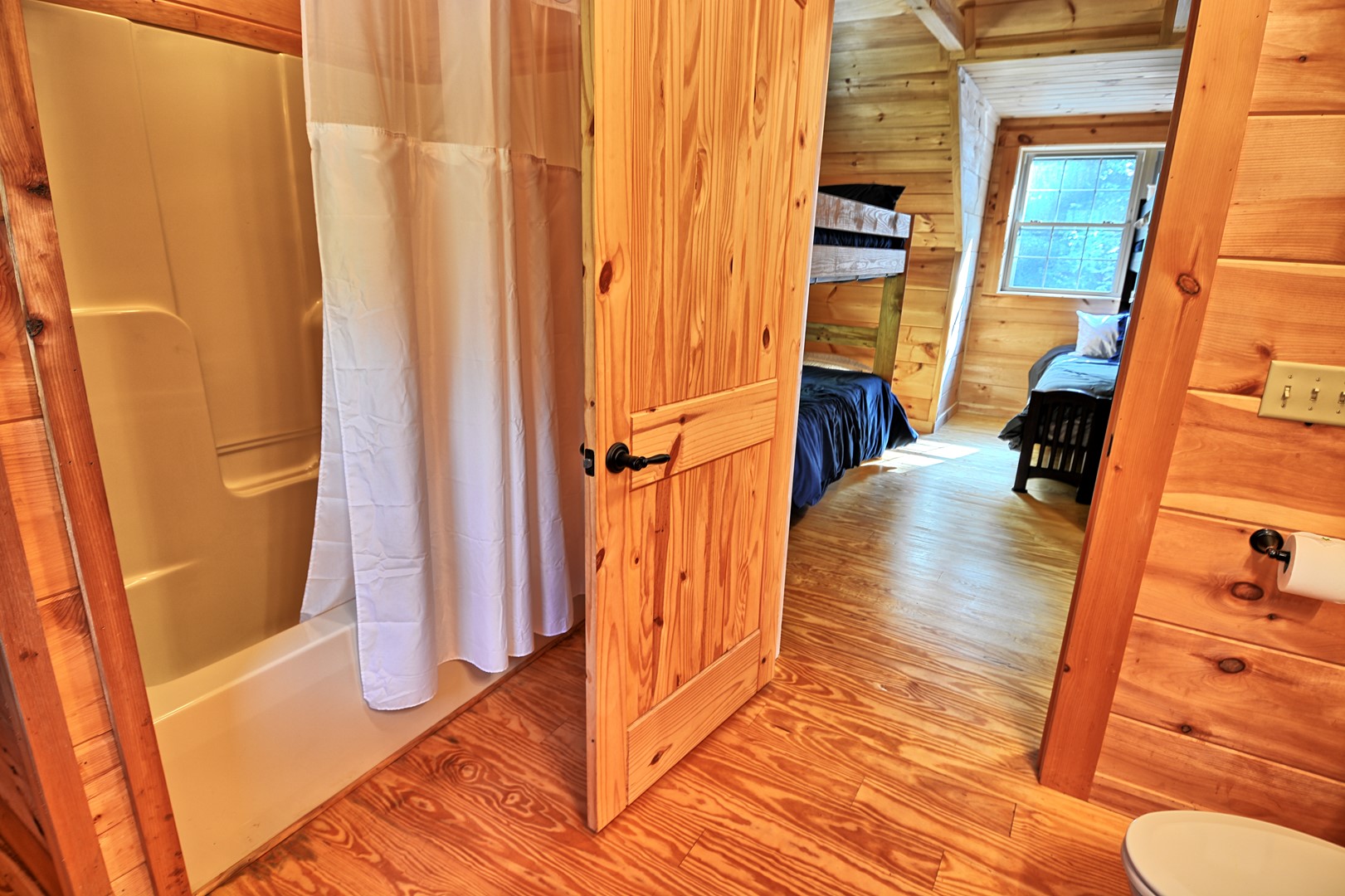 Bedroom 1: King Bed (master main floor) also has En Suite Master Bathroom | Bedroom 2: King Bed (main floor), bathroom located next to bedroom | Bedroom 3: (upper floor) Queen Bed, Twin Bunk Bed with En Suite Bathroom.
