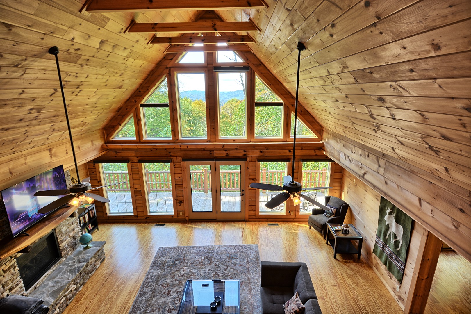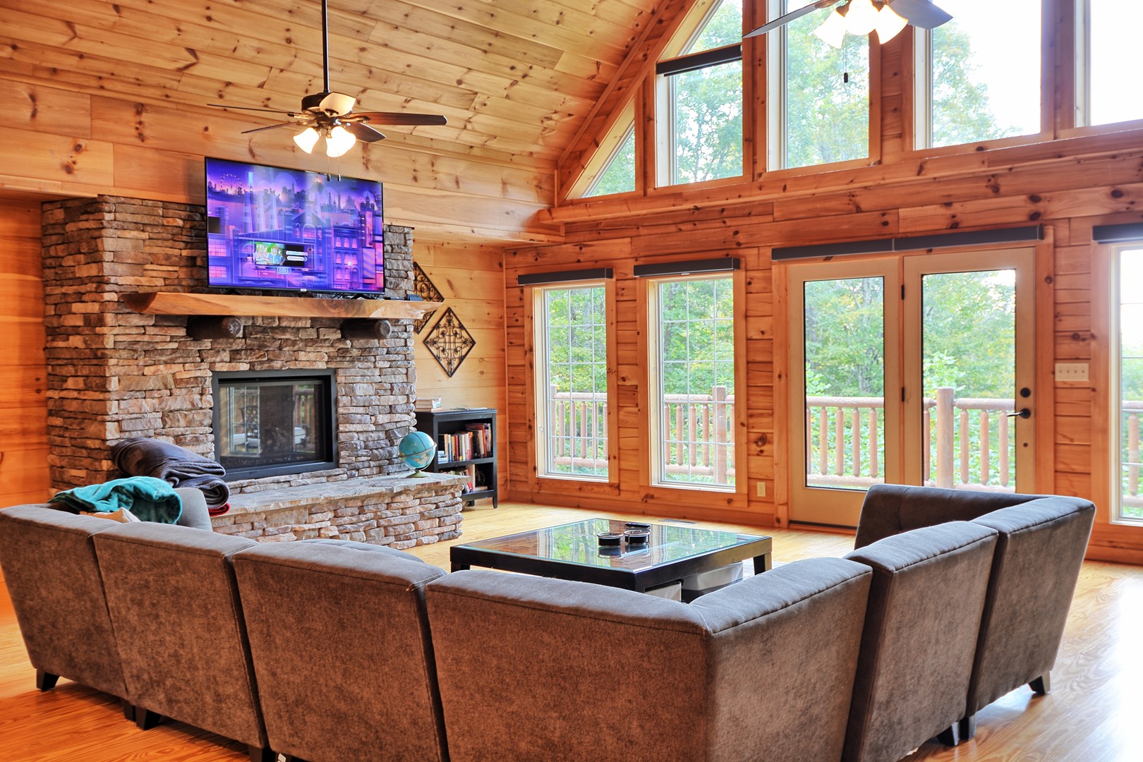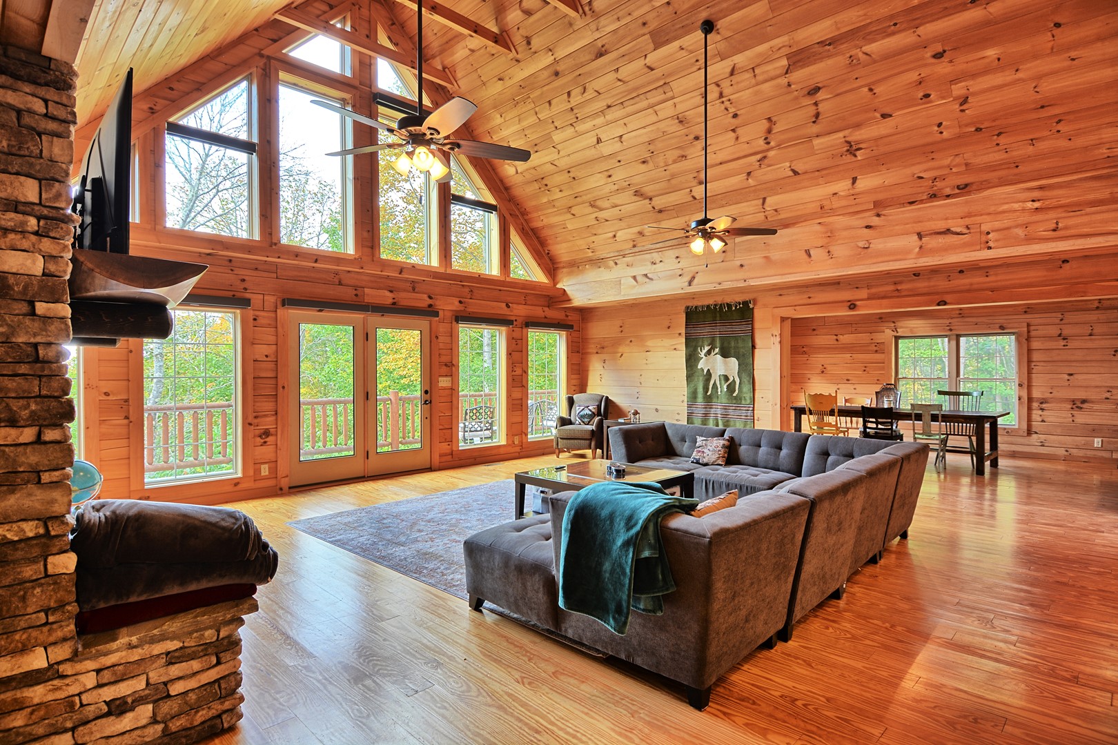 Indoor Living: 3 Smart TVs (no local channels-only streaming apps), gas fireplace (seasonal), dining table for 6 with additional seating for 3 at the bar, game room in basement w/ foosball table & electronic basketball game, books, laptop-friendly workspace, cathedral ceilings w/ floor-to-ceiling windows, ceiling fans and AC. There is a full size washer and dryer on the main floor.