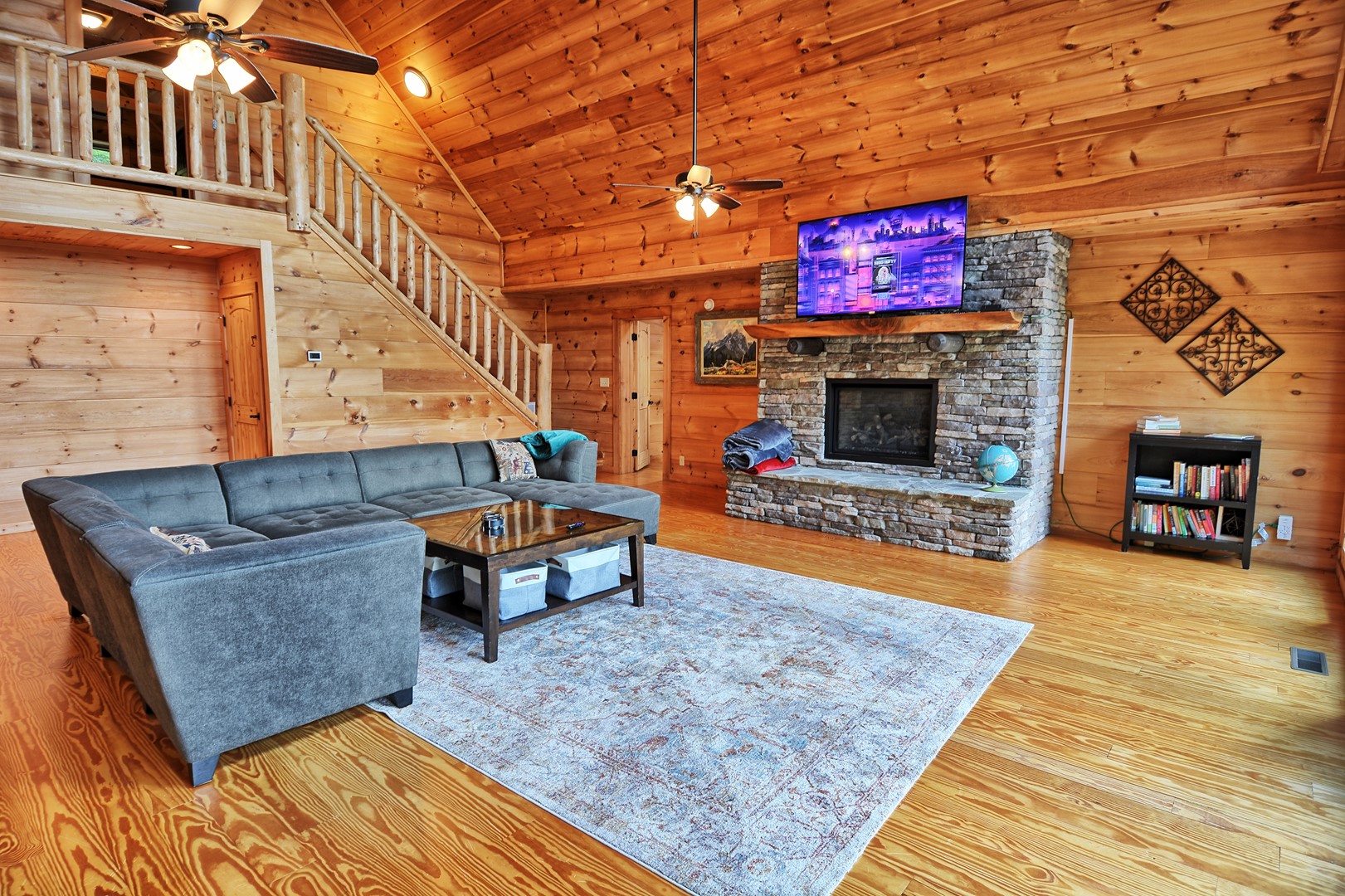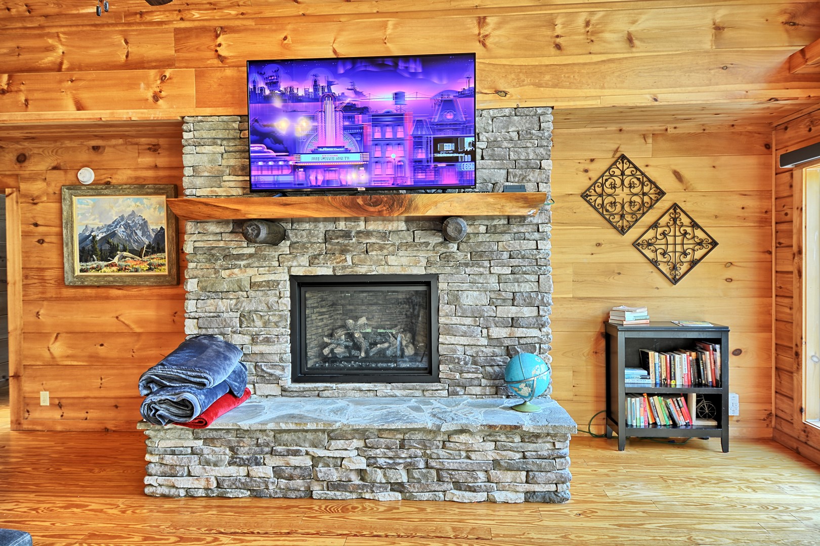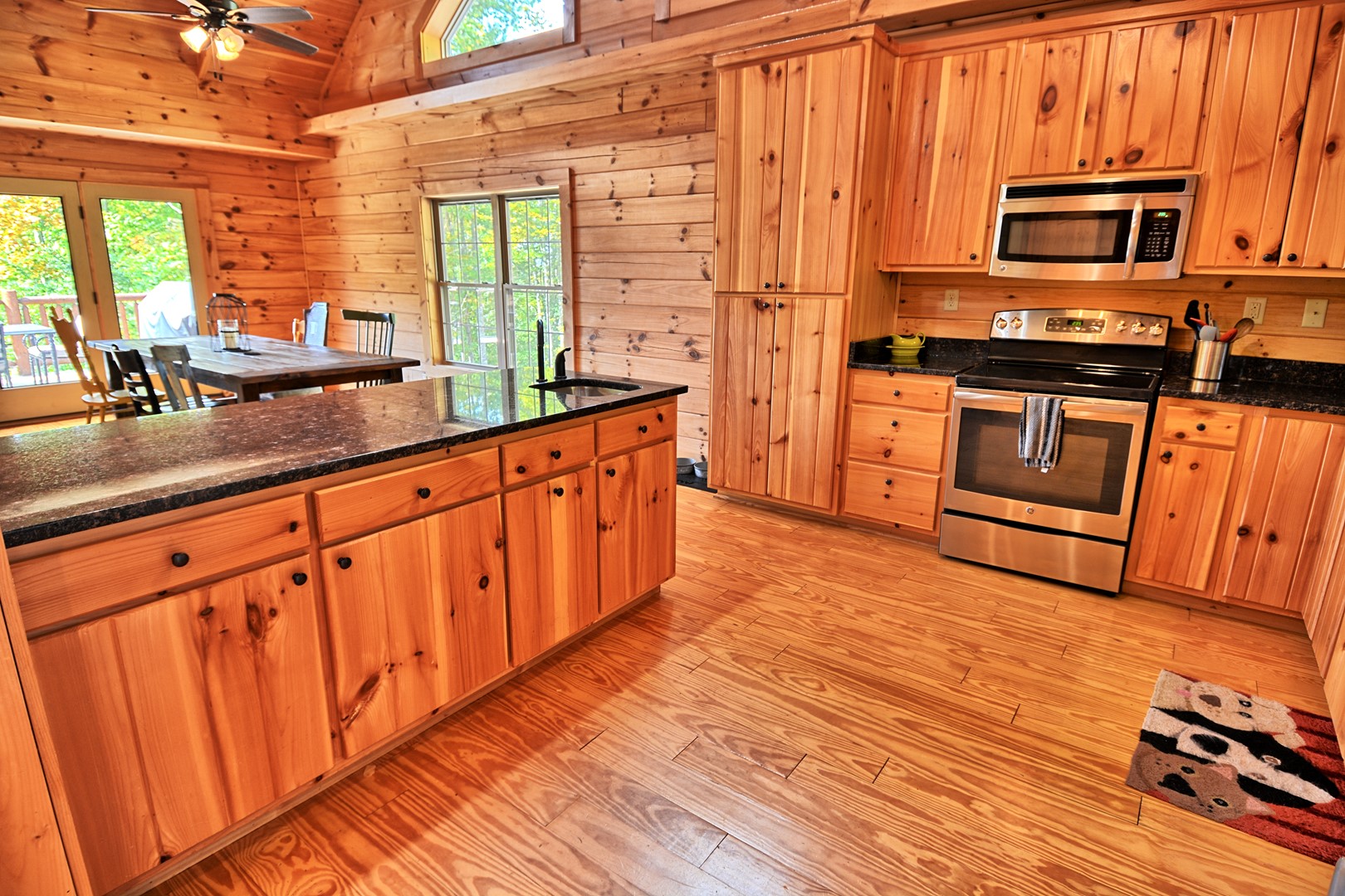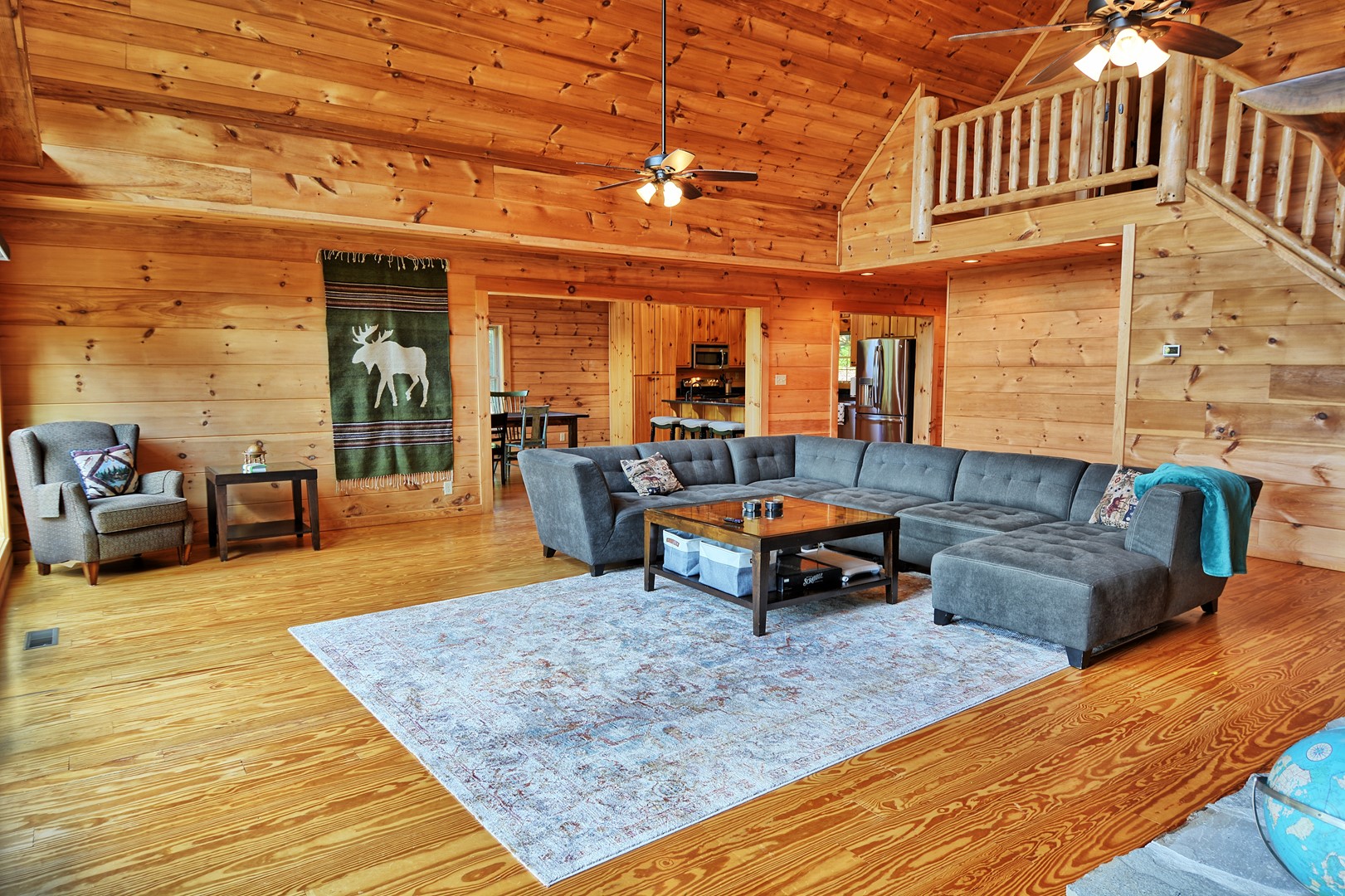 Indoor Living: 3 Smart TVs (no local channels-only streaming apps), gas fireplace (seasonal), dining table for 6 with additional seating for 3 at the bar, game room in basement w/ foosball table & electronic basketball game, books, laptop-friendly workspace, cathedral ceilings w/ floor-to-ceiling windows, ceiling fans and AC. There is a full size washer and dryer on the main floor.