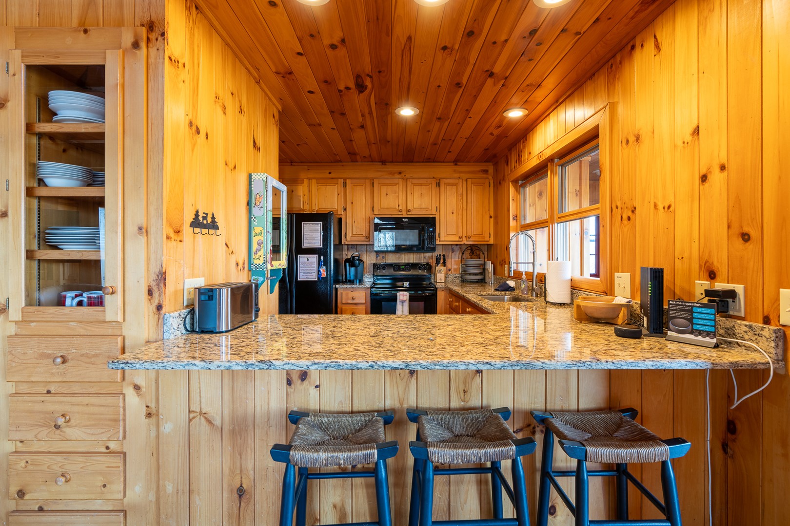 Our fully stocked kitchen with plenty of items to prepare a large meal has a dishwasher, microwave, regular coffee maker AND a Keurig maker, and more. There is a 2nd fridge just off of the dining room as well for your convenience. The dining room can seat up to 12 guests and there is additional seating at the bar in the kitchen area and a pub table that can seat 4.