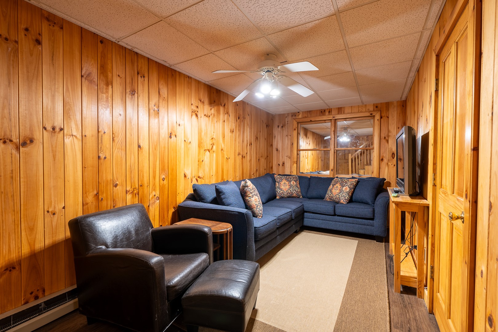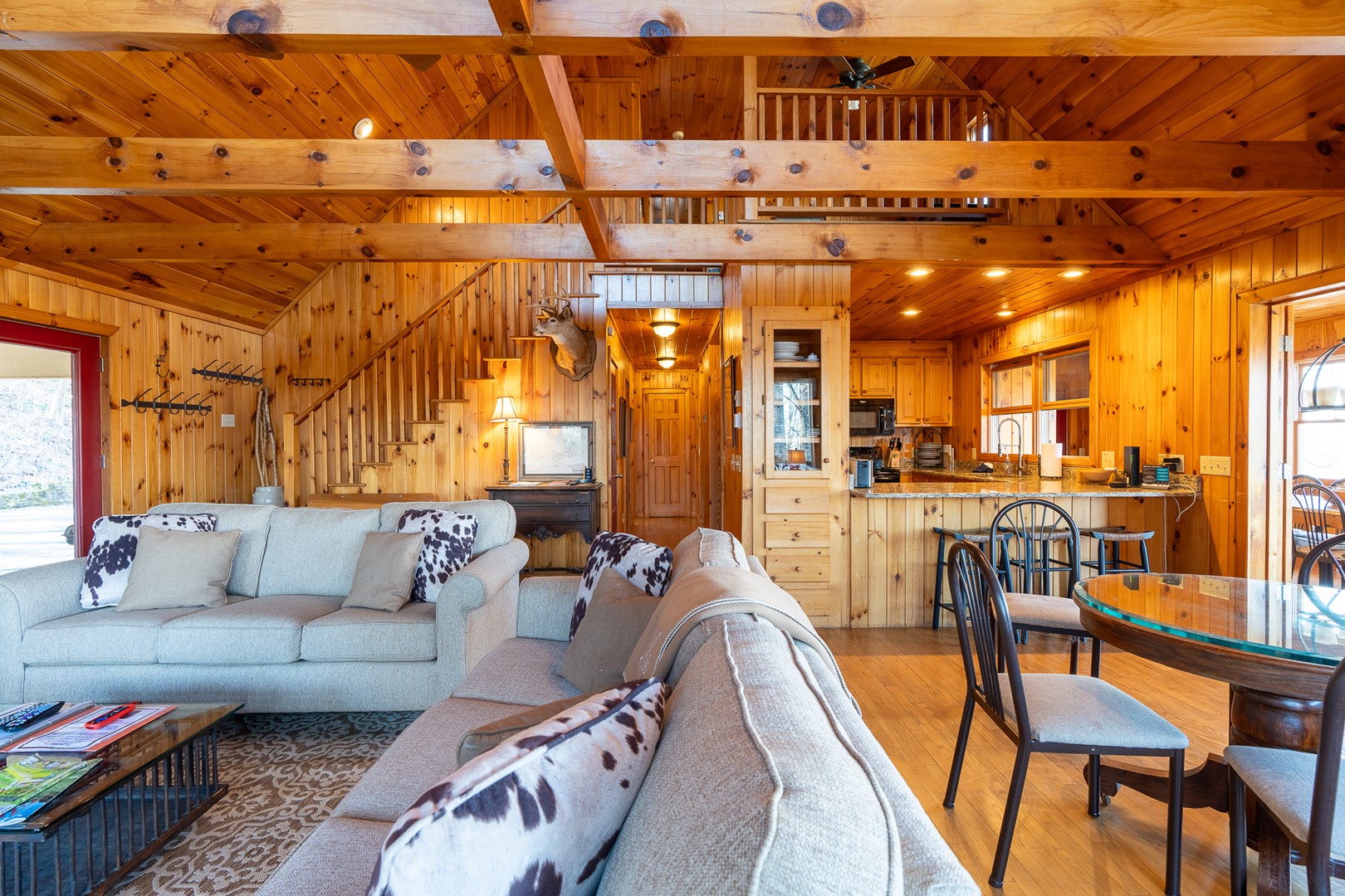 **Main Floor: The living room has 2 full size couches, 4 chairs for plenty of seating, and a Roku TV. Plus, there is a nice and cozy wood burning fireplace/stove to use during those cold mountain winter nights.