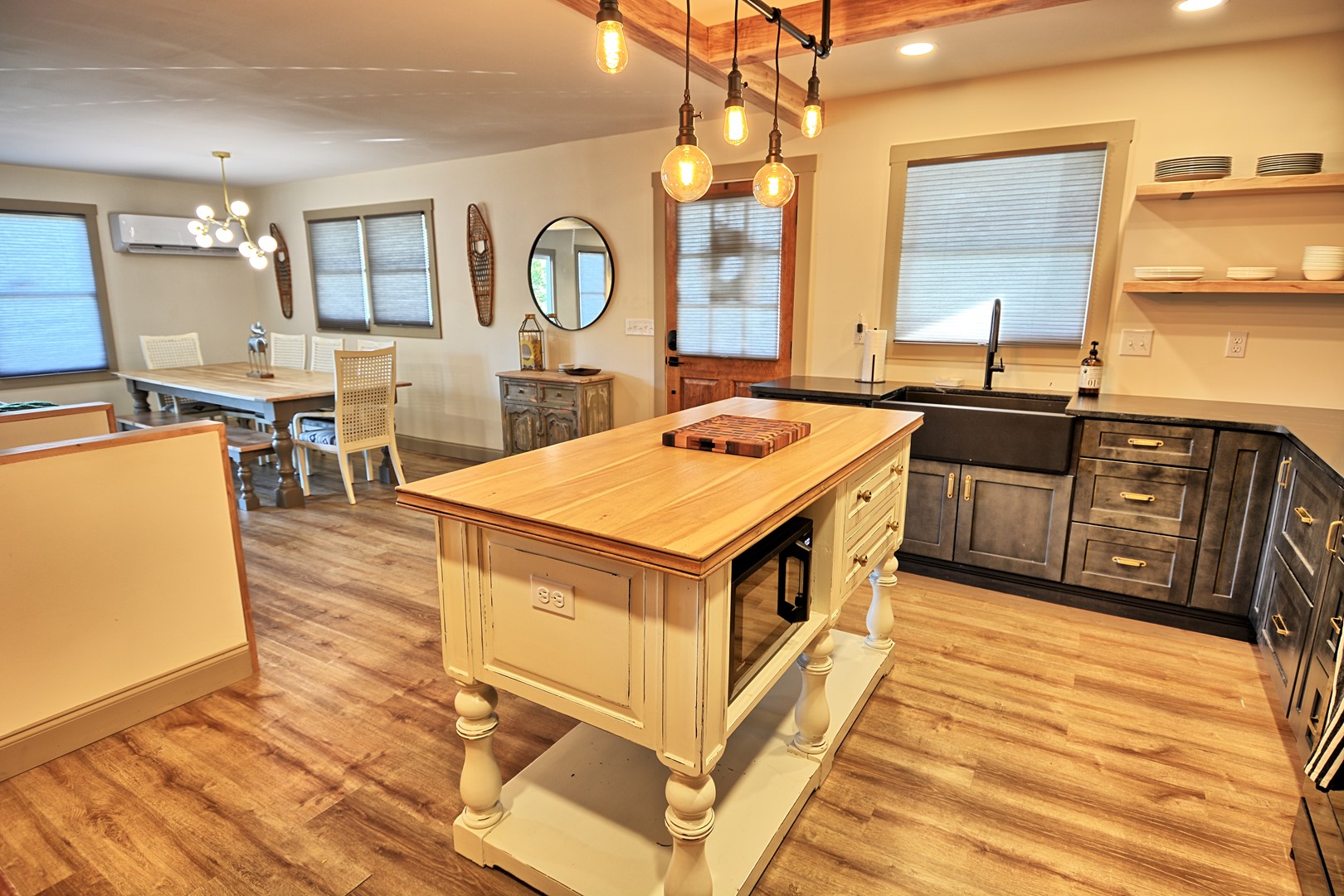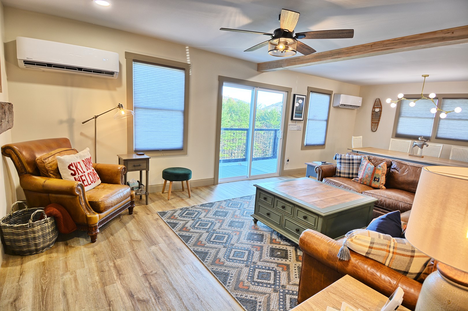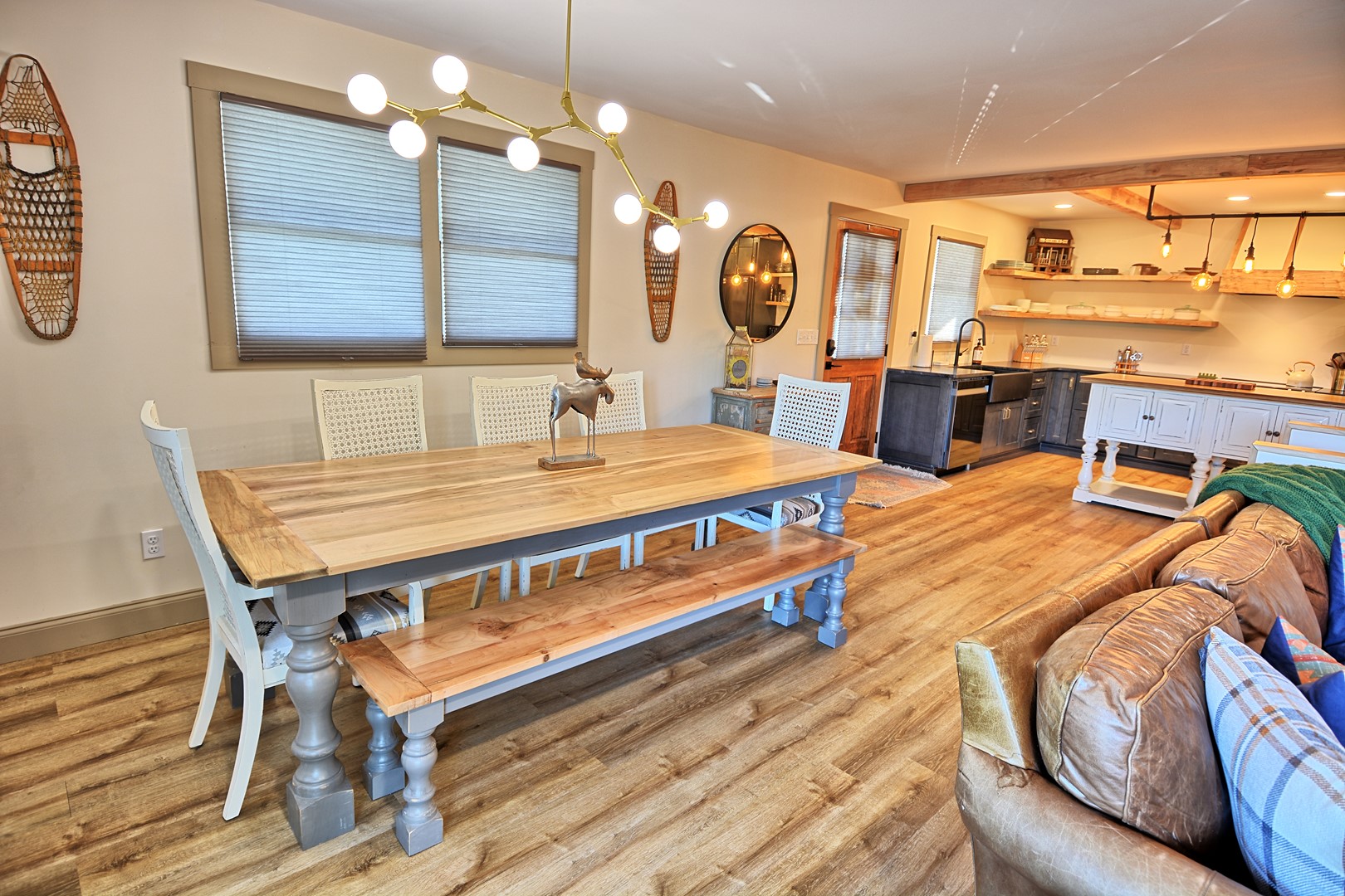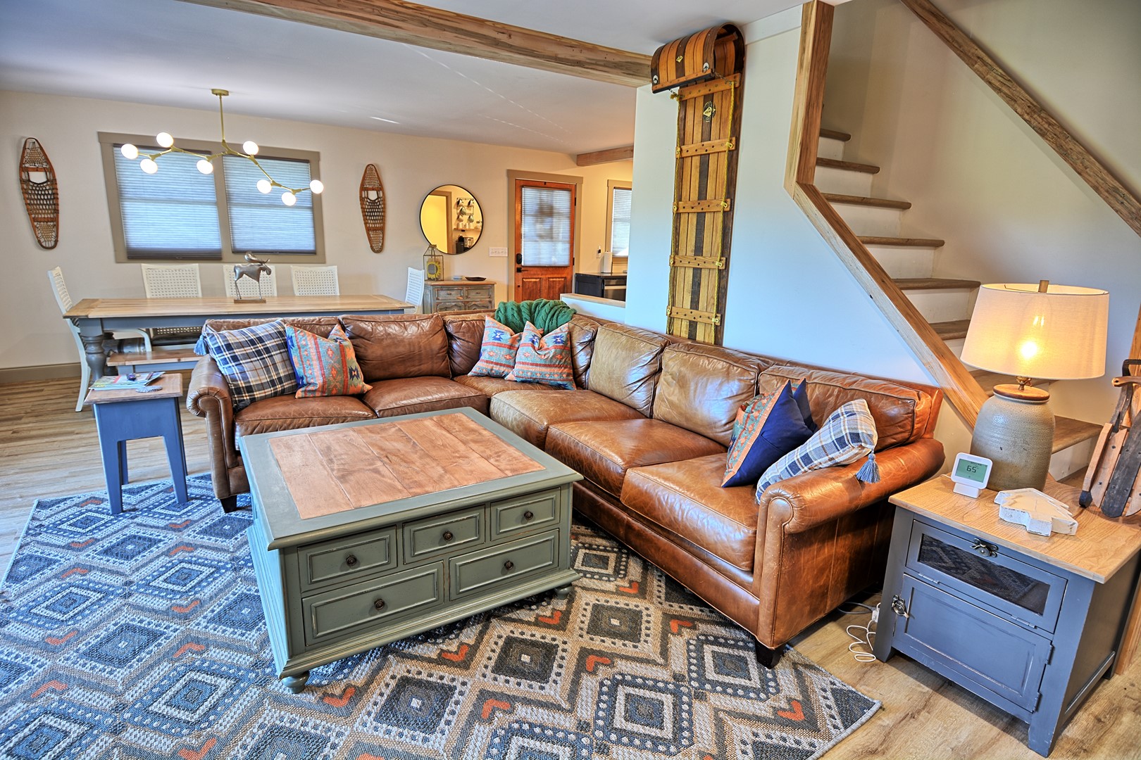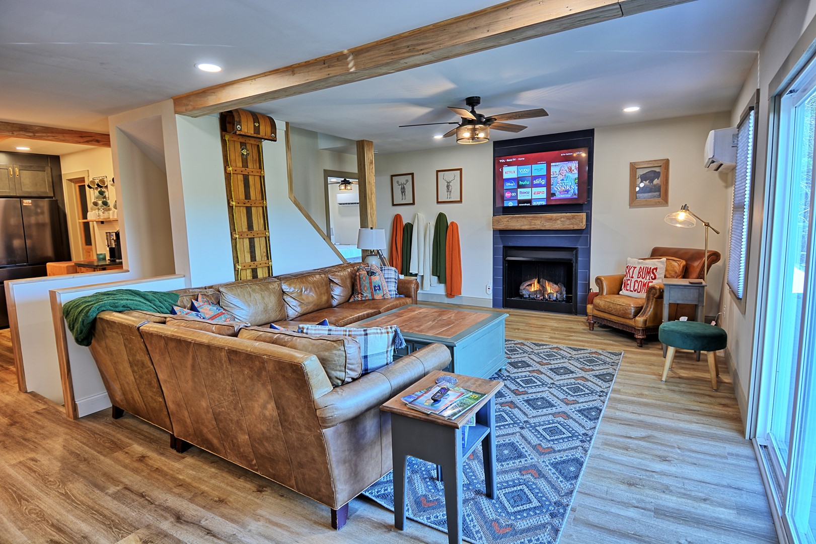 Inside: As you enter, you’re greeted with an open floor plan. The living room boasts comfortable seating with a leather sectional, gas fireplace (seasonal), Roku TV with streaming apps (you will need to use your login information), and doors that will lead to the outside deck. The living room and dining area has a great mini-split ductless heating and AC for year round comfort.