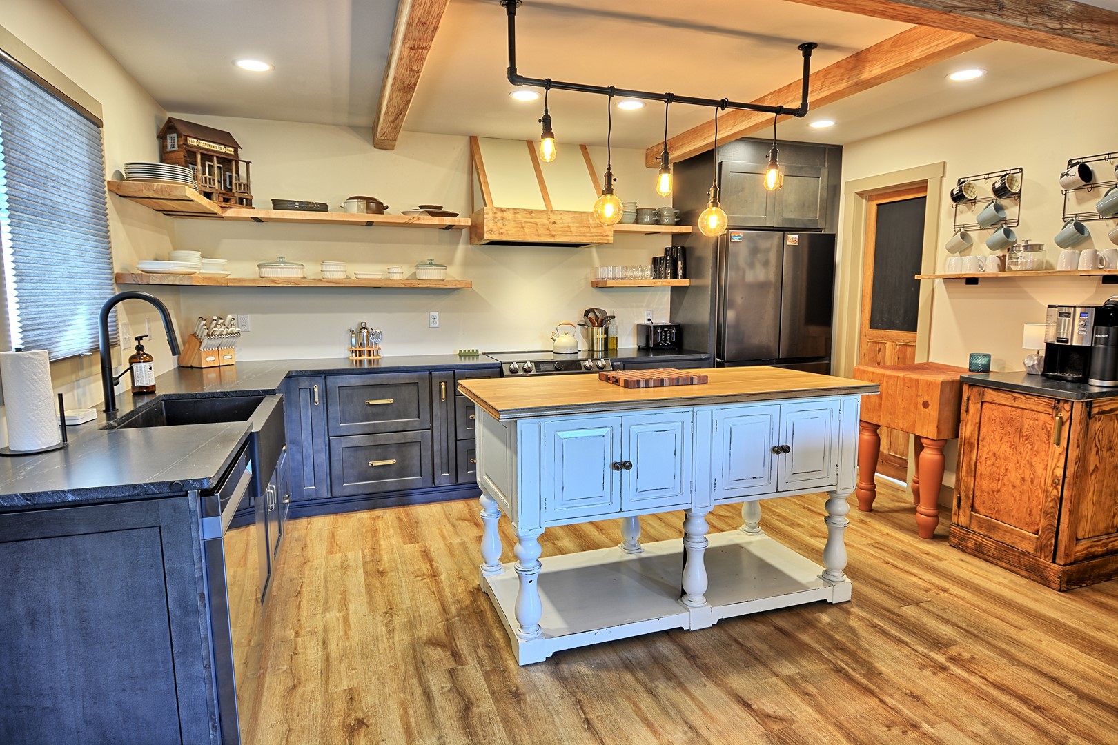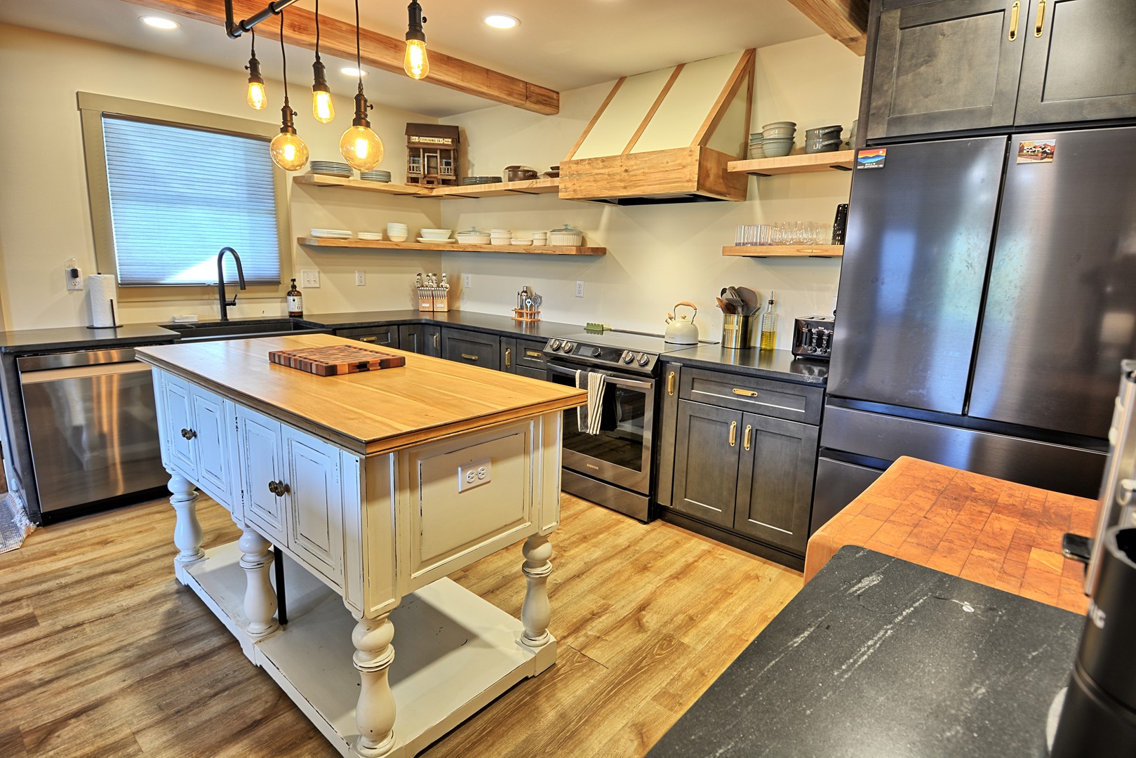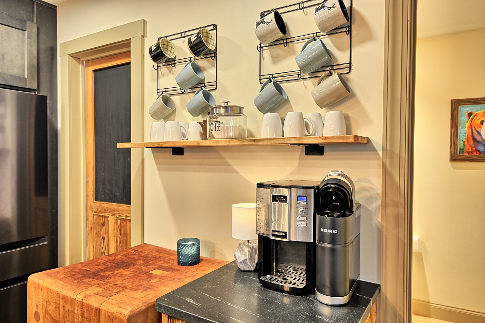The beautiful, modern, and spacious fully stocked kitchen has the modern conveniences such as a dishwasher, Keurig maker, regular coffee maker, fridge with ice maker, electric oven, cookware, dinnerware, stone countertops, large pantry and almost everything needed to prepare a meal. The dining area can accommodate up to 8 guests.