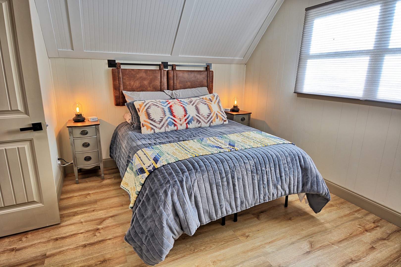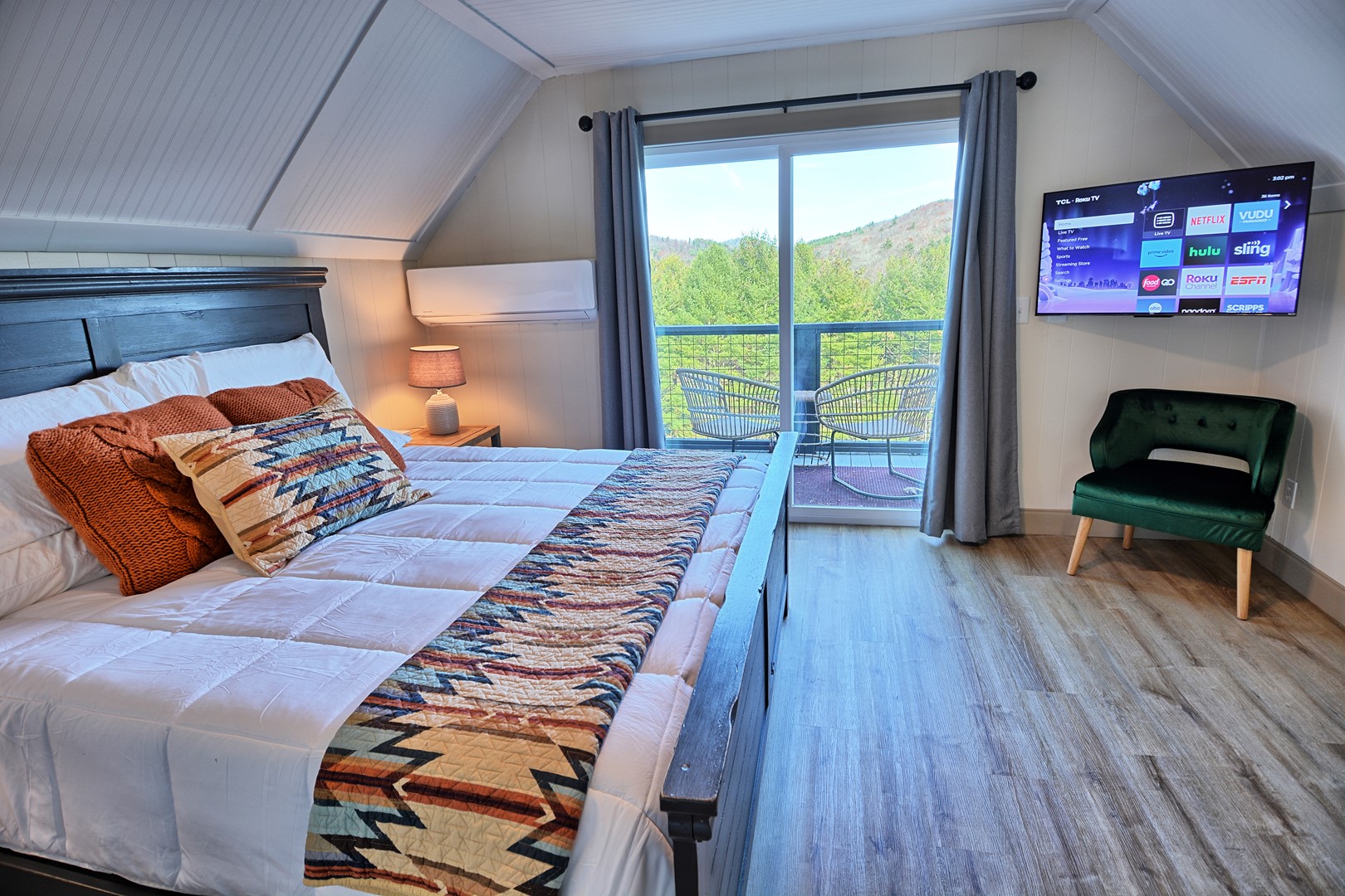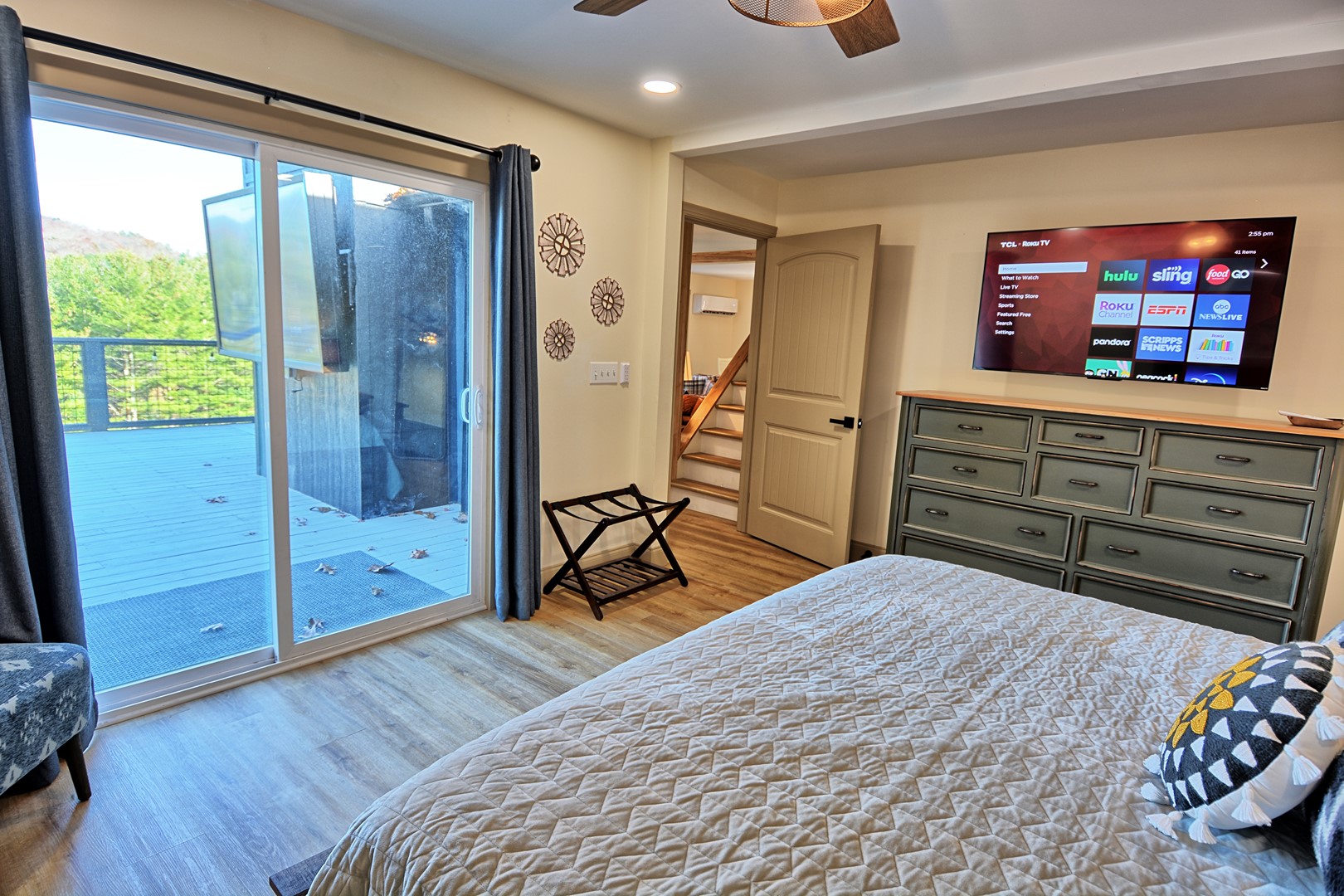 Upper Floor: There are 2 bedrooms on the upper floor. One bedroom boasts a king size bed with doors to a private deck with seating, Roku TV and mini-split with heat/AC.