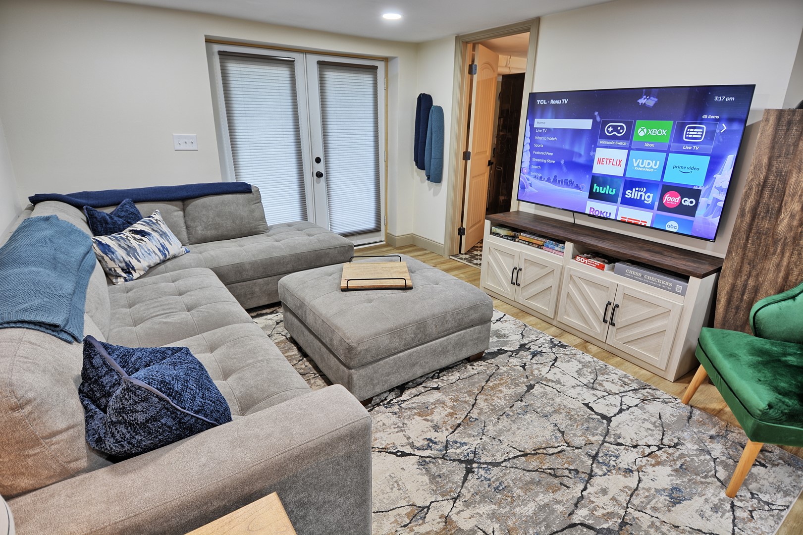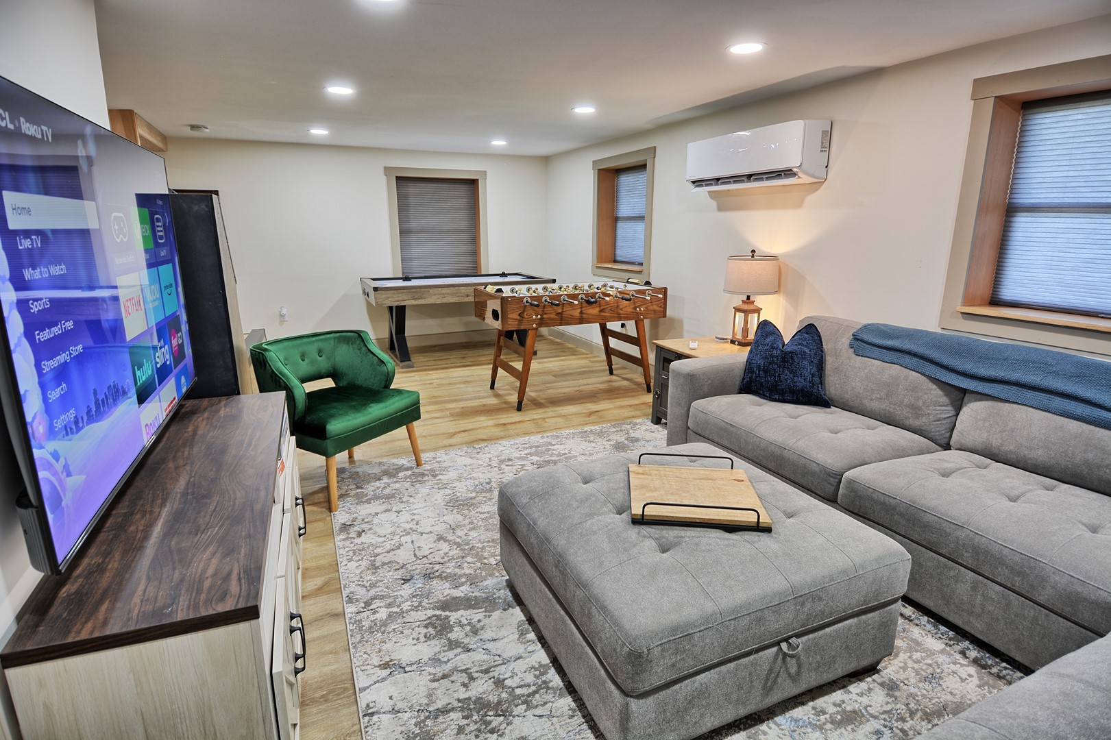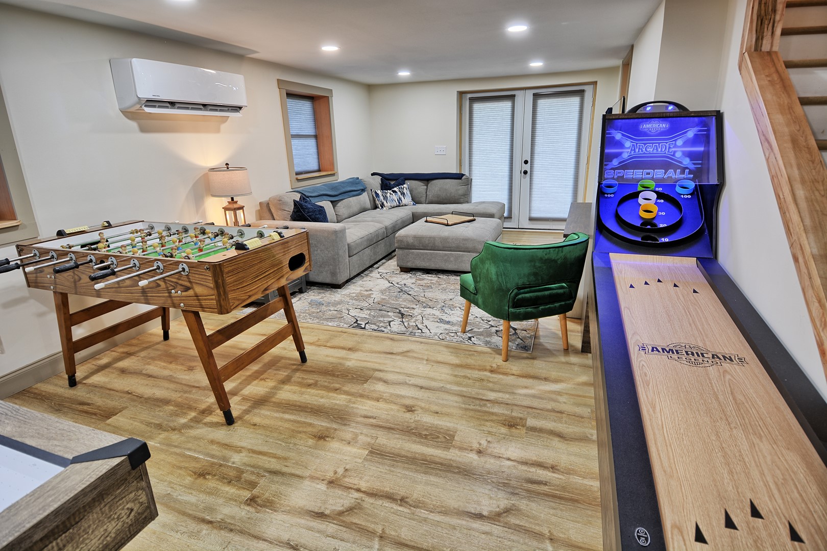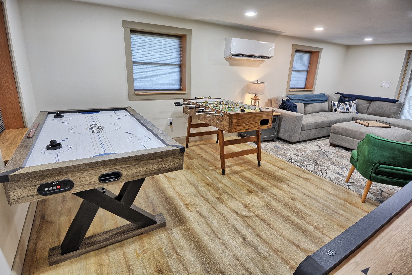 Lower Level: The entire family will enjoy spending time in our game room with a Skee-ball game, Foosball, and air hockey. Plus, there is a game table to play board games or cards. There is a 65” flat screen Roku TV and a sectional for entertainment.