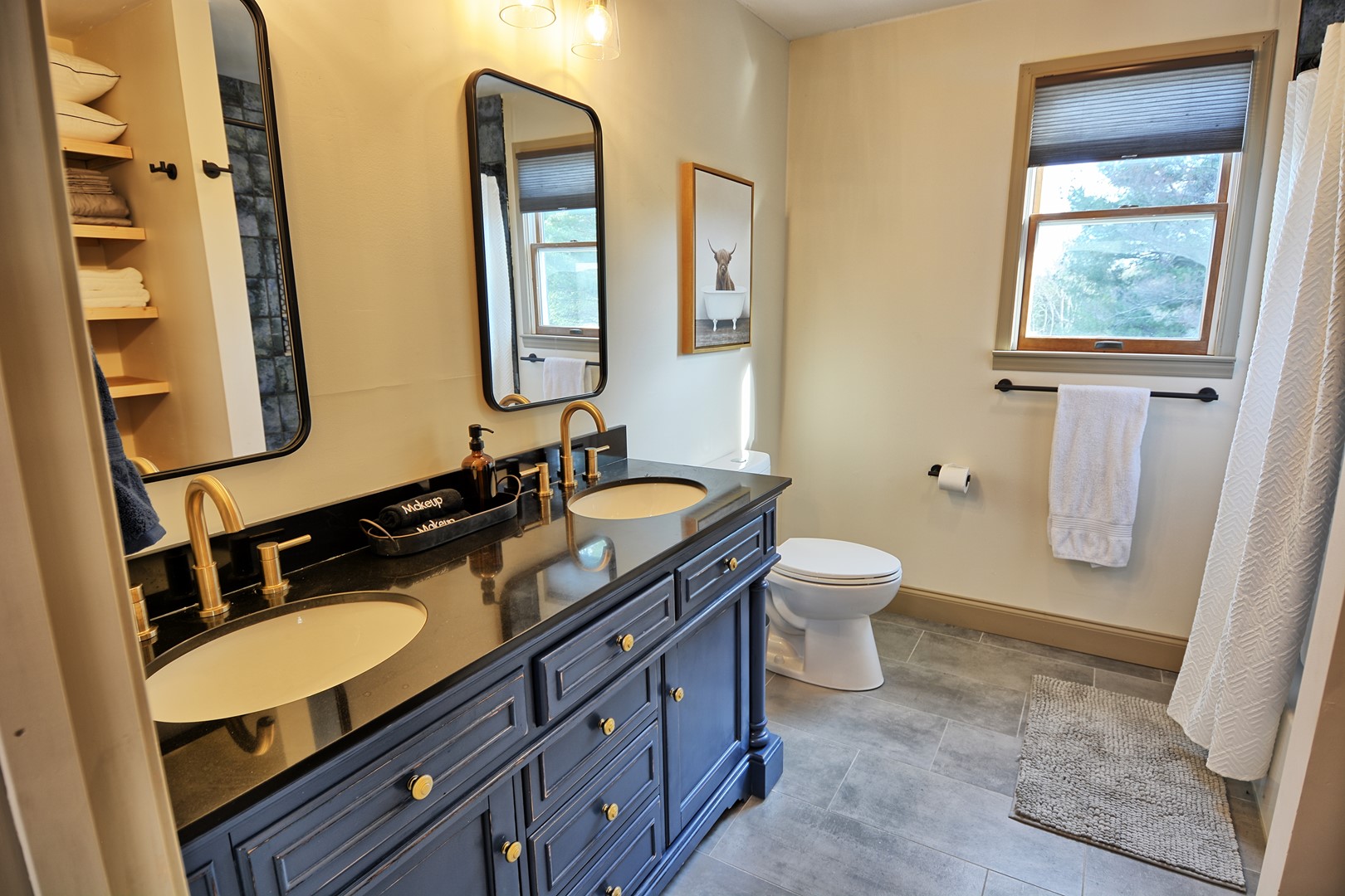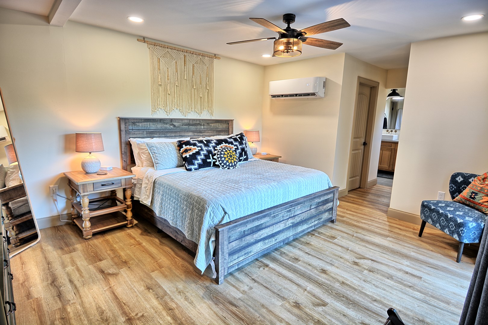 The master bedroom is on the main floor. The master suite offers a king size bed, Roku TV, mini-split heat/AC unit, doors that go onto the deck with the 80” flat screen TV, and En Suite bathroom with step-in tile shower, double vanity sinks and a private room with a toilet.