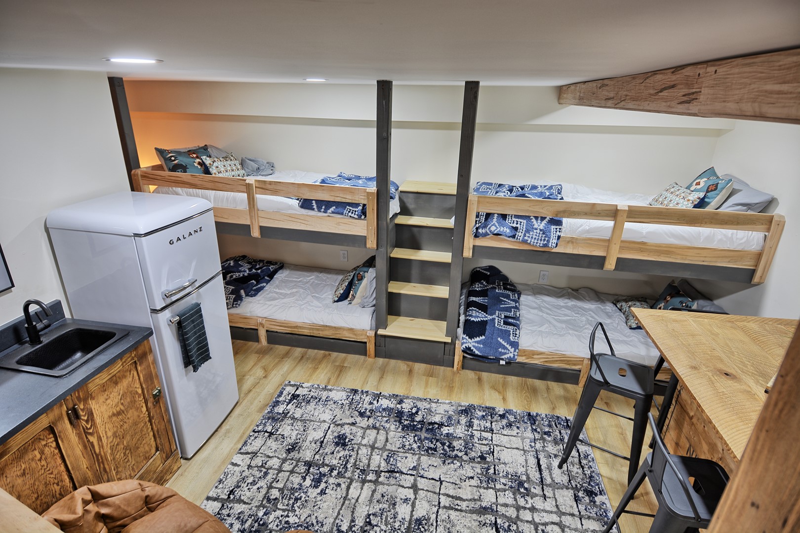 There are 2 sets of built in bunk beds (twin over twin) for additional sleeping, a refrigerator and a sink.