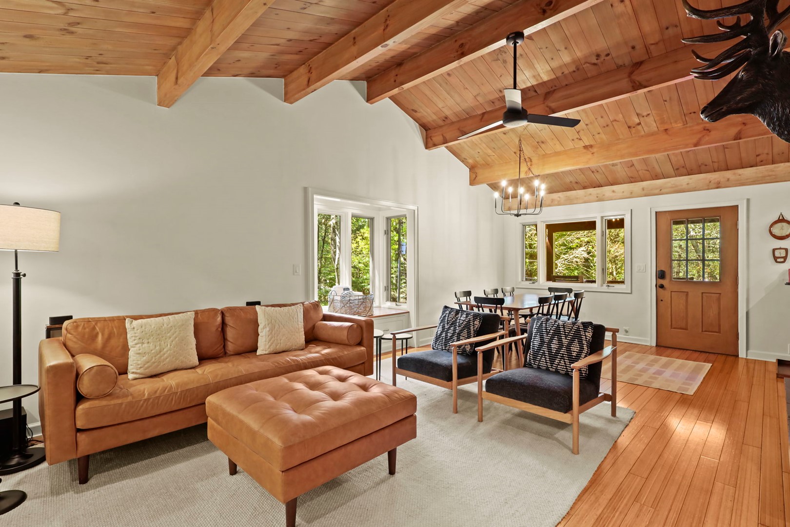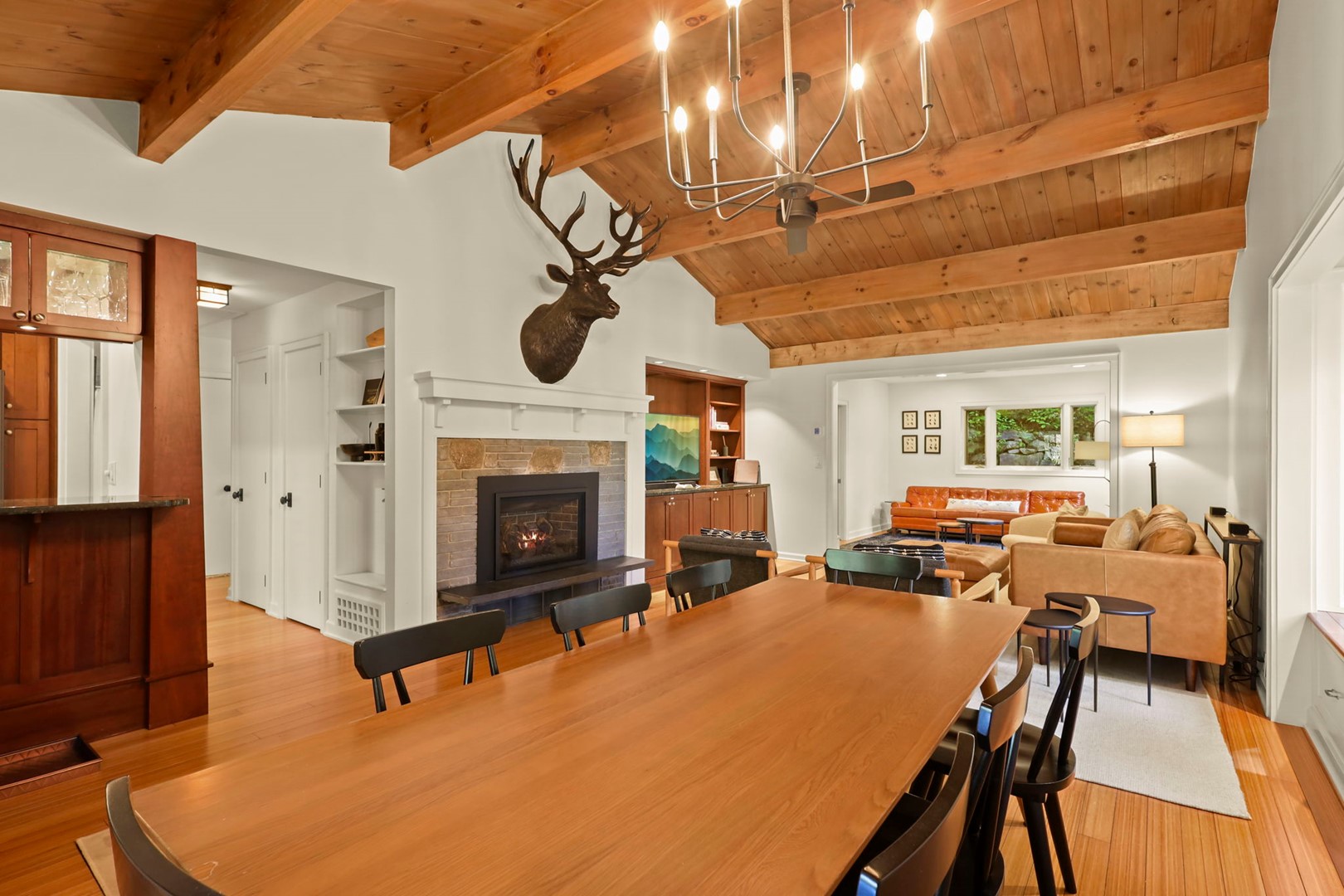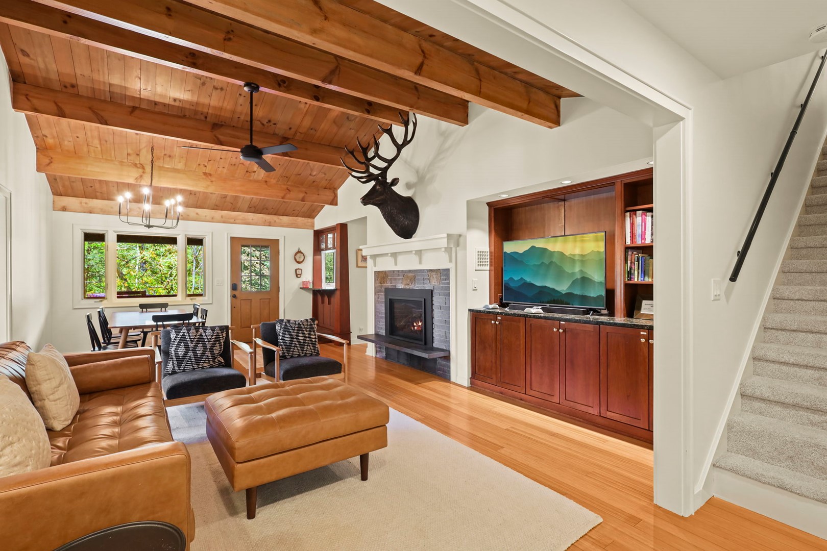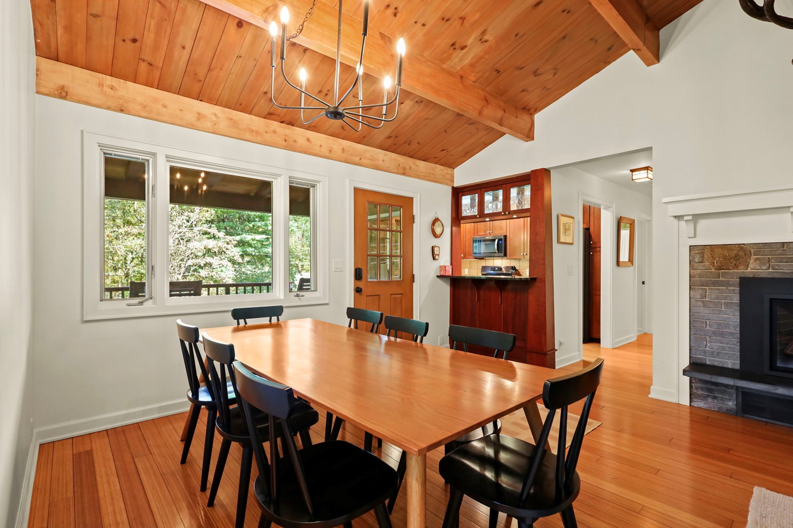 - Living Room: Hardwood floors, vaulted tongue-and-groove ceilings with exposed beams, a gas fireplace (seasonal), and Smart TV with Hulu Live TV, Disney and Netflix (owner account).