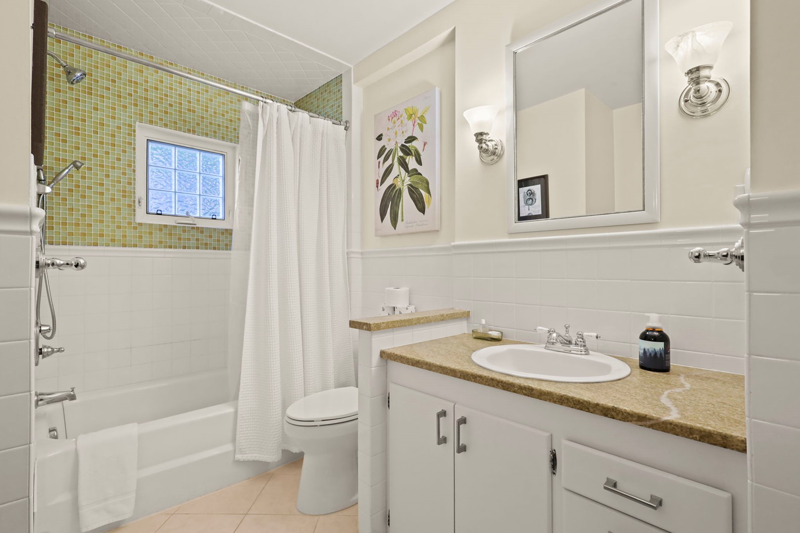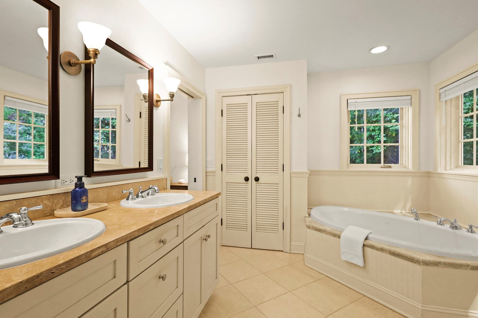 - Master Suite (upstairs): King bed, and Smart TV with Hulu Live TV, Disney and Netflix, vaulted ceilings with skylights, and a private ensuite bathroom with jetted tub, walk-in shower, and double vanities.