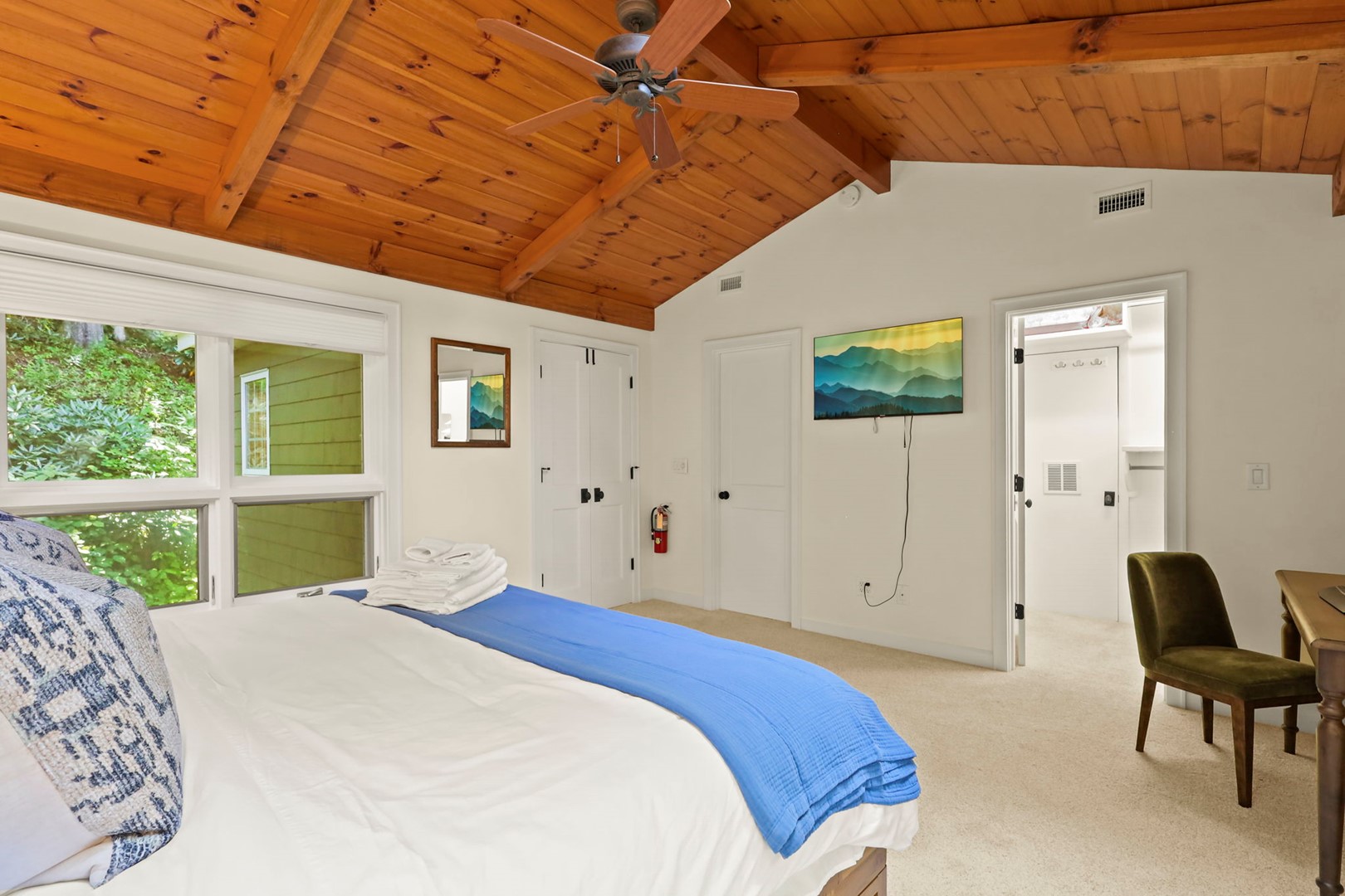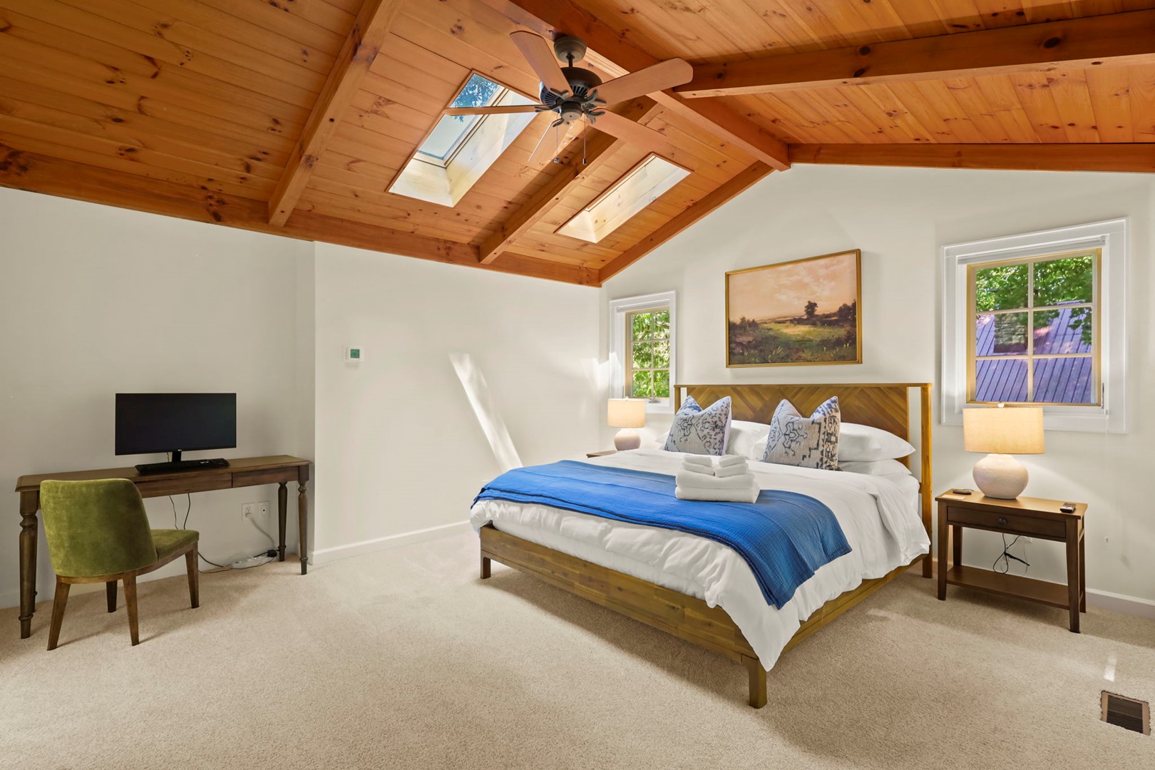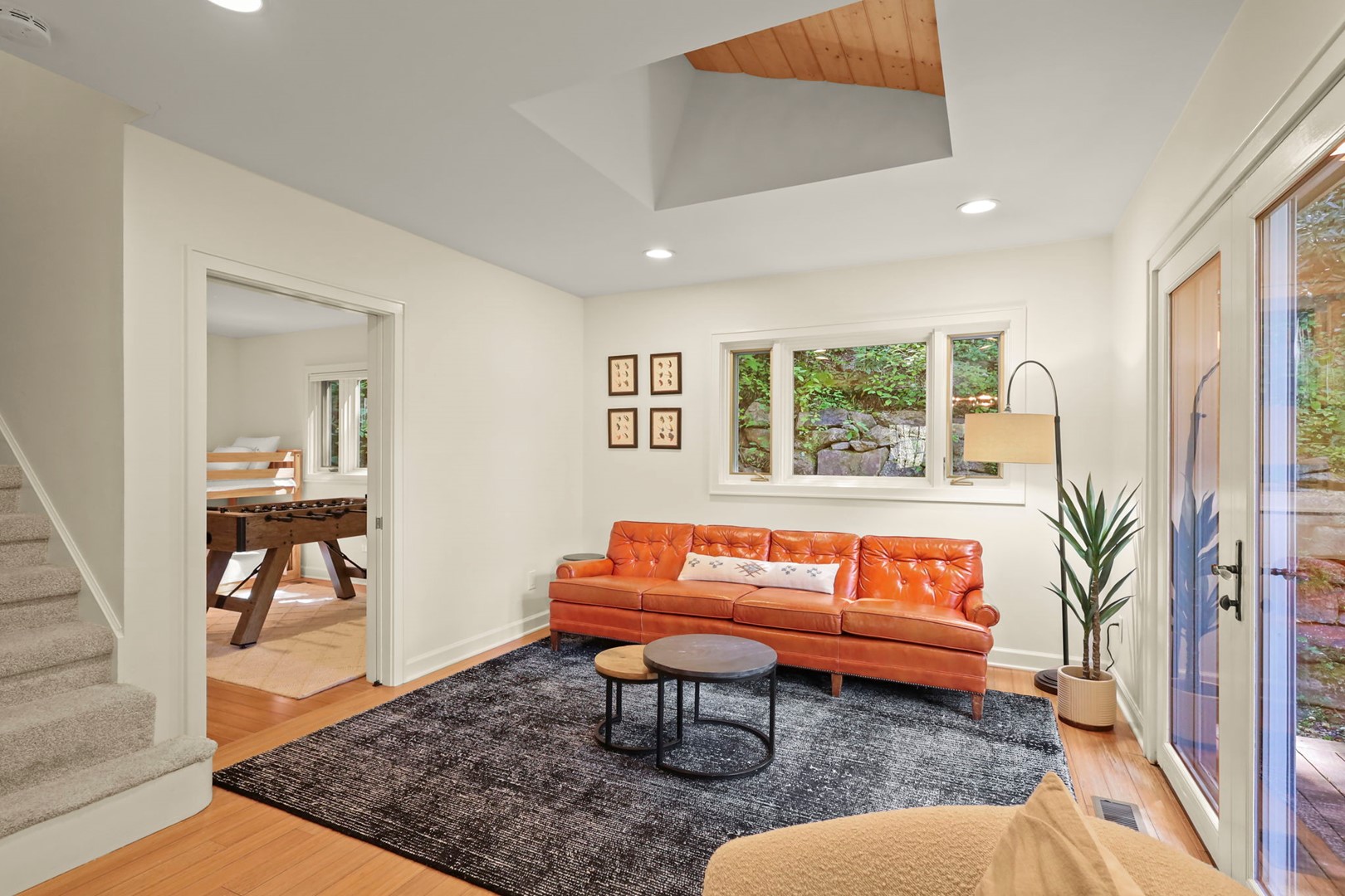 - Sitting Room: Skylight and large window with cozy seating—perfect for reading or relaxing. French doors lead to the side deck.