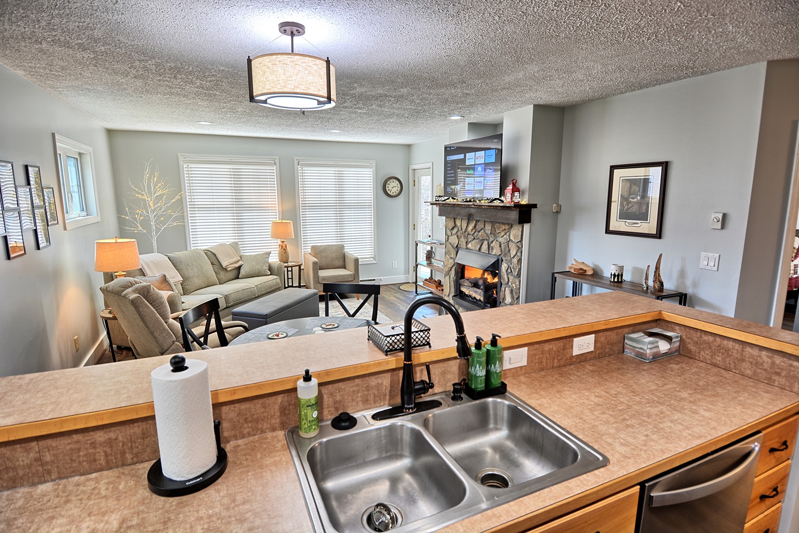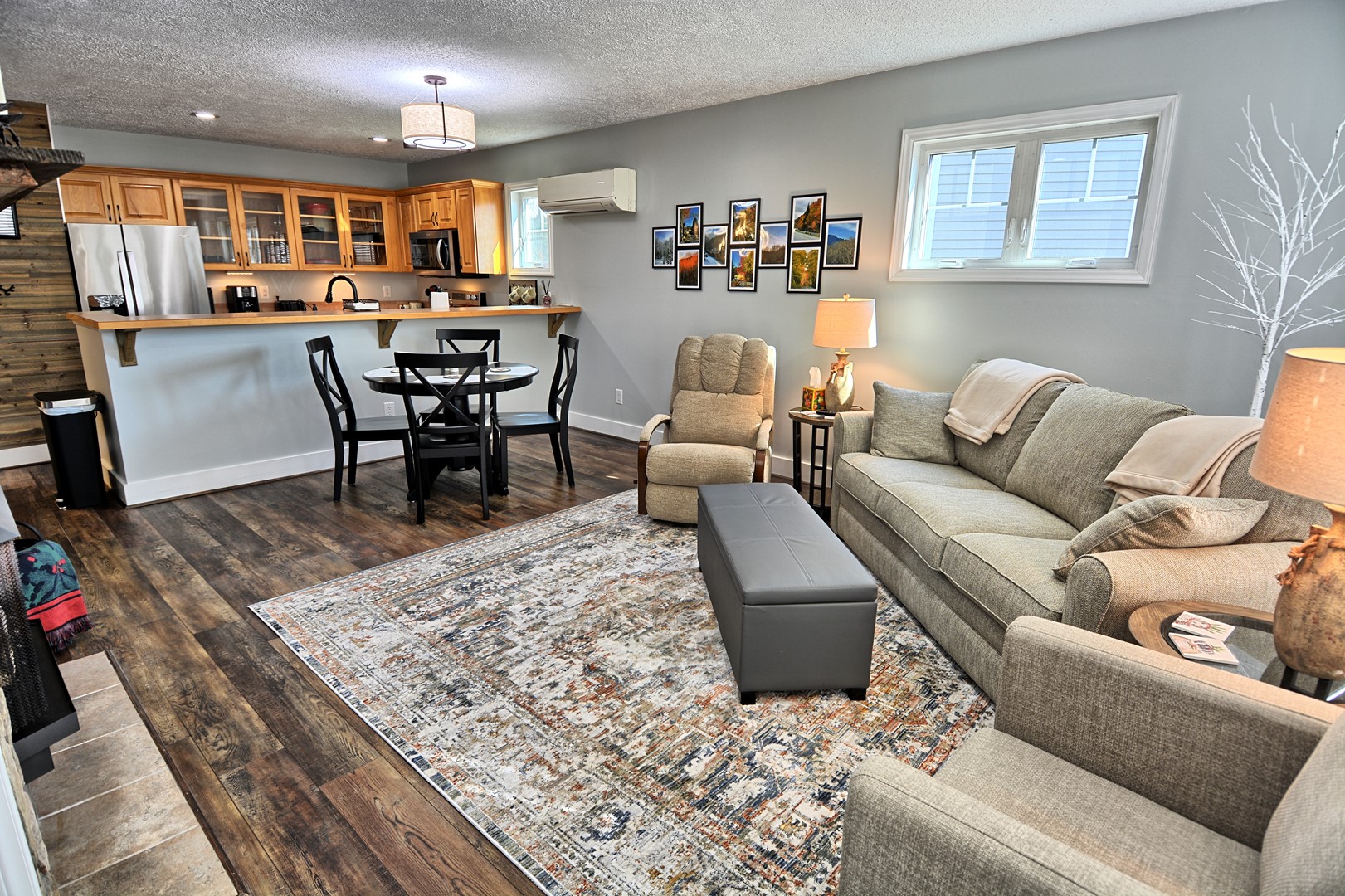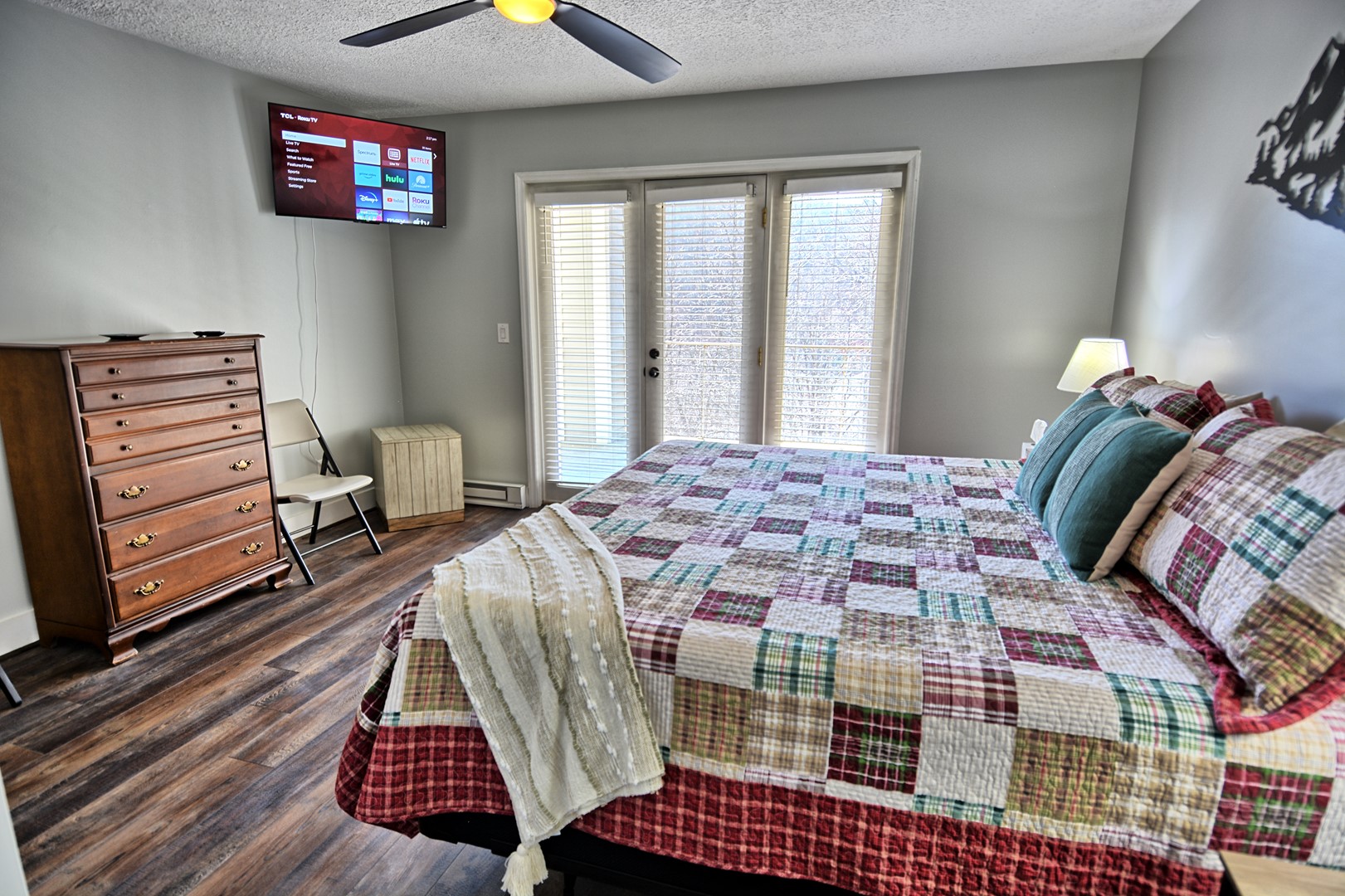 INDOOR LIVING: 3 Roku TVs with Spectrum cable, modern bathrooms, seasonal gas fireplace (Oct. – April), hardwood floors, spacious