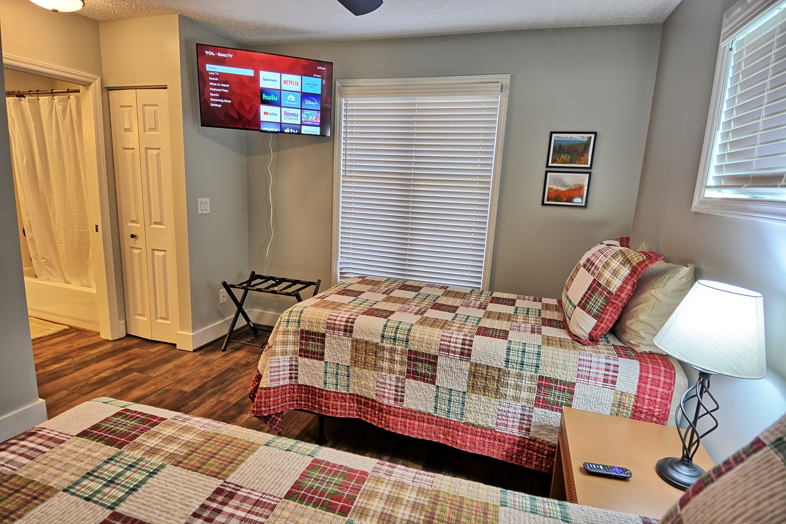 Bedroom 1: King Bed with En Suite bathroom, Roku TV | Bedroom 2: two twin beds with En Suite bathroom, Roku TV