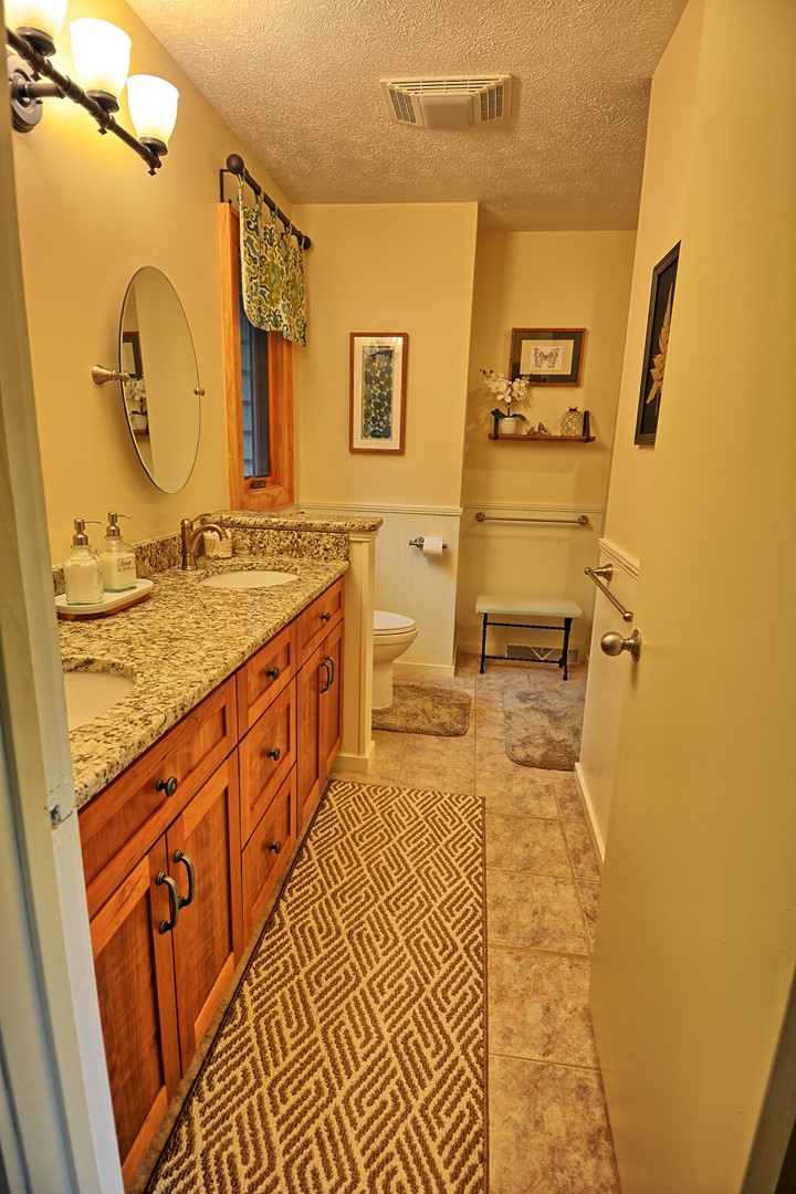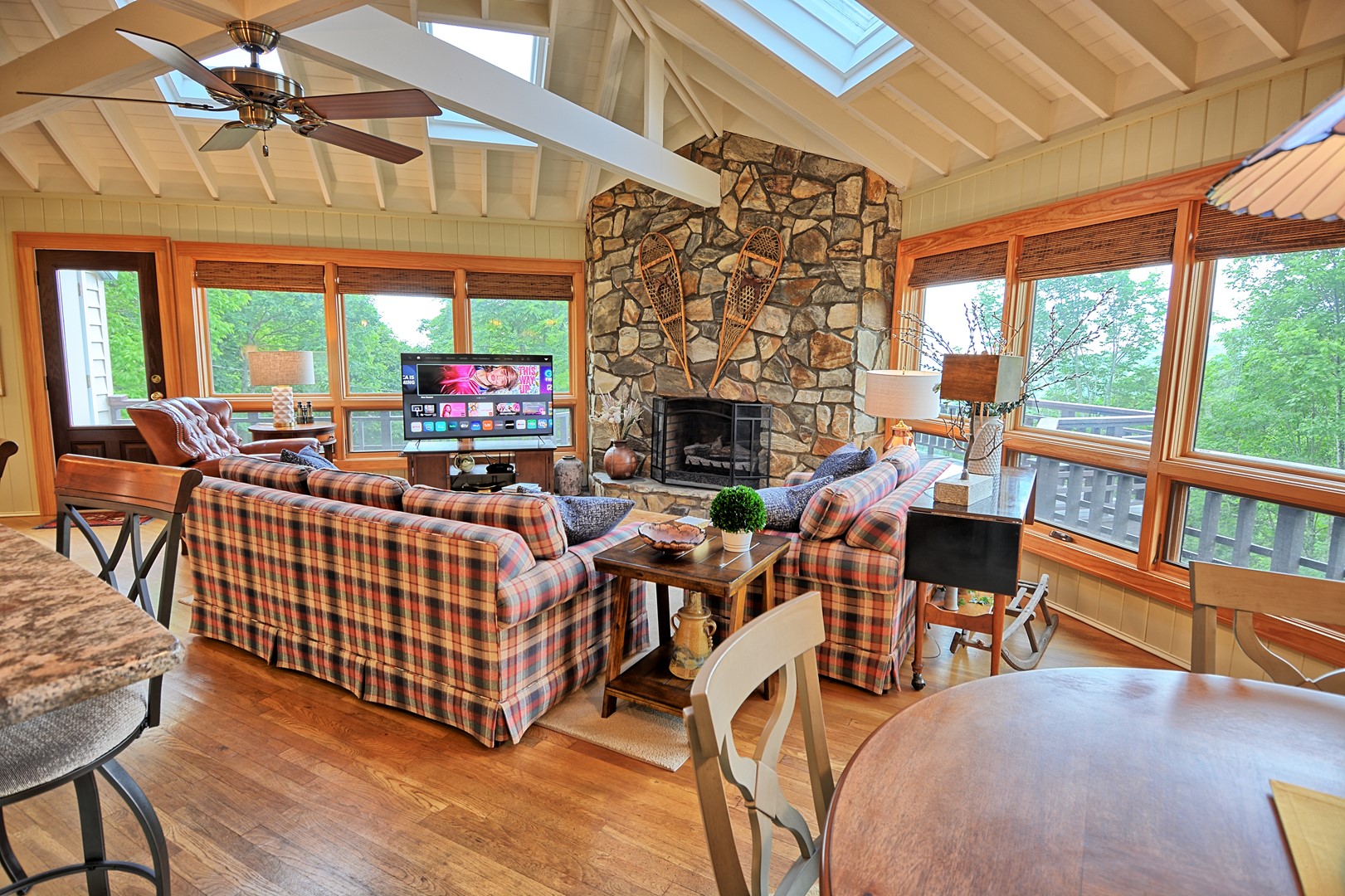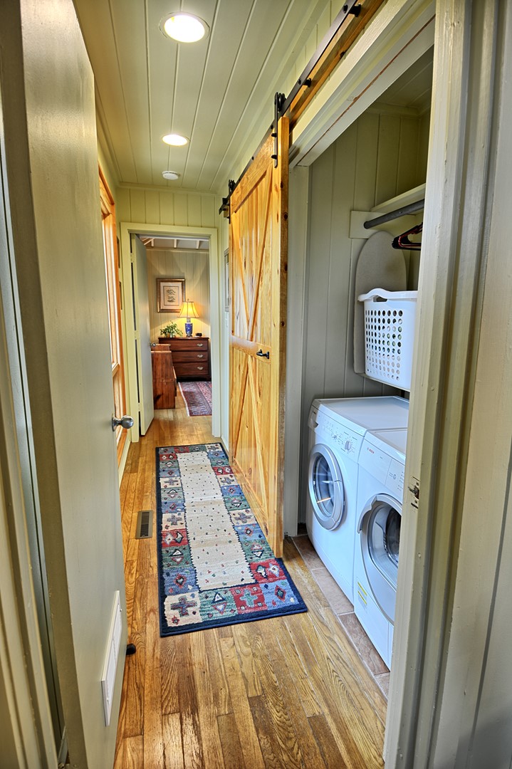 There is plenty of seating in the living room that has a gas fireplace (seasonal-Oct. 1 - April 1) and a Smart TV (streaming apps only), sky lights and 2 walls of windows for natural lighting. The beautiful and well stocked kitchen is ready for you to prepare your favorite meal. The kitchen offers granite counter tops, stainless steel appliances, dishwasher, regular coffee maker, Keurig, toaster oven, microwave and etc. with wood floors throughout the home. The dining table can accommodate up to 4 guests. Everything is located on one easy access level including the washer and dryer. Access to our cabin is all paved and the level parking area is paved for a maximum of 3 vehicles.