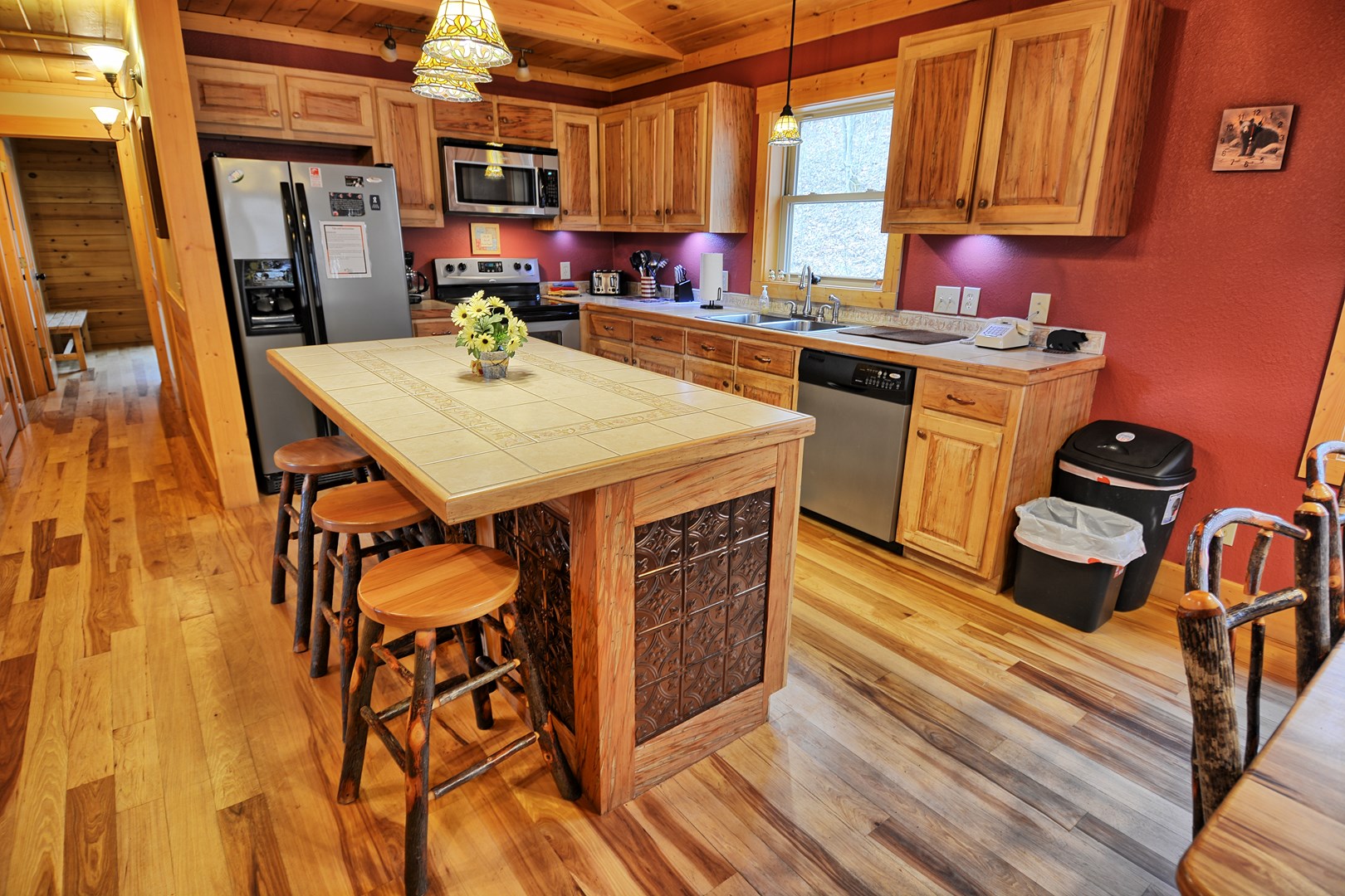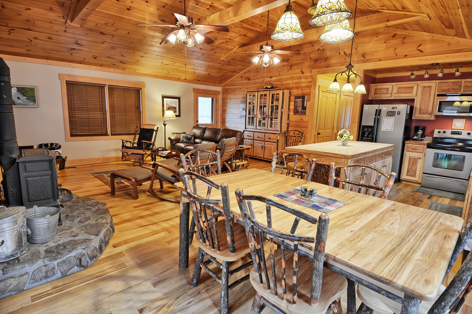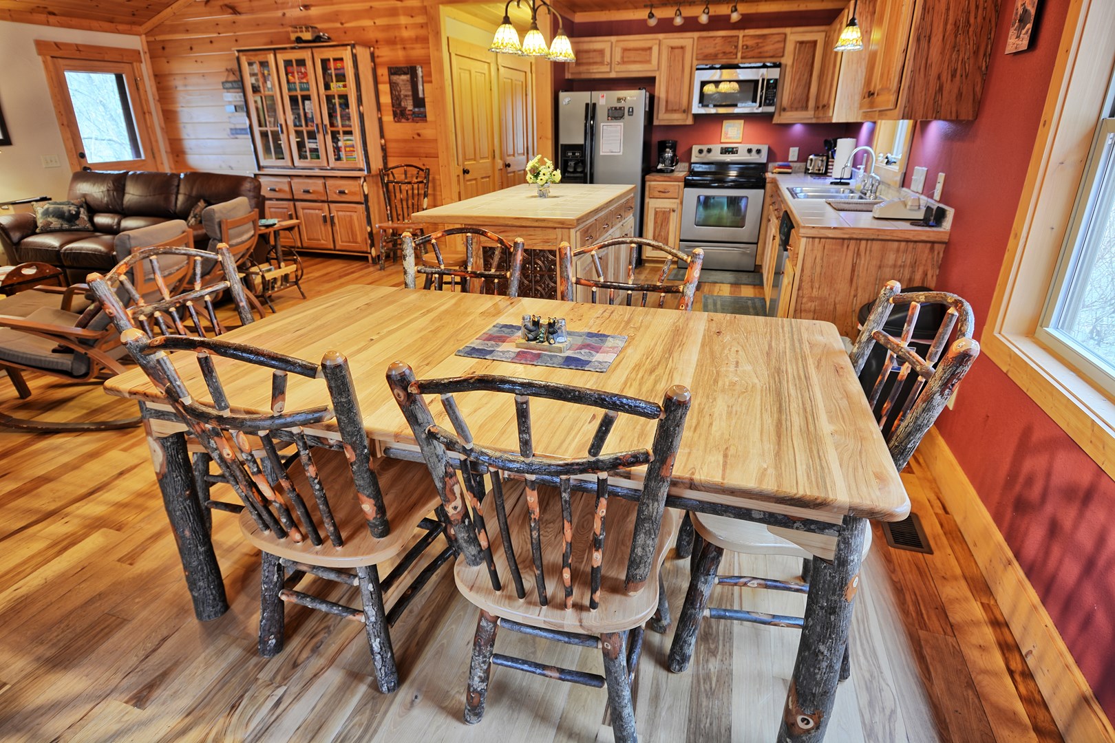 Inside you will find this beautiful cabin decorated in beautiful log cabin style. The kitchen is fully stocked with most everything you need to prepare your favorite meal. The dining table is hand crafted and enough seating for up to 8. There are more seating room at the island bar.