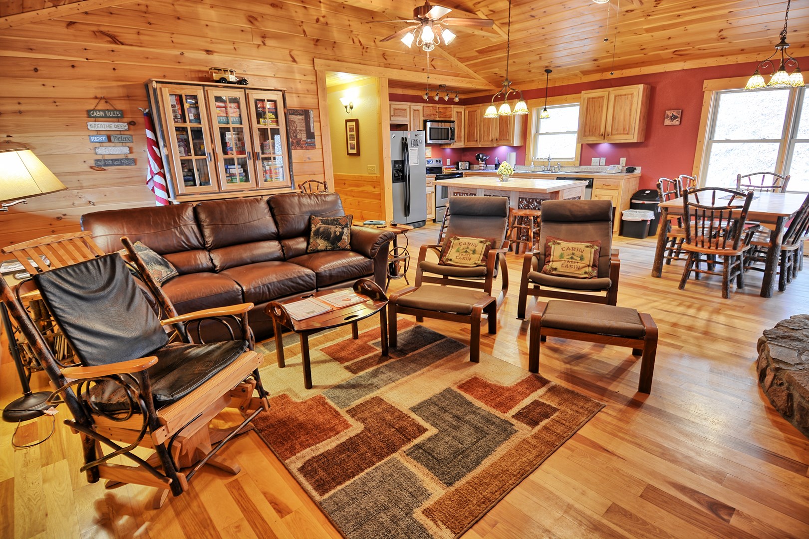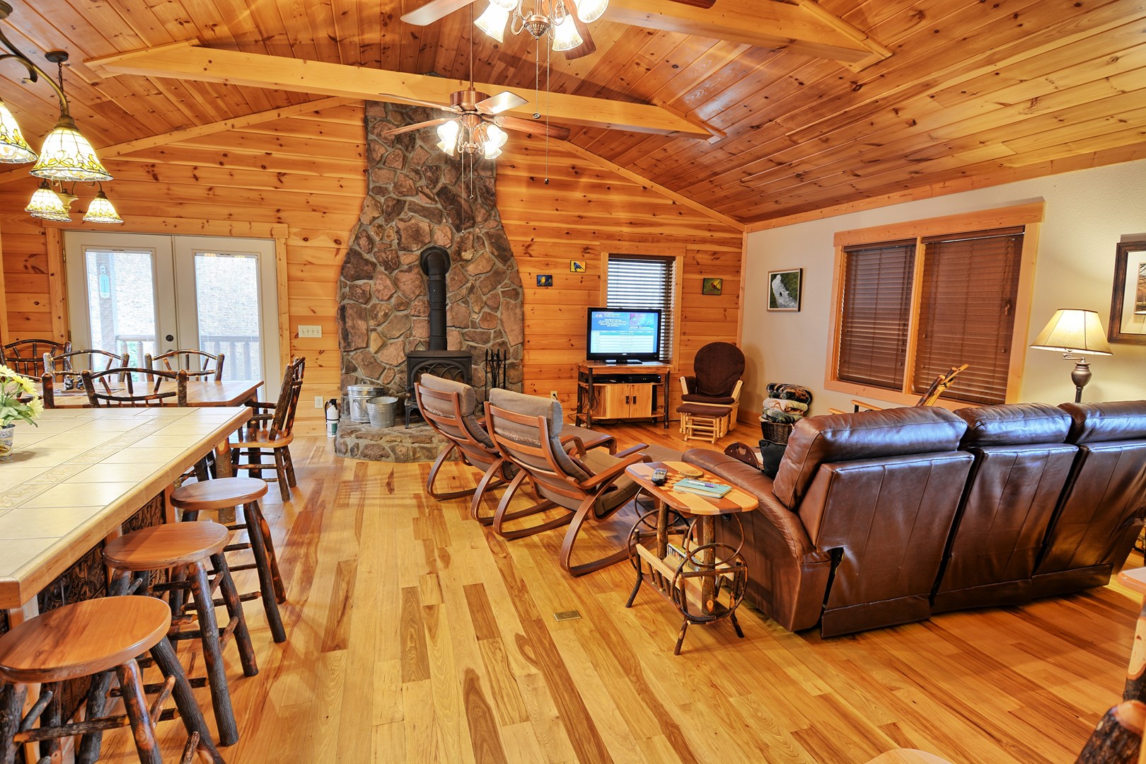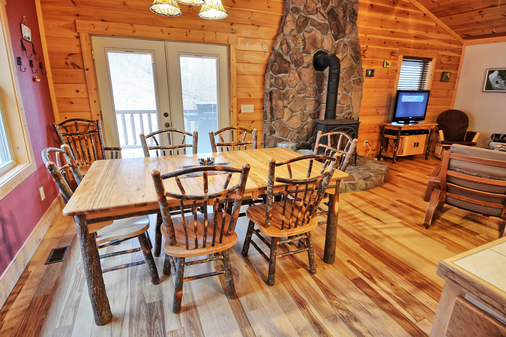 Inside you will find this beautiful cabin decorated in beautiful log cabin style. The kitchen is fully stocked with most everything you need to prepare your favorite meal. The dining table is hand crafted and enough seating for up to 8. There are more seating room at the island bar.