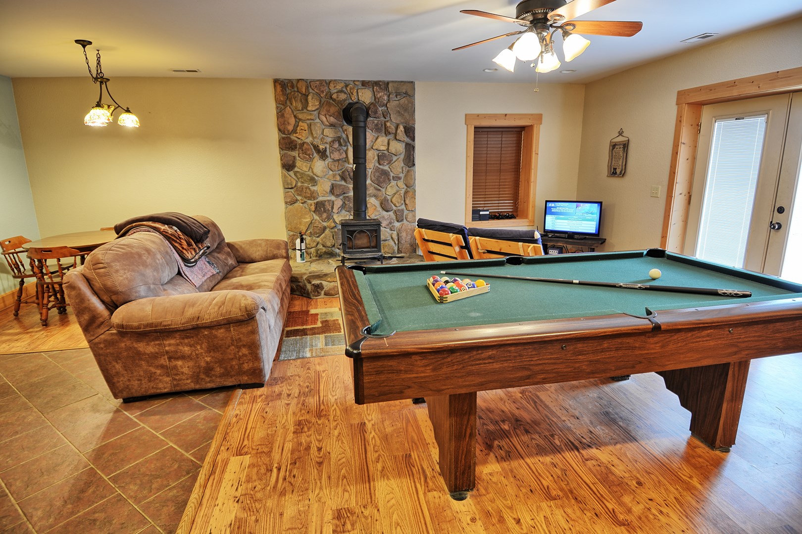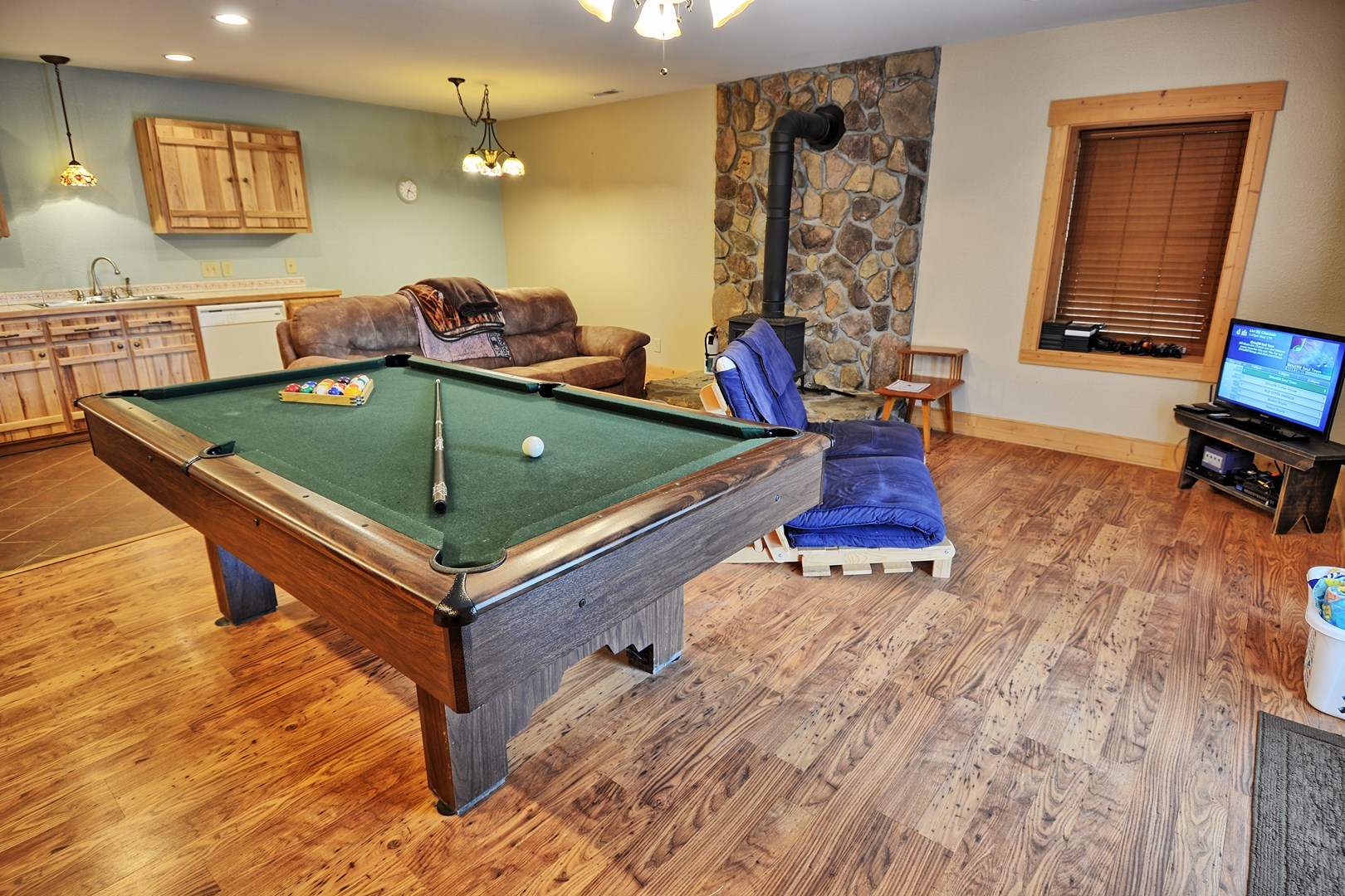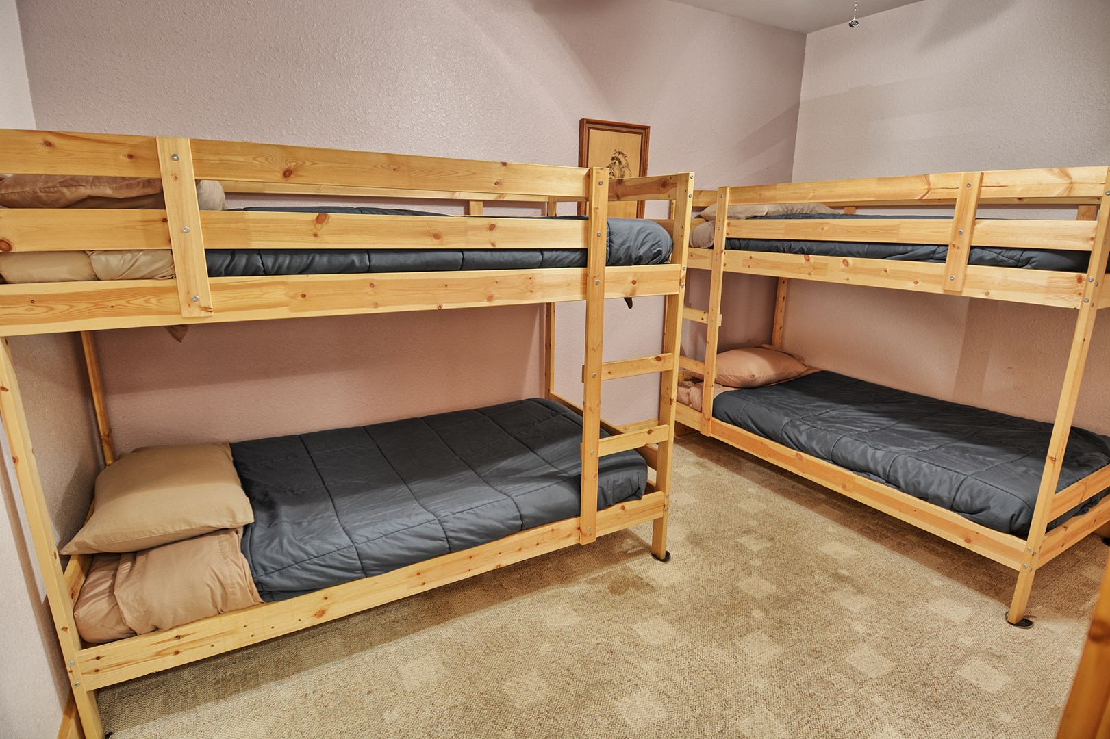 There are 2 more bedrooms on the lower level. One bedroom offers a queen size bed and the other bedroom has 2 sets of bunk beds for the kids. There is also a wood burning stove and satellite TV on the lower level as well. The 2nd Roku TV is in the family/game room.