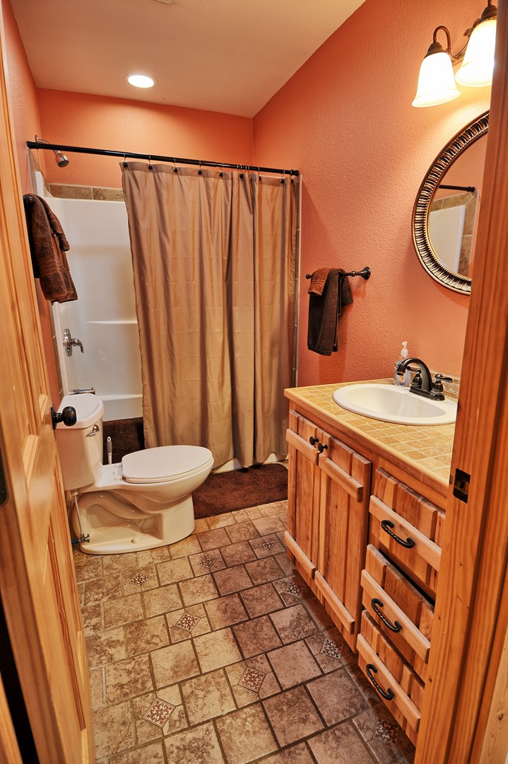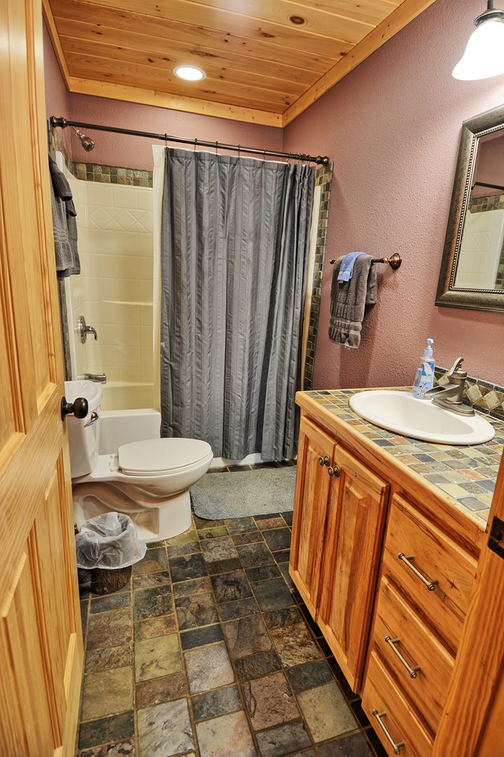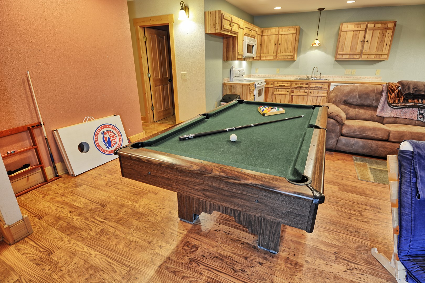 There are 2 more bedrooms on the lower level. One bedroom offers a queen size bed and the other bedroom has 2 sets of bunk beds for the kids. There is also a wood burning stove and satellite TV on the lower level as well. The 2nd Roku TV is in the family/game room.