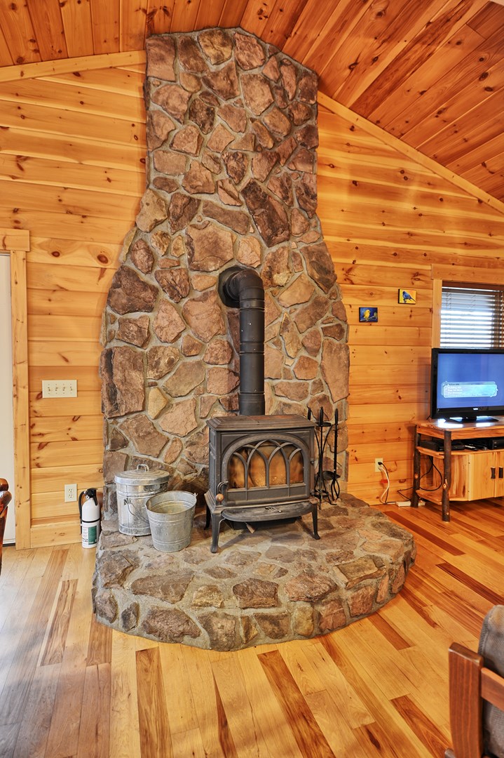 There are 2 bedrooms on the main floor, one of which is a king size bedroom and there is a queen size bed in the other plus there is a full bathroom with tub/shower combo. The living room offers a nice and cozy wood burning stove for those cold winter days and Roku TV.
