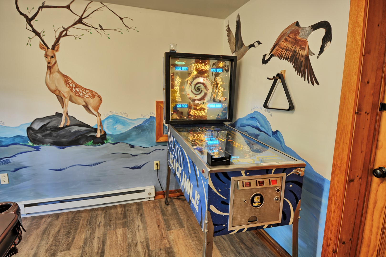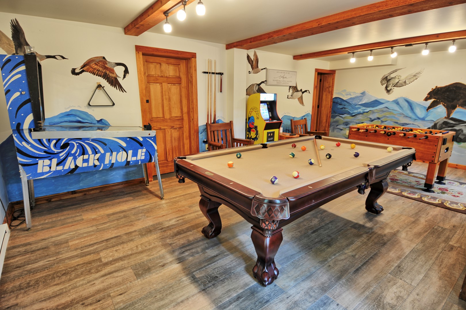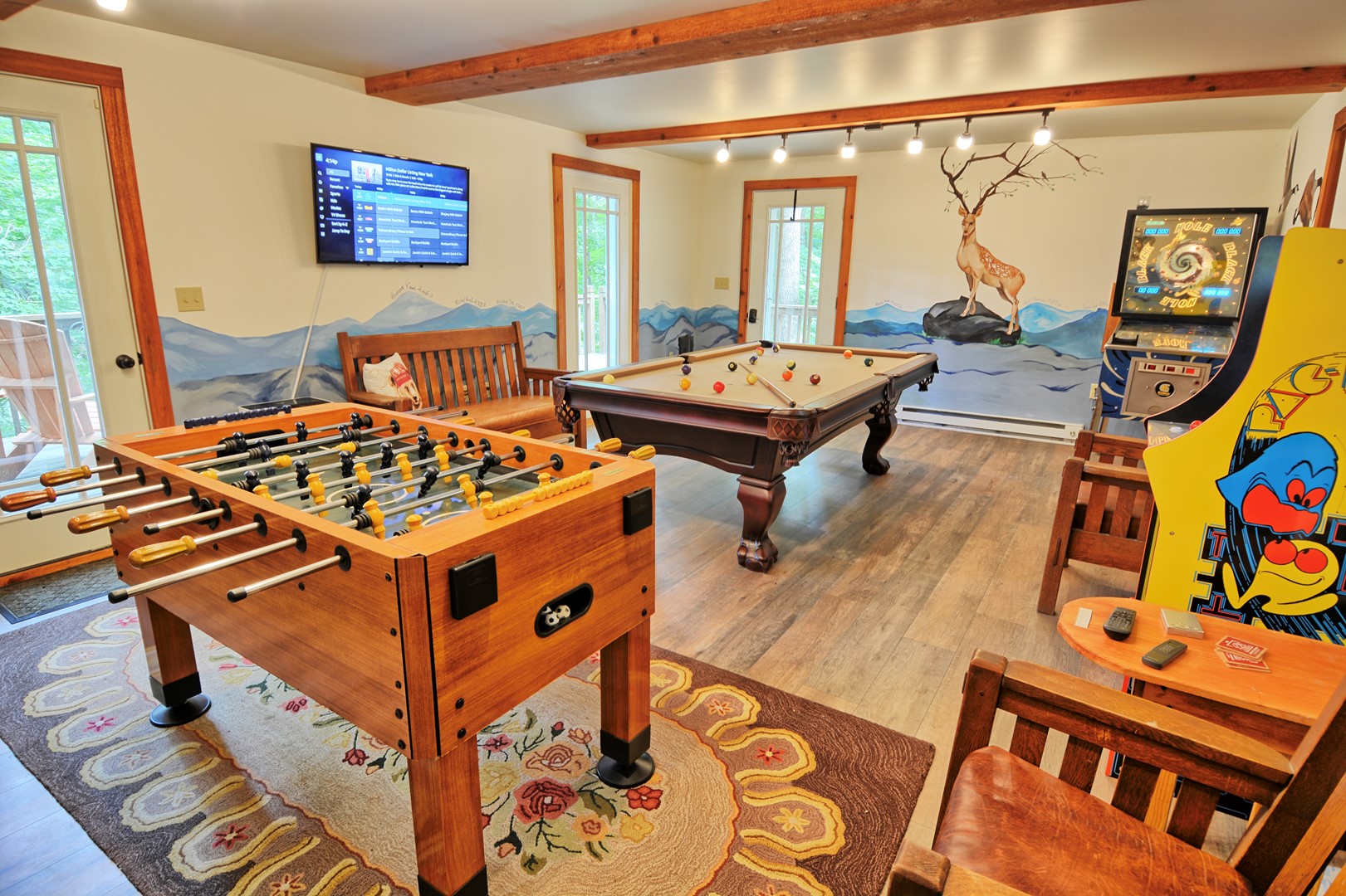 Located on the lower level of the detached garage, the game room is a hit with both kids and adults.