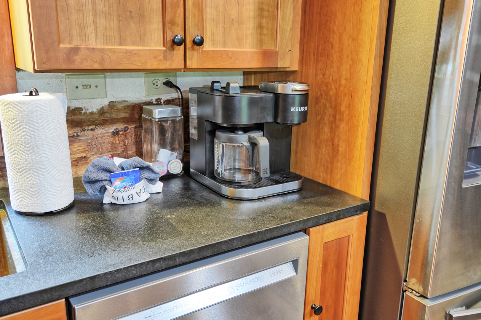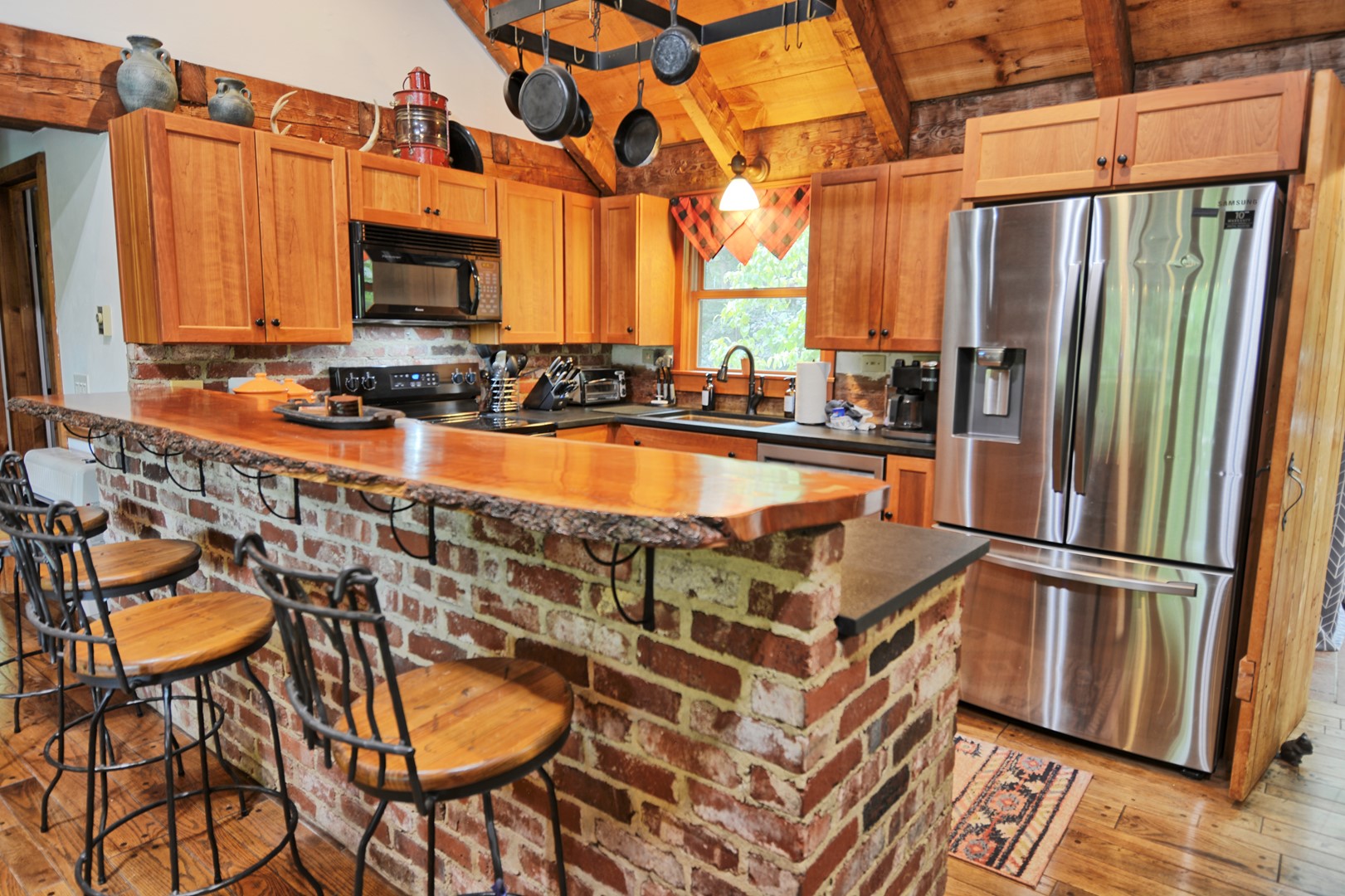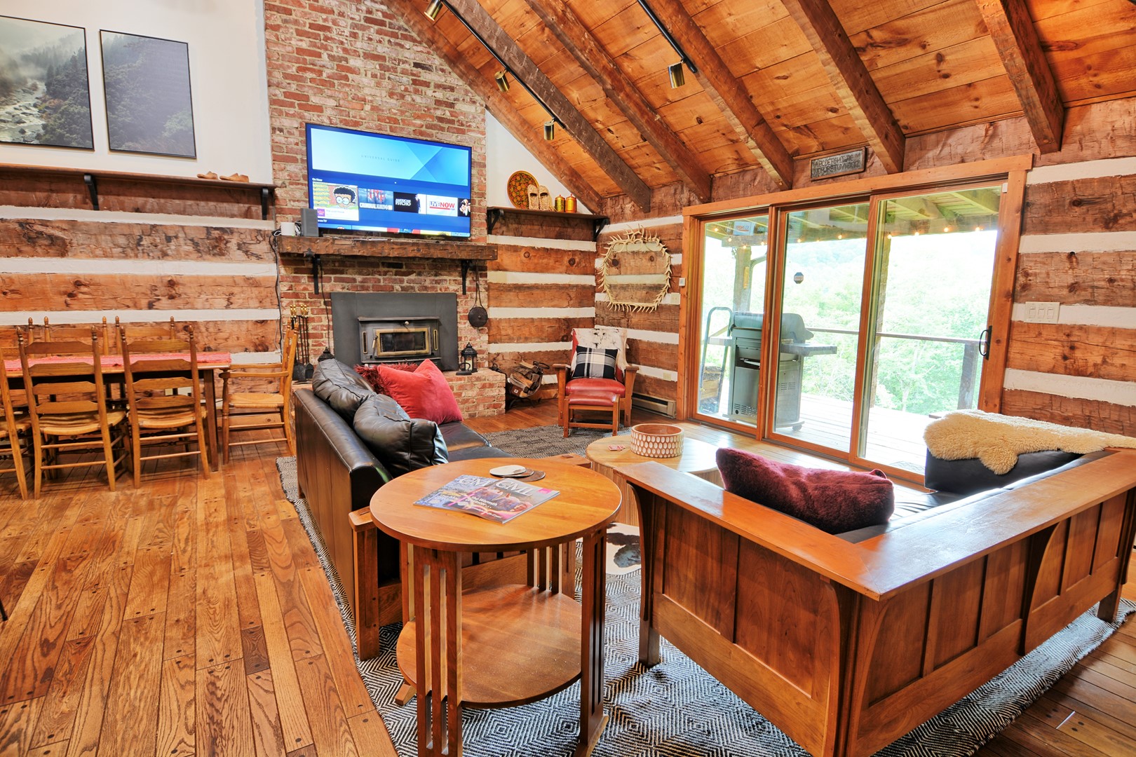 The living room invites you to relax by the seasonal wood-burning fireplace, watch a movie on the Samsung Smart TV, or simply soak in the mountain views through the tall windows and skylights.