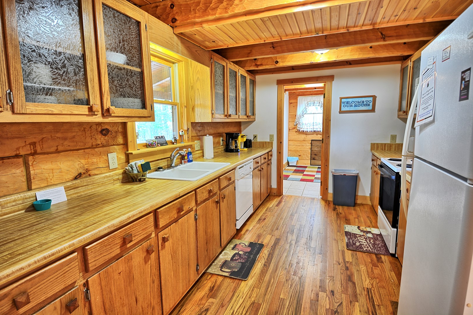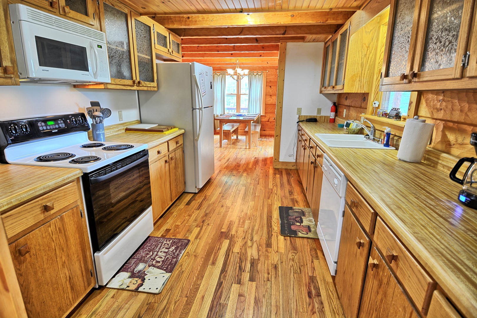 Our kitchen is fully stocked with most cooking utensils to prepare your family meal and clean up will be a snap with the dishwasher. The kitchen has a regular 12 cup coffee maker AND a Keurig, toaster, cookware, dinnerware and etc. The dining table seats up to 6 with 2 wooden benches. Enjoy a meal using our gas grill on the deck. The living room has a gas fireplace for those cold fall/winter days (fireplace is seasonal).