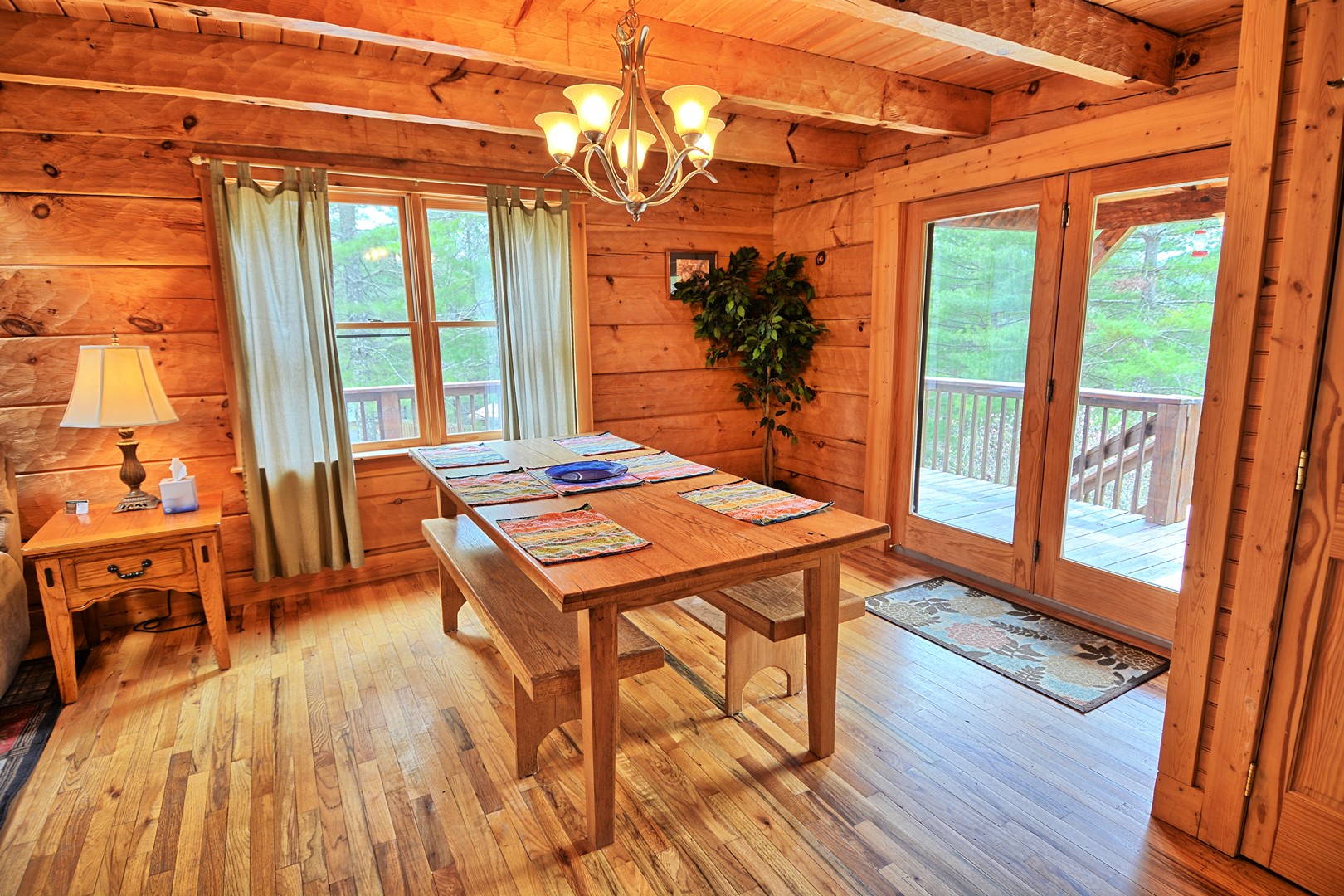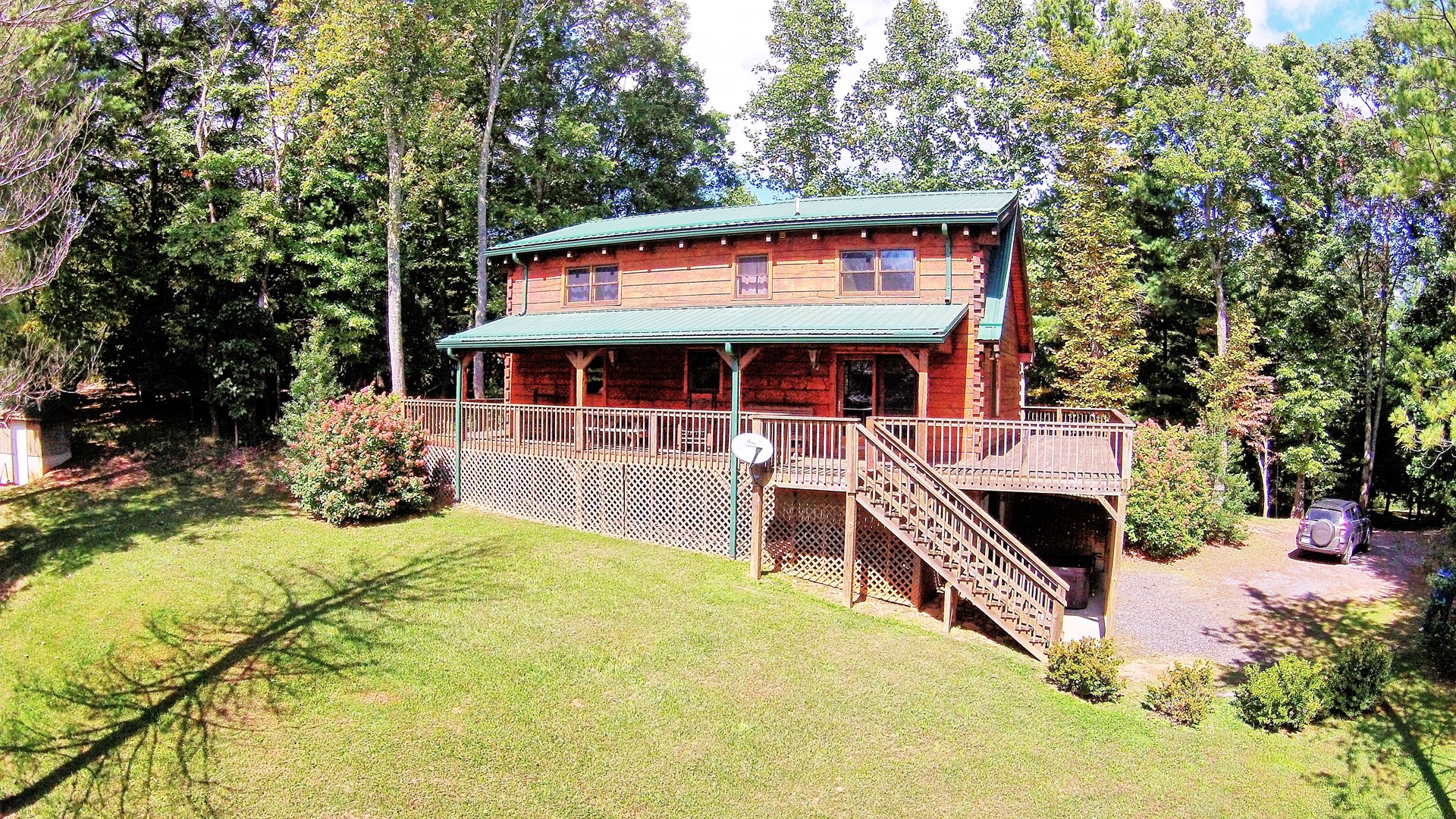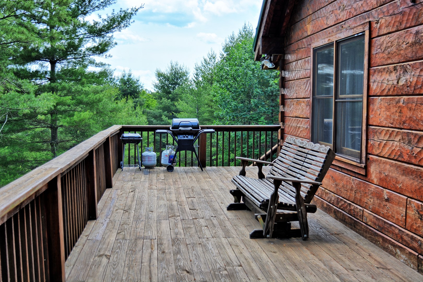 The wraparound deck is perfect for enjoying the wooded views and the fresh mountain air.