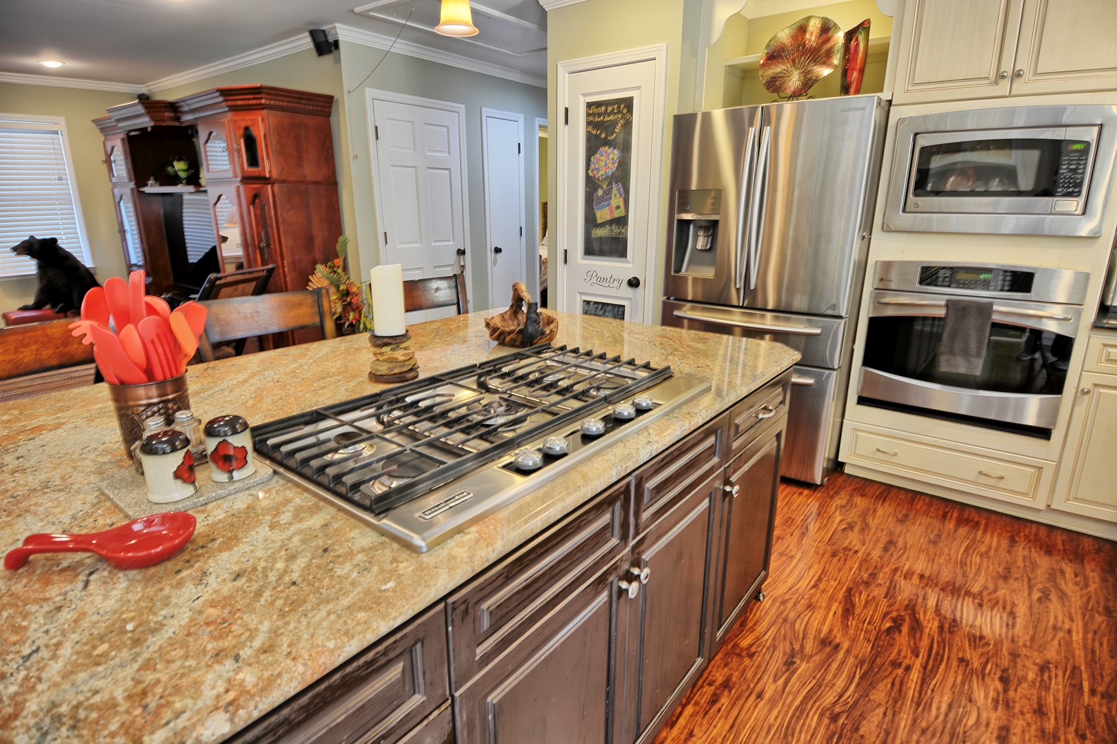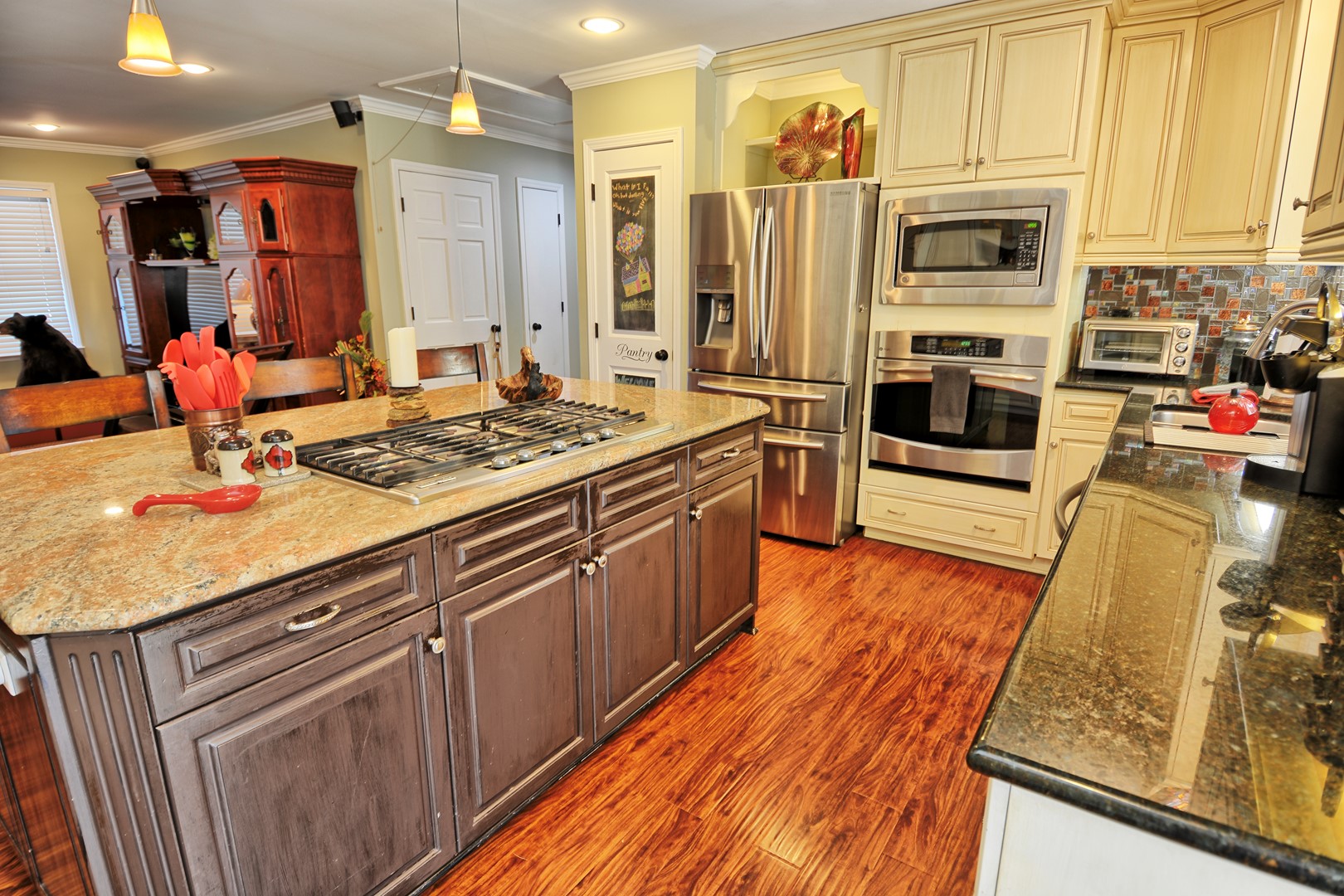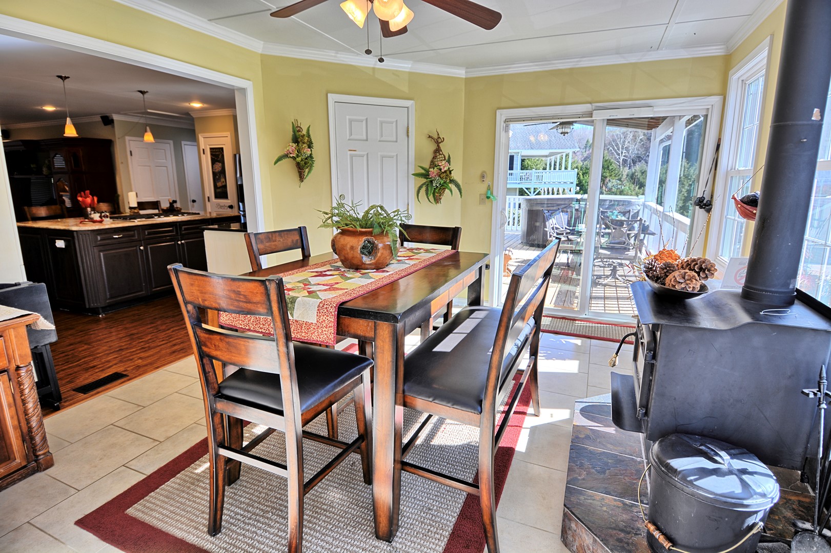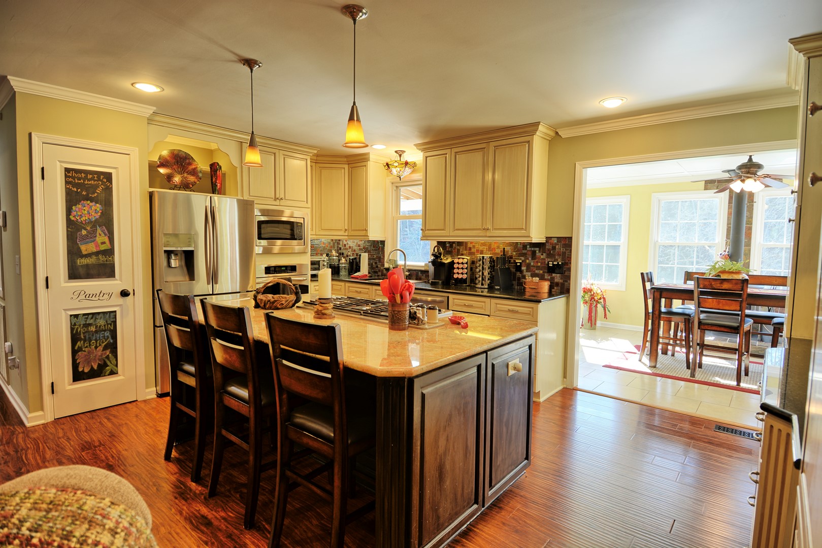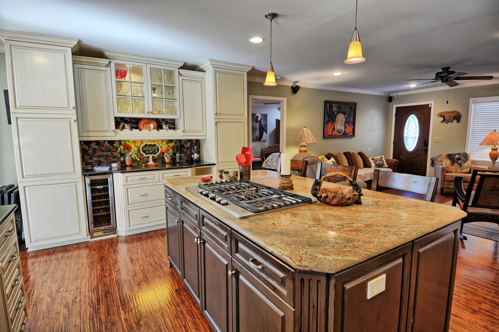 • Dining: Table for 6 with extra seating at the kitchen island.