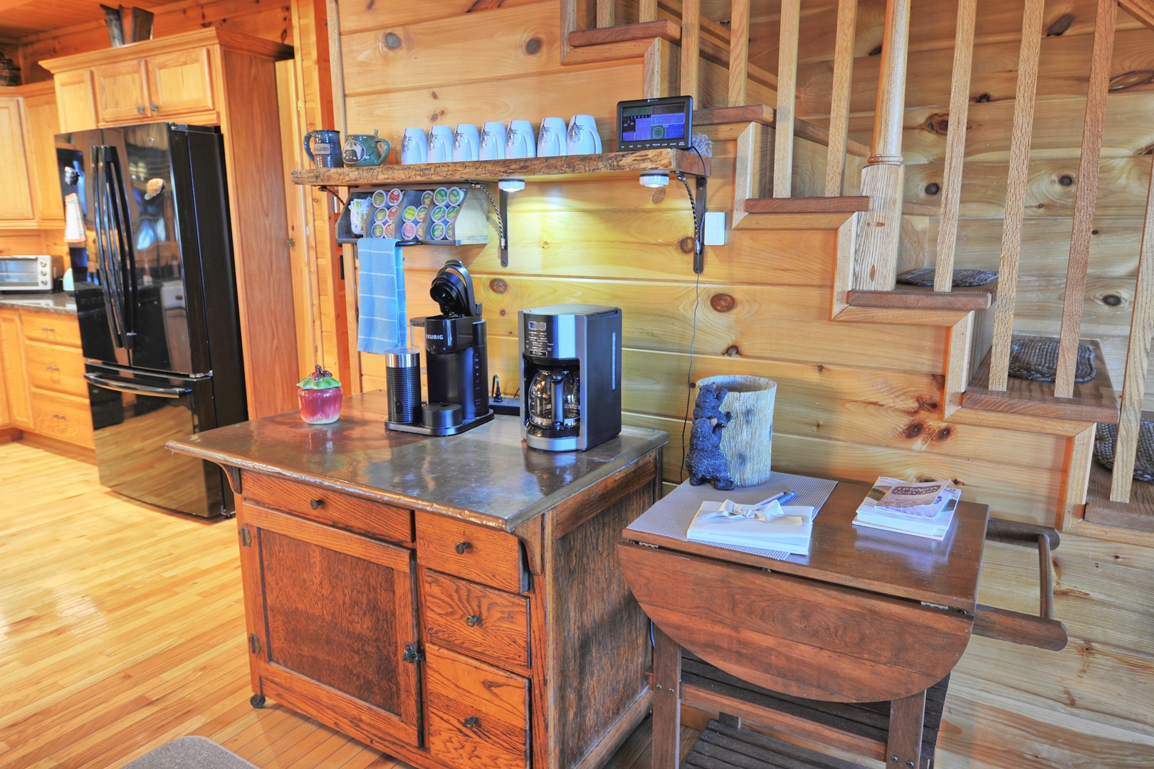 - Fully stocked kitchen with granite countertops, modern appliances, gas stove, refrigerator with ice/water dispenser, dishwasher, coffee station with a Keurig maker and a regular coffee maker, and built-in microwave.