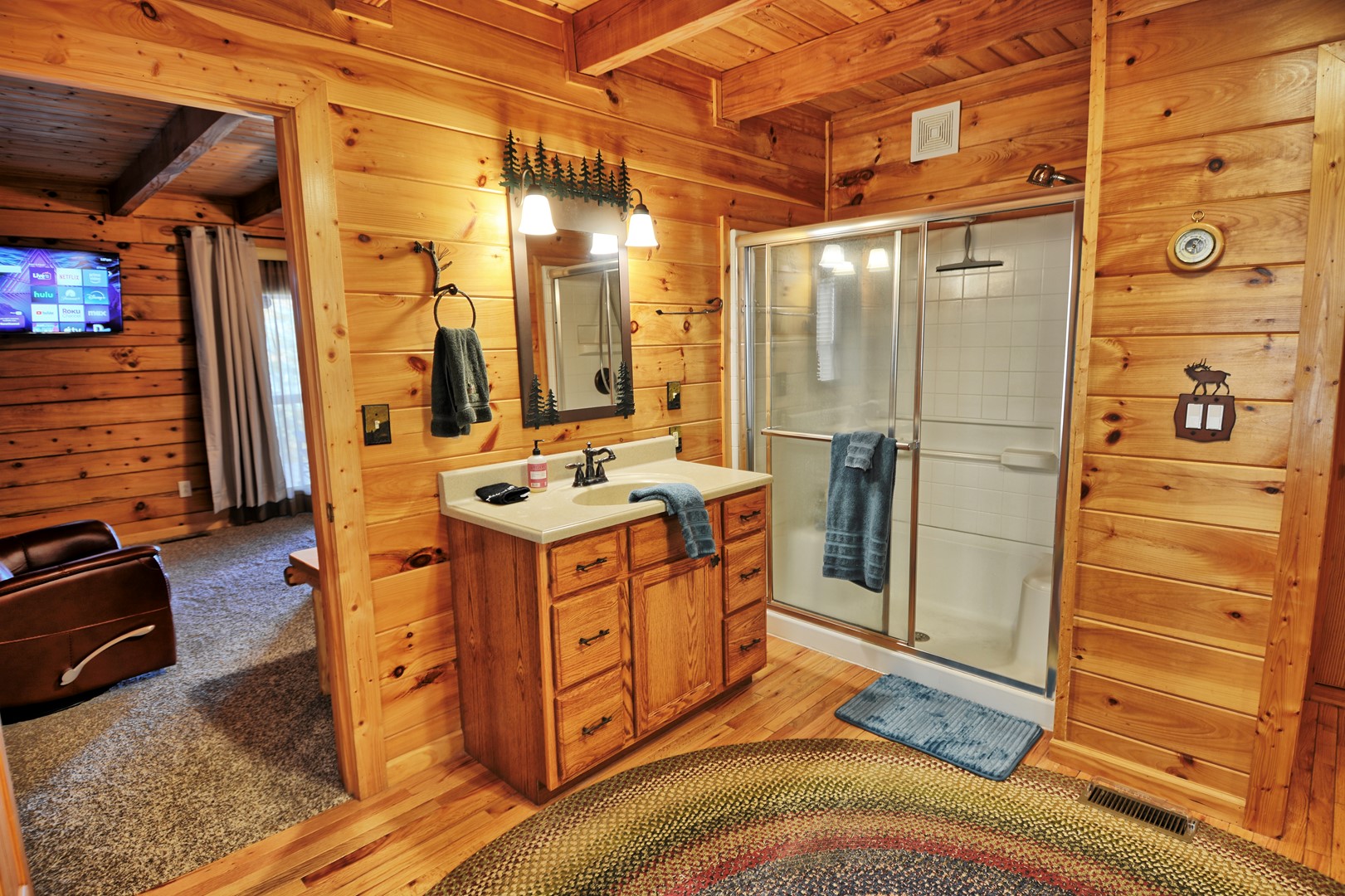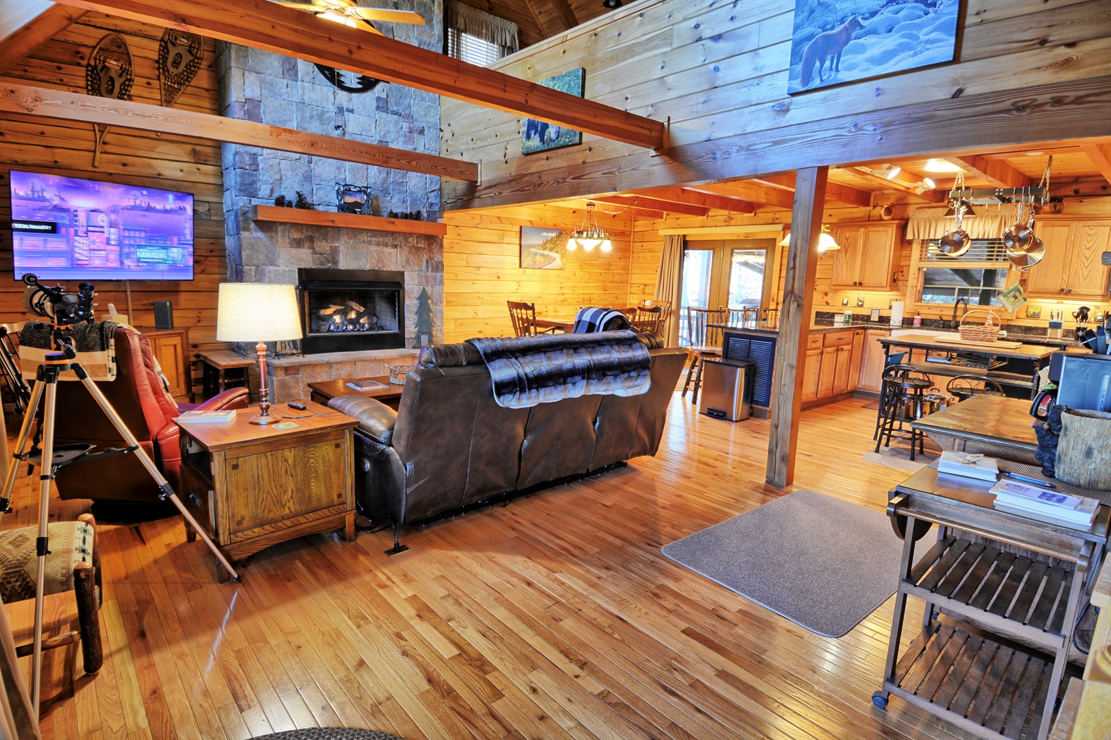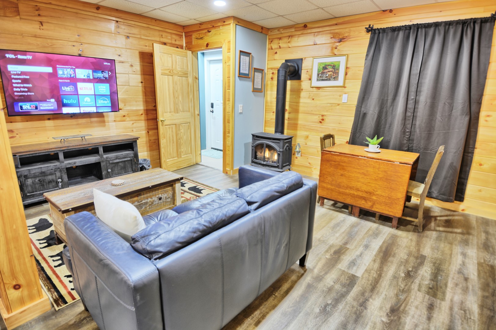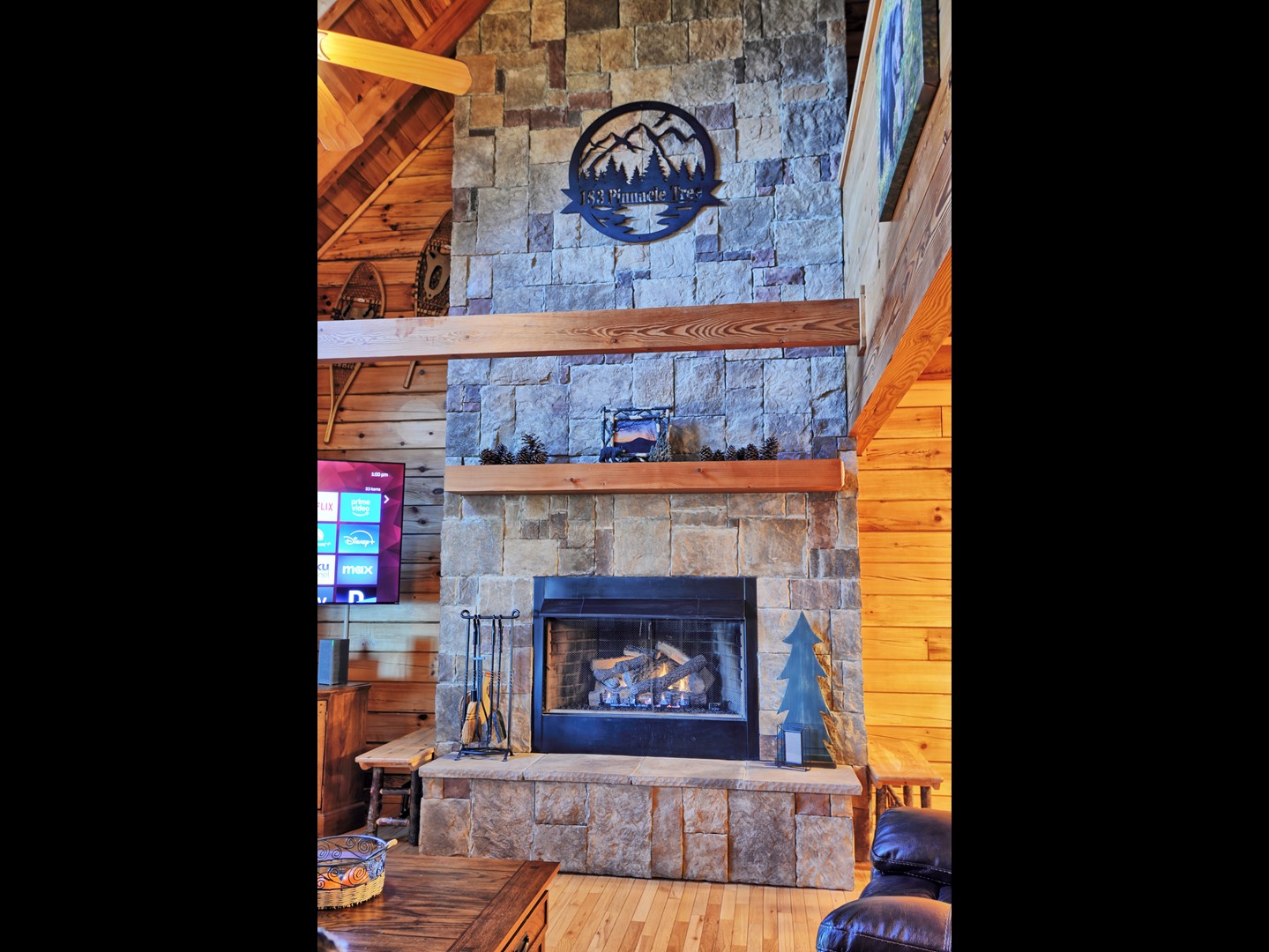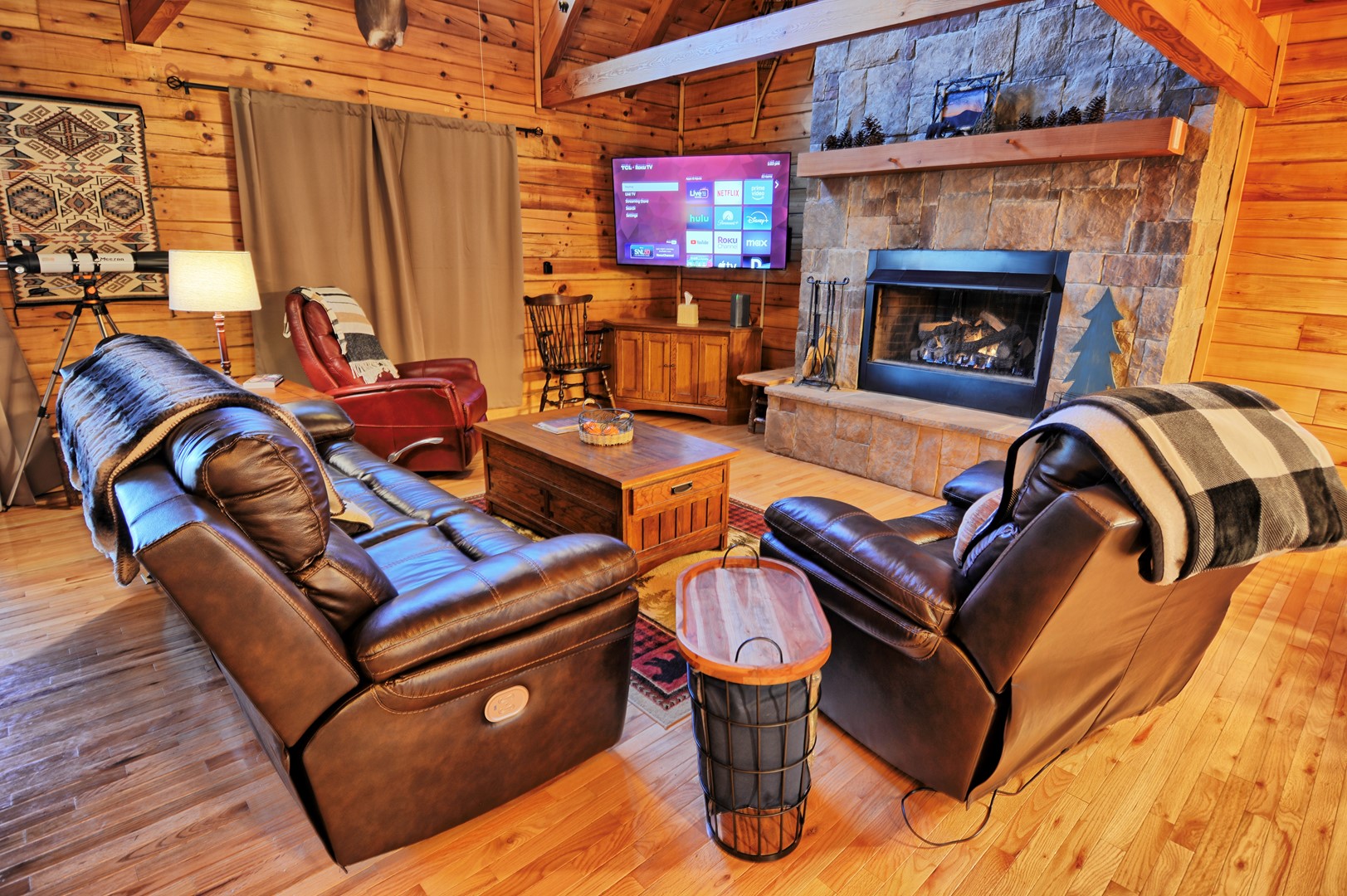 - The living room offers an amazing floor to ceiling stone gas fireplace (seasonal), Roku TV, comfortable electric reclining couch and electric recliner.