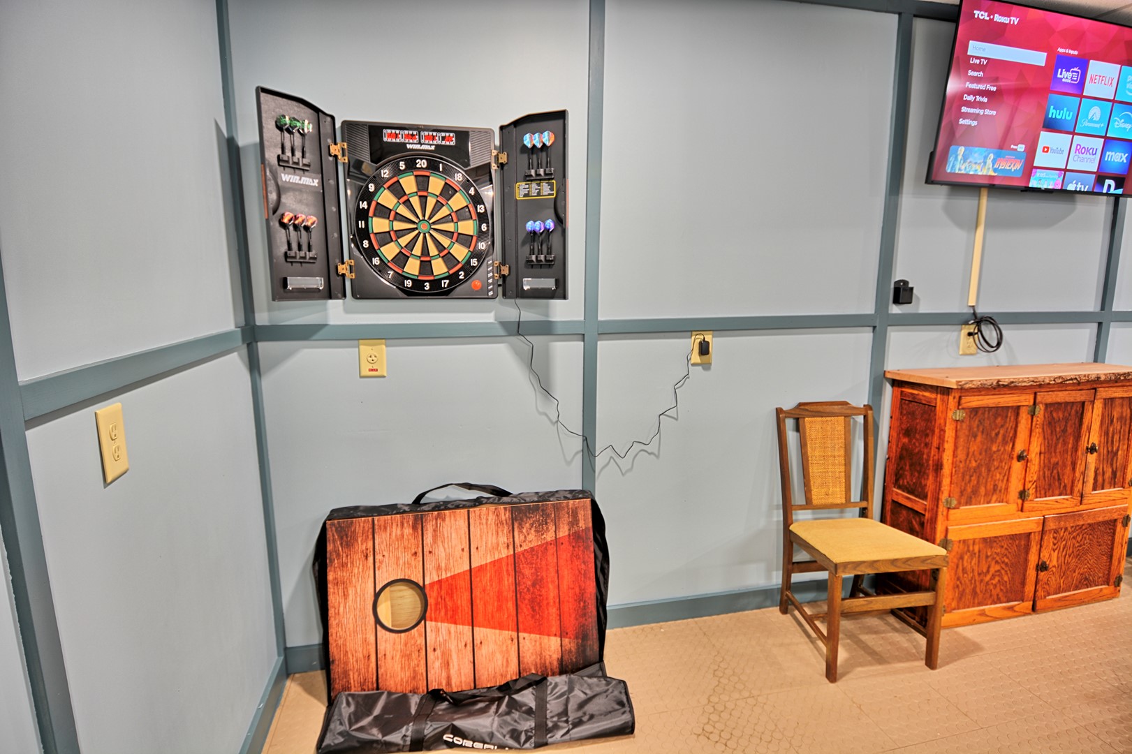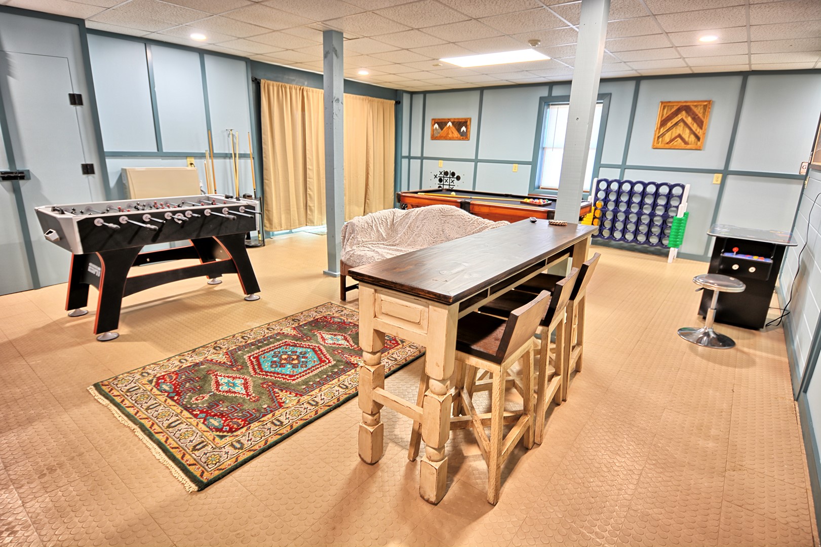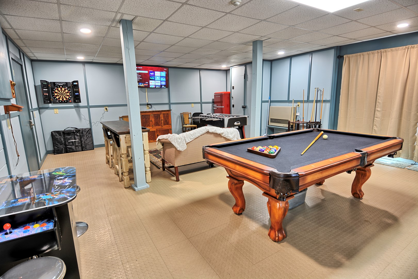 - Entertainment/Game Room with pool table, Foosball, arcade style game table with 60+ games including PacMan, Donkey Kong, etc., darts, cornhole, large connect 4 game, large tic tac toe, Roku TV, refrigerator, table with 3 chairs and a small couch, access to outside and to the hot tub.