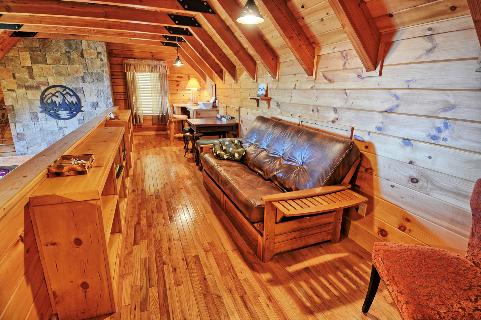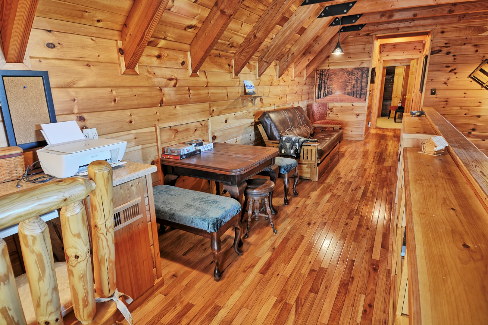 - LOFT: There is a loft which is open to below with a couch, card table and a work area with desk, lamp and printer, and many books to read and enjoy.