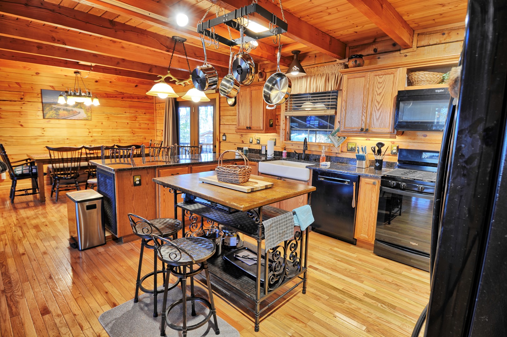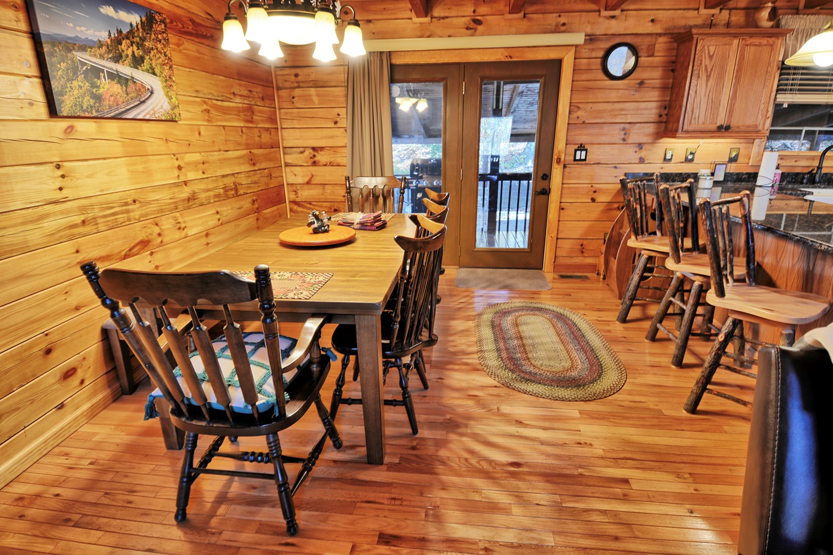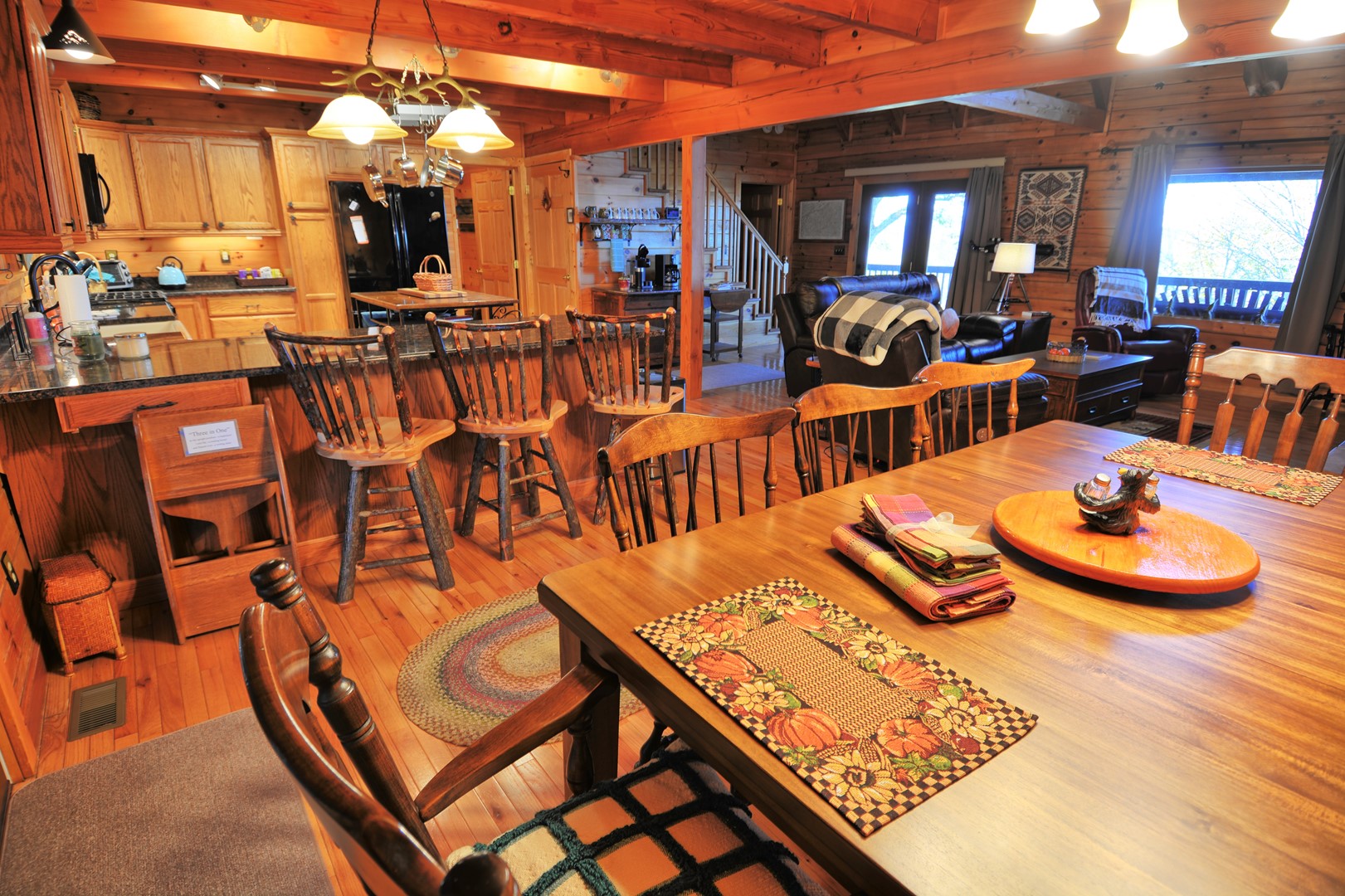- Open floor plan with dining table for 8 guests and additional seating for 3 at the kitchen peninsula. There is also a wooded high chair.