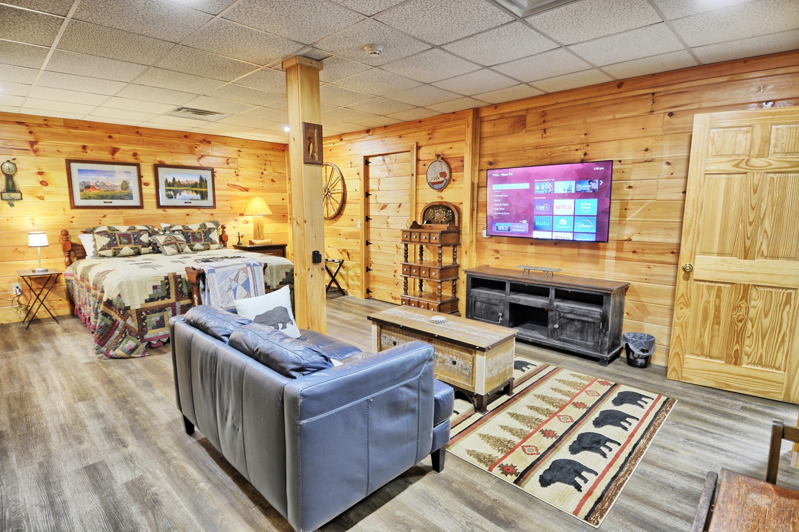 - 2 bedrooms, one with a queen bed with a Roku TV and a bedroom with 2 bunk beds (twin/twin) and Roku TV.