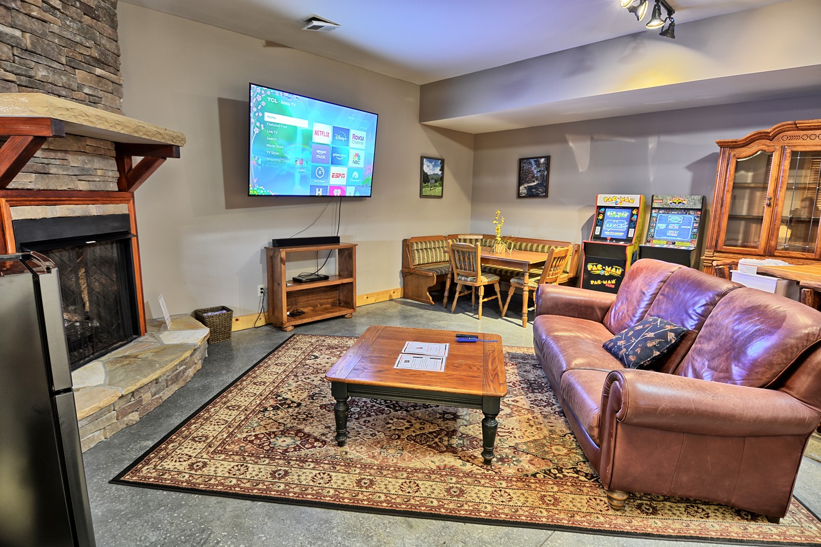 OUTSIDE: Off of the lower level, you’ll find our relaxing 5 person hot tub, outdoor fire pit (wood not provided) and a gazebo! There is a charcoal park grill just off the porch (charcoal not provided).