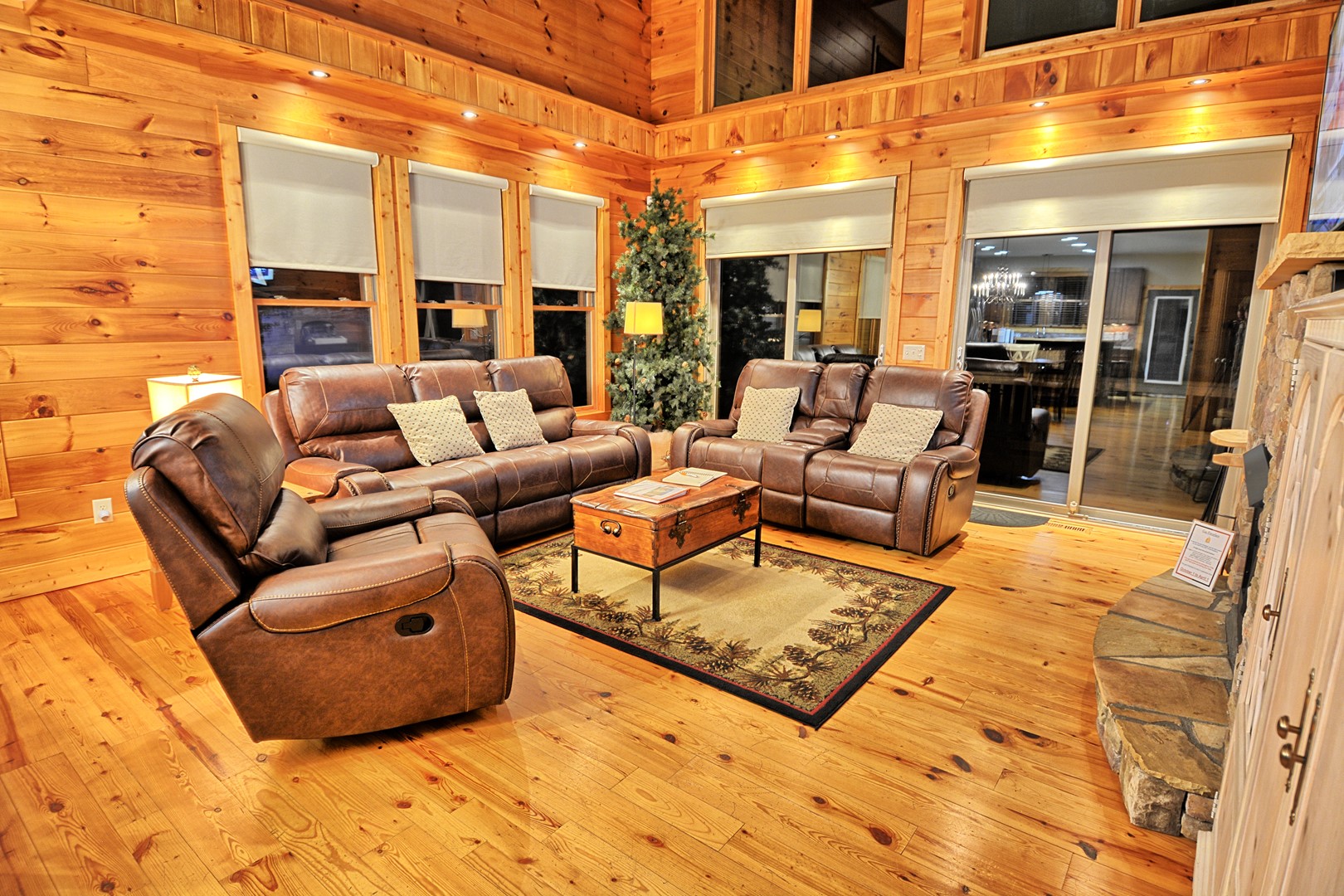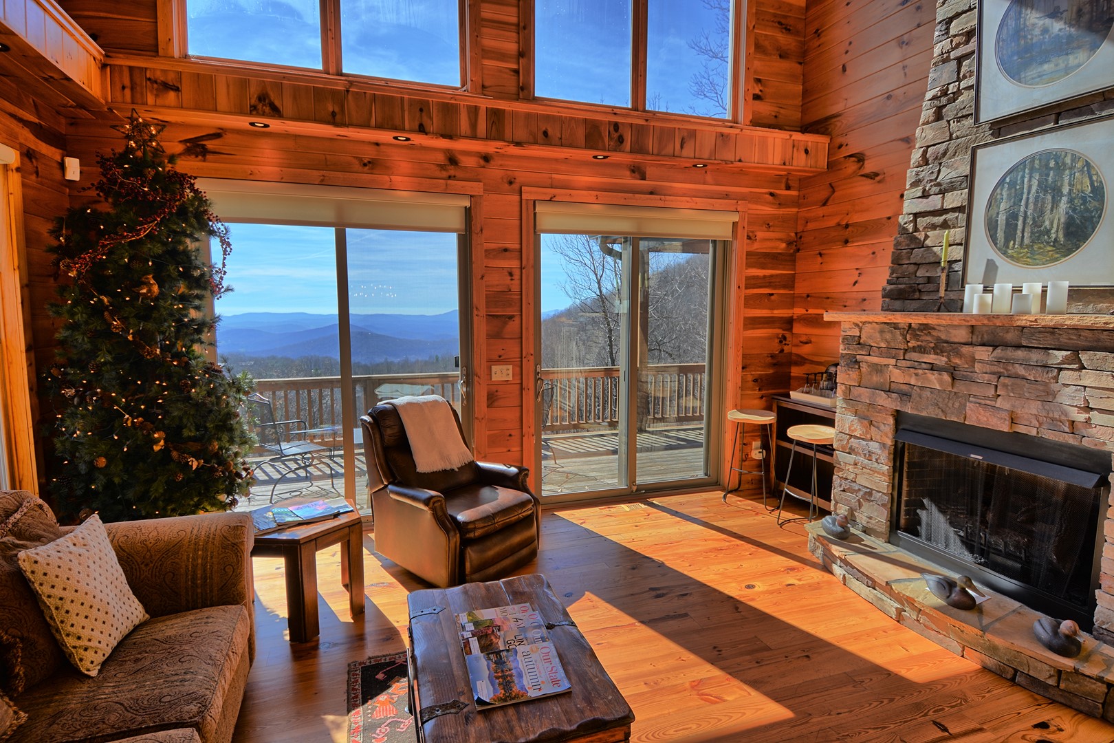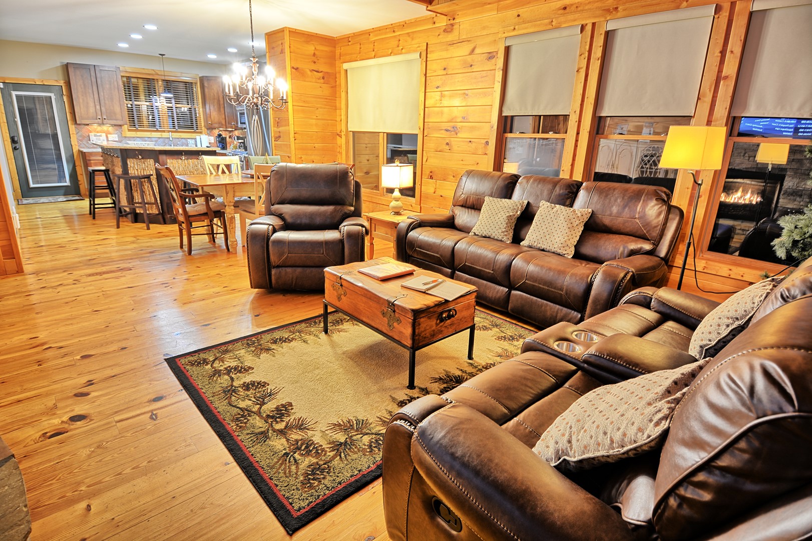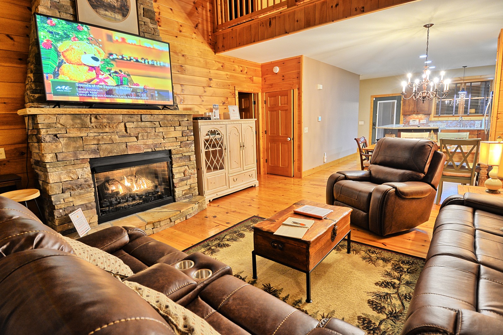 Our cabin offers 4 bedrooms (maximum of 10 guests), 3.5 bathrooms, lower level game room with pool table, gas fireplace, card table, dining table, foosball table. There is a 20 foot gas fireplace in main floor living room, media room with large TV, leather sofa and comfortable chairs. Fully furnished with all the comforts of home, charcoal park grill, full width of chalet deck with open and partially covered porch.