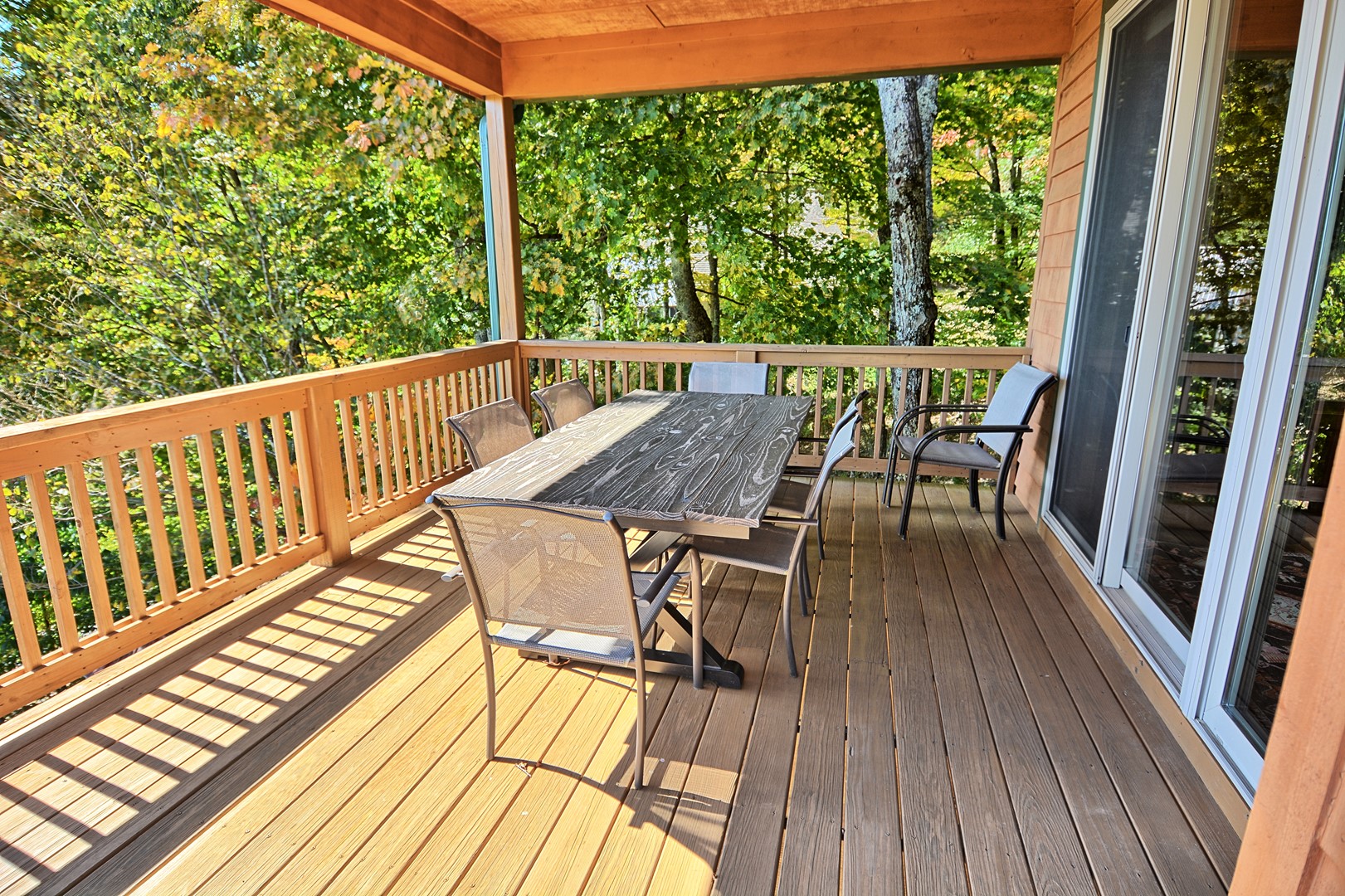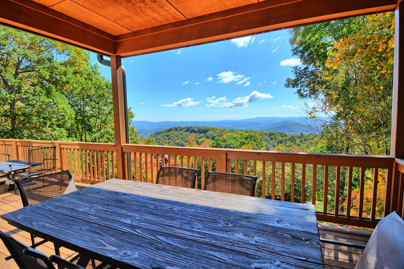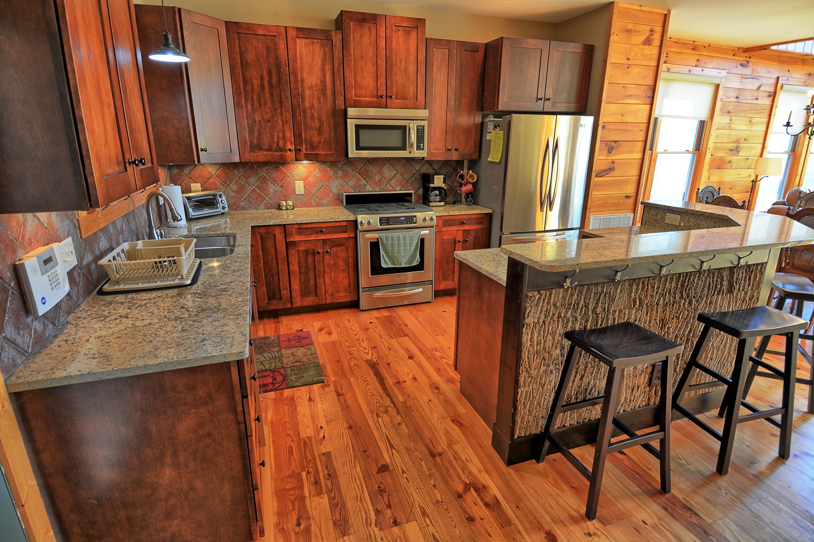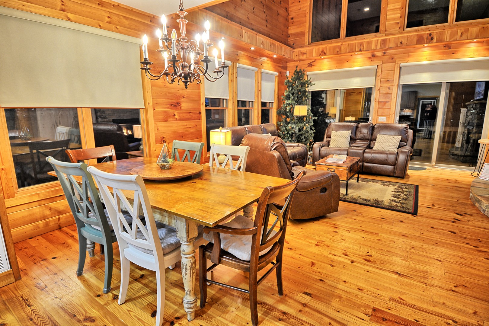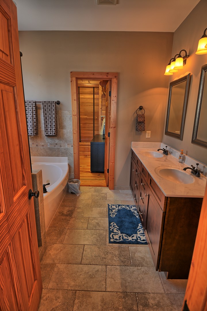 Our cabin offers 4 bedrooms (maximum of 10 guests), 3.5 bathrooms, lower level game room with pool table, gas fireplace, card table, dining table, foosball table. There is a 20 foot gas fireplace in main floor living room, media room with large TV, leather sofa and comfortable chairs. Fully furnished with all the comforts of home, charcoal park grill, full width of chalet deck with open and partially covered porch.
