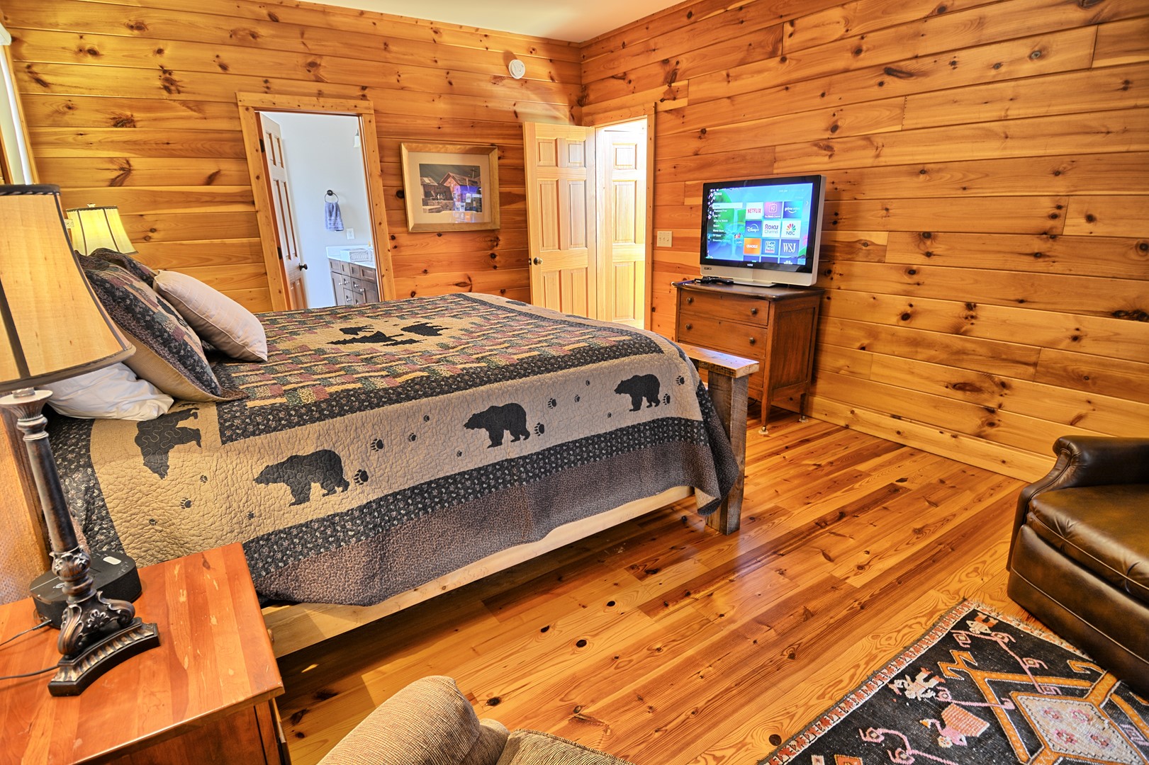 UPPER FLOOR: You will find 2 additional queen size bedrooms and a full bathroom with tub/shower combo. One bedroom has a Roku TV and the other bedroom has a BluRay DVD player that has access to Netflix.