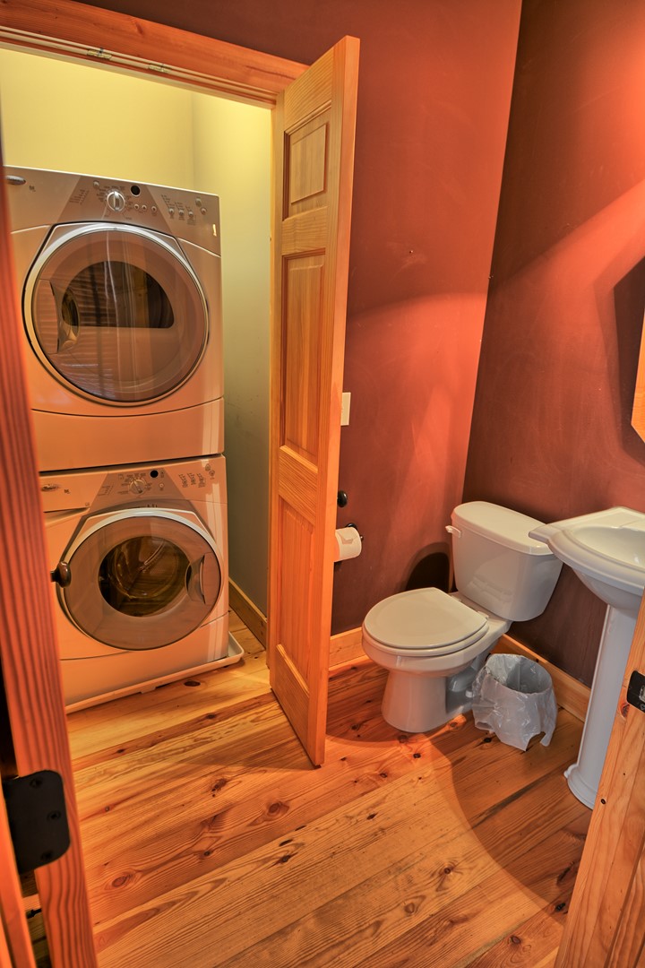The living room boasts a 20’ stacked stone gas fireplace (seasonal), flatscreen TV and VIEWS out of the large windows for that bright and open feel. There is a laundry closet with a washer and dryer located in the half bathroom on the main level as well.