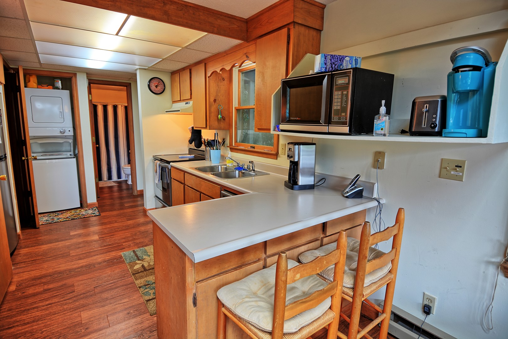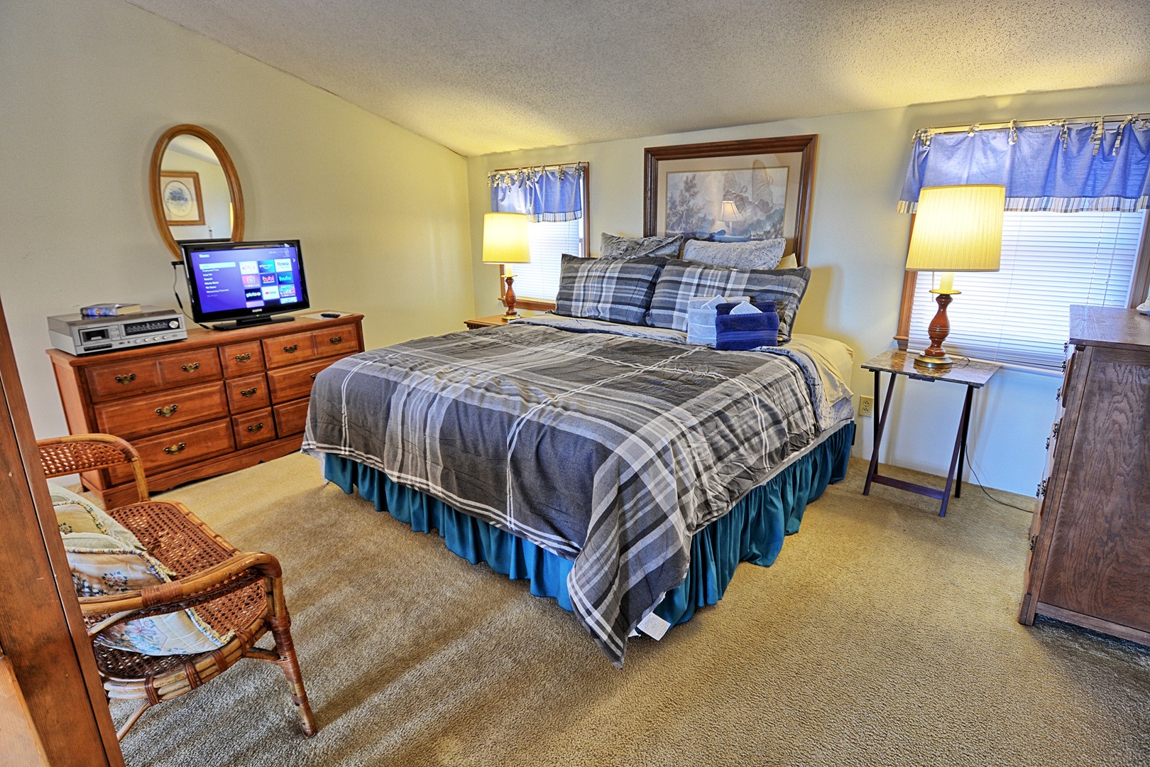 This townhouse has 2 bedrooms and 2 and 1/2 bathrooms. There is a queen size bedroom on the main floor along with a full bathroom (tub/shower combo) and the king bed is upstairs in the loft sleeping area along with a full size bed for additional sleeping. There is a 32" flat screen TV with a Roku device for streaming your favorite apps. The 2nd bathroom has a walk-in shower and is on the upper level with the king size bed. There is a stacked washer and dryer on the main floor as well.