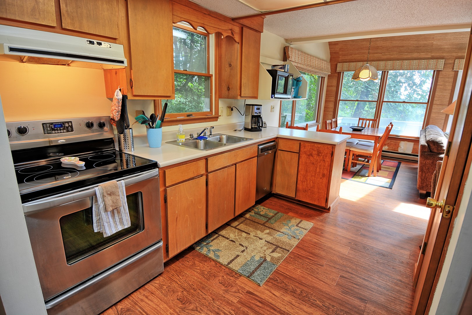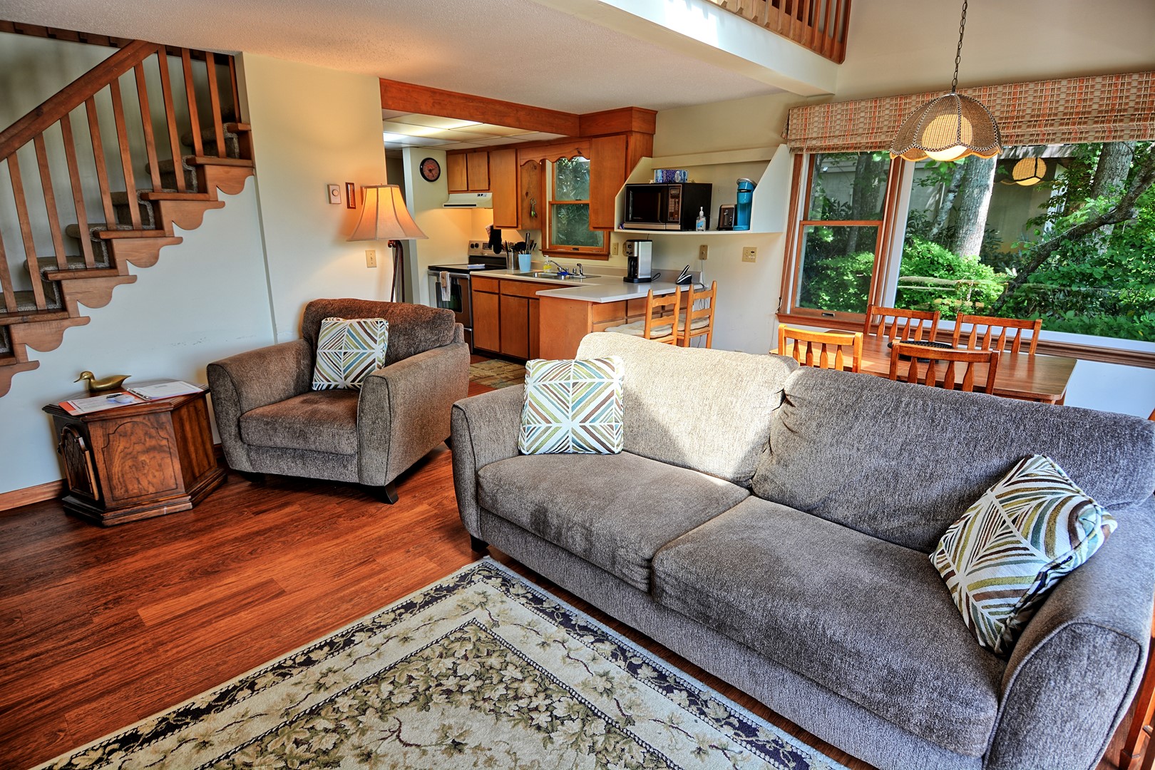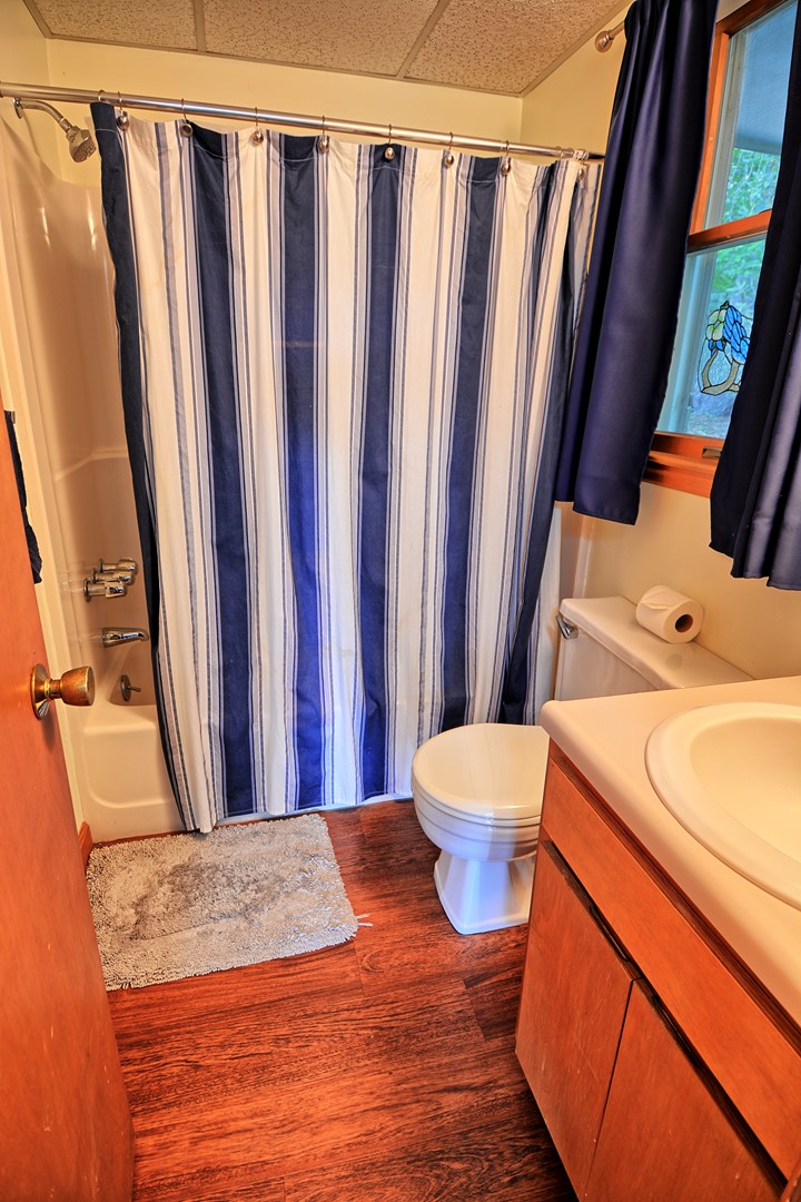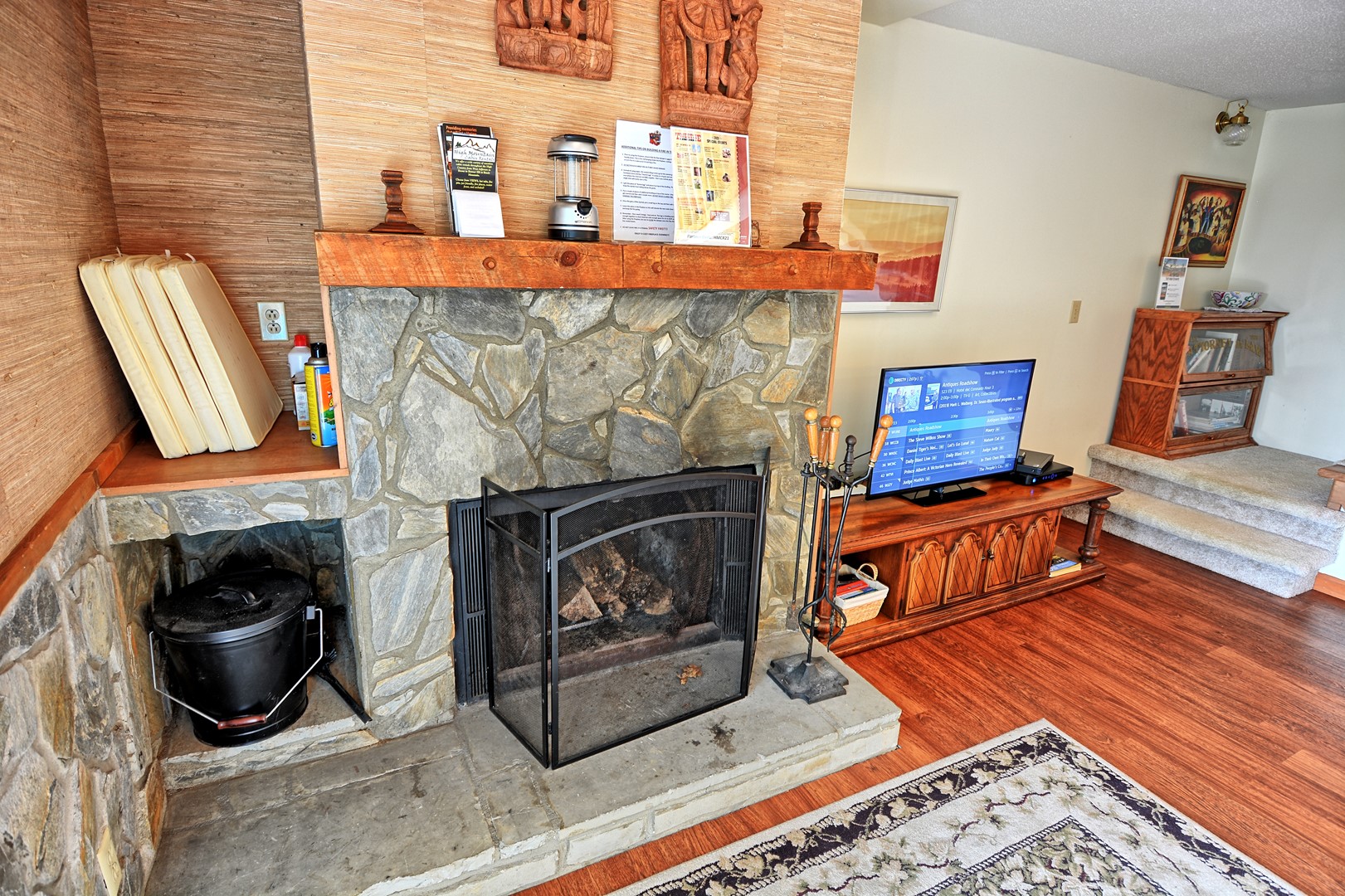 The living room has a couch and a comfy chair with ottoman. The TV in the living room is a 50" Roku TV with streaming apps and also has Direct TV with local channels. Enjoy the wood buring fireplace during those cold winter nights (wood not provided).