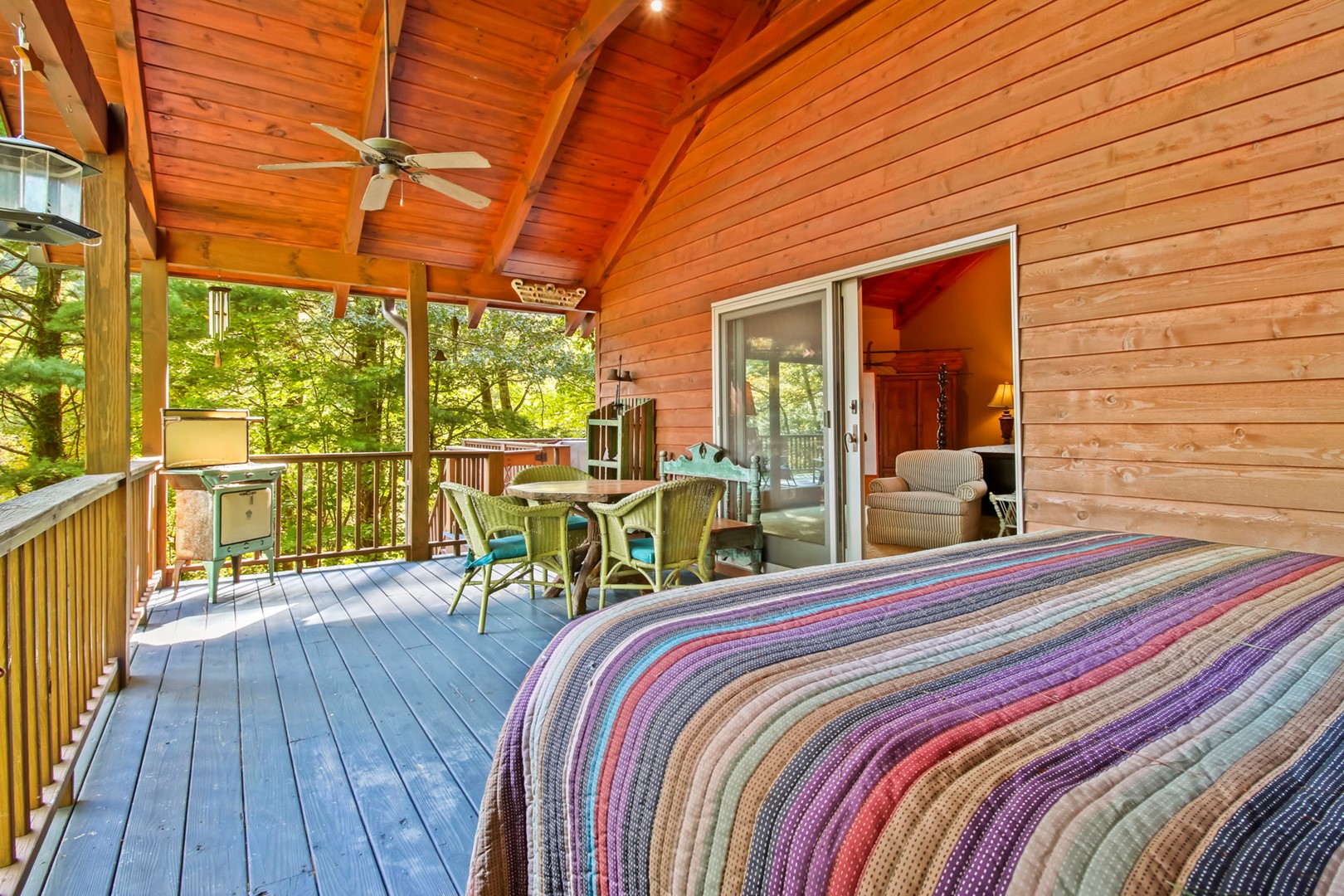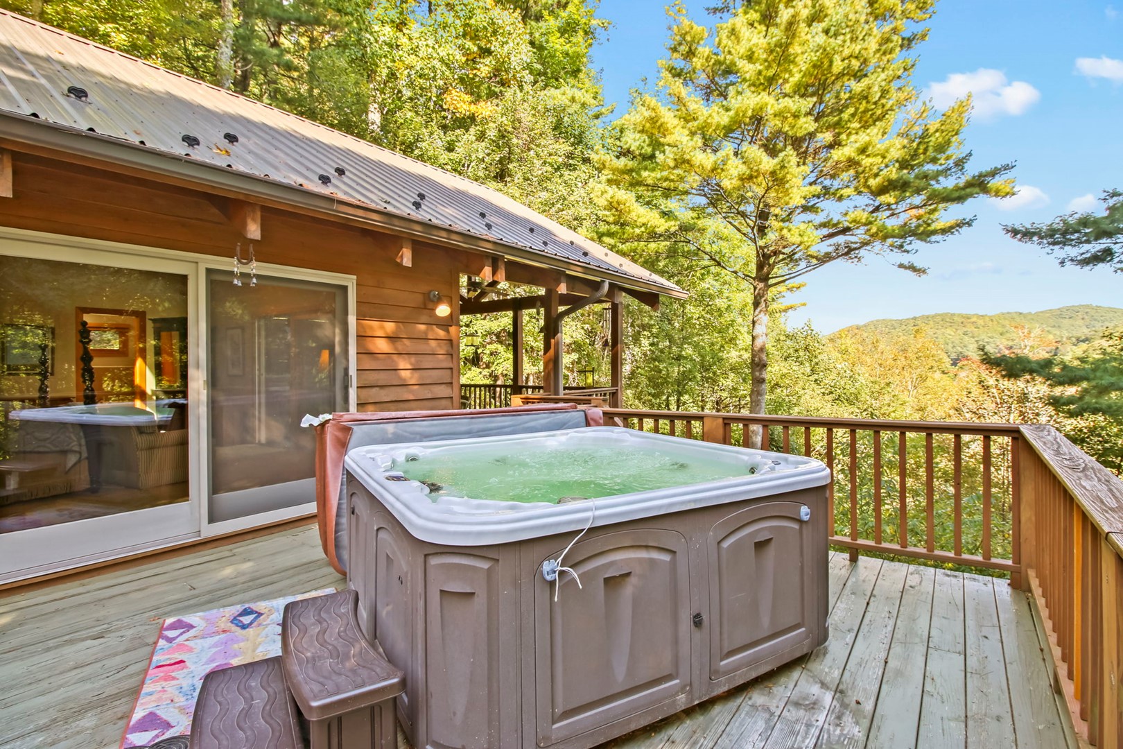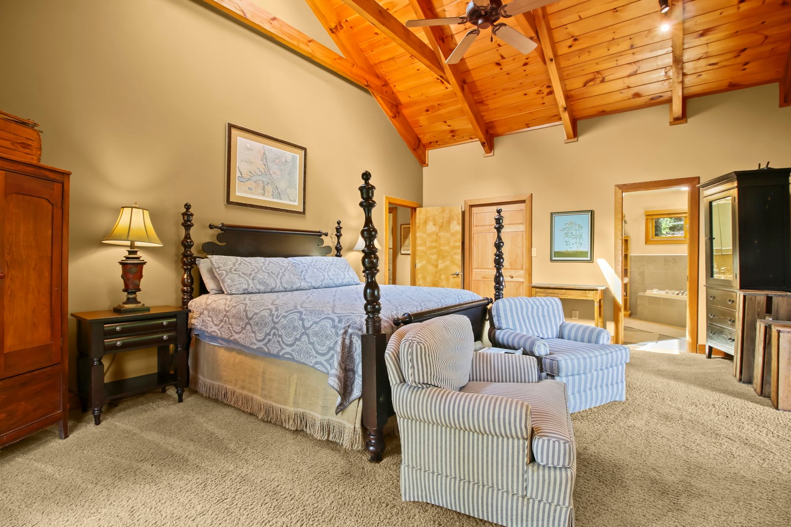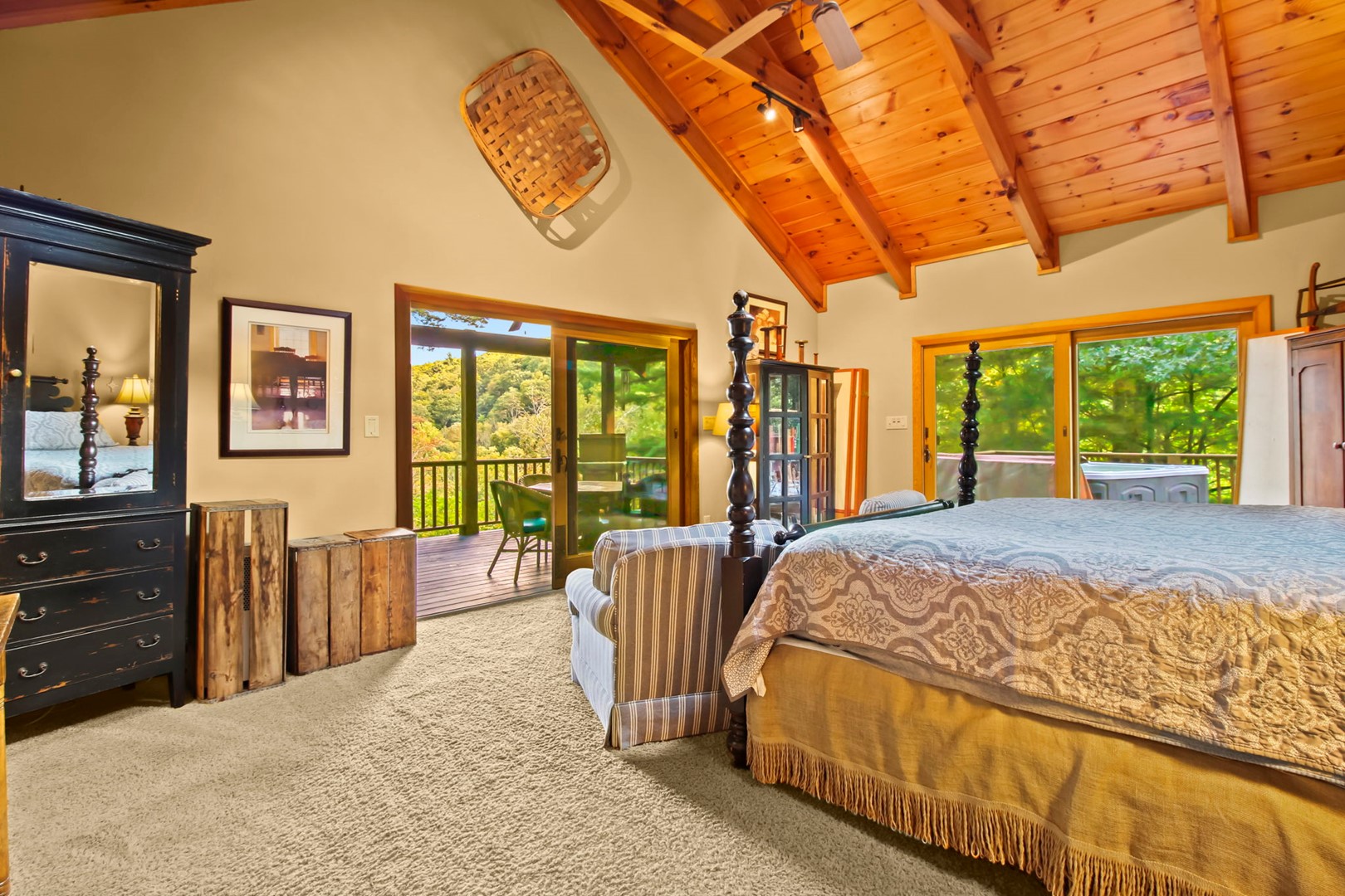 The master suite invites you with a king size 4 poster bed, private master bathroom with Jacuzzi tub and separate step in shower, a private entrances onto the covered deck where you can relax, sit a spell, and recoup from your busy life. Also enjoy the relaxing 5-6 person hot tub on the deck.