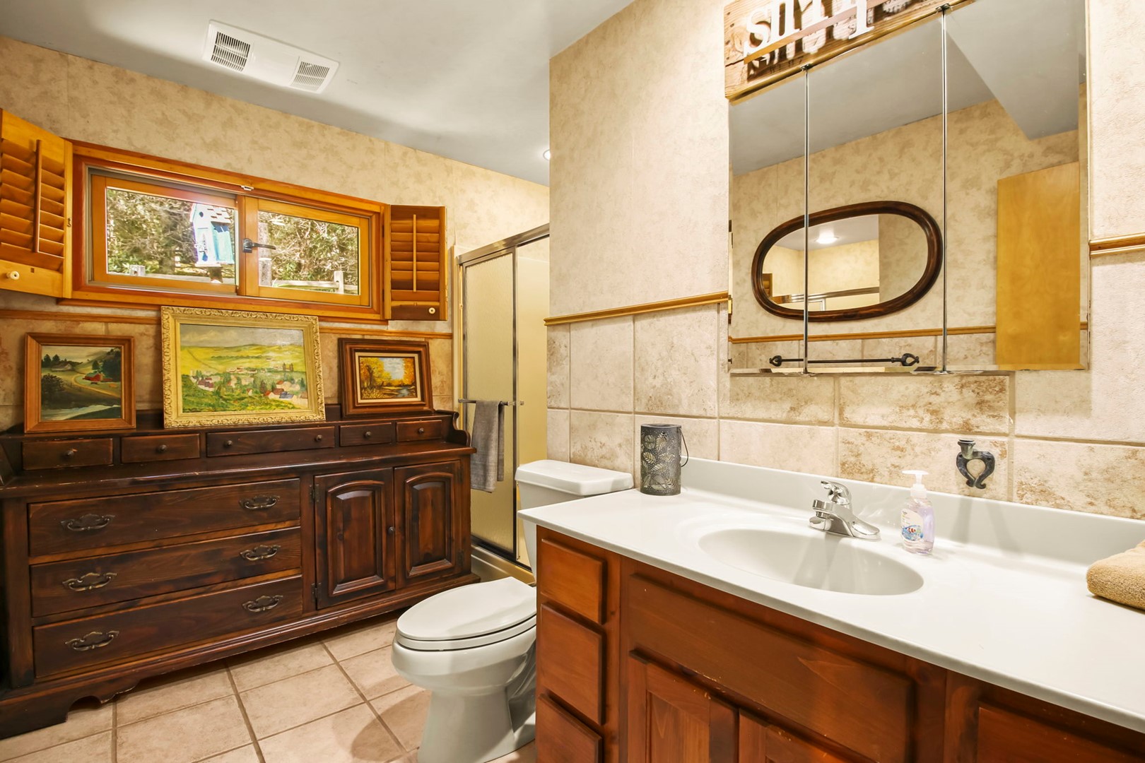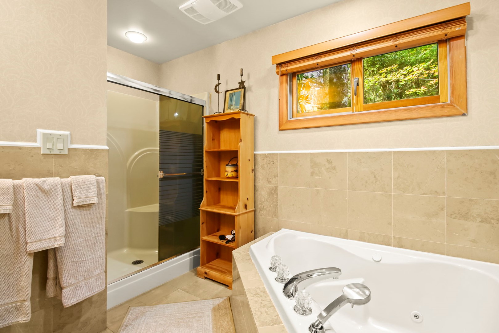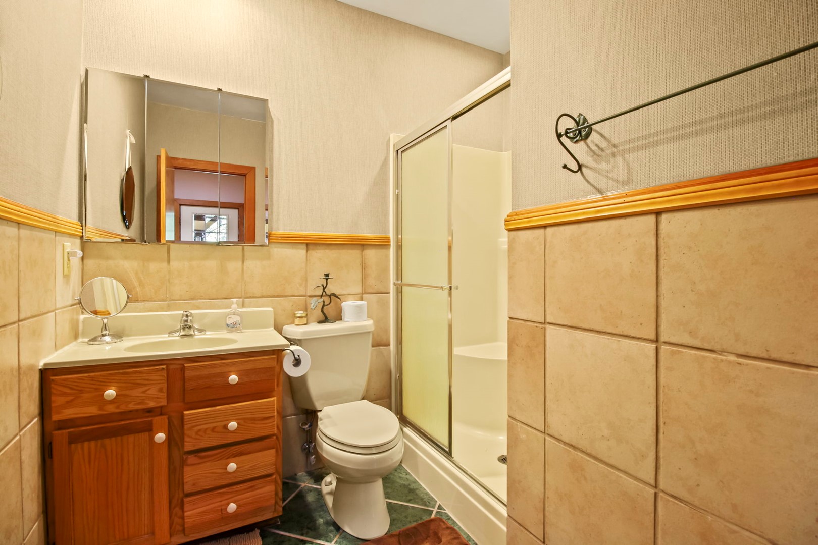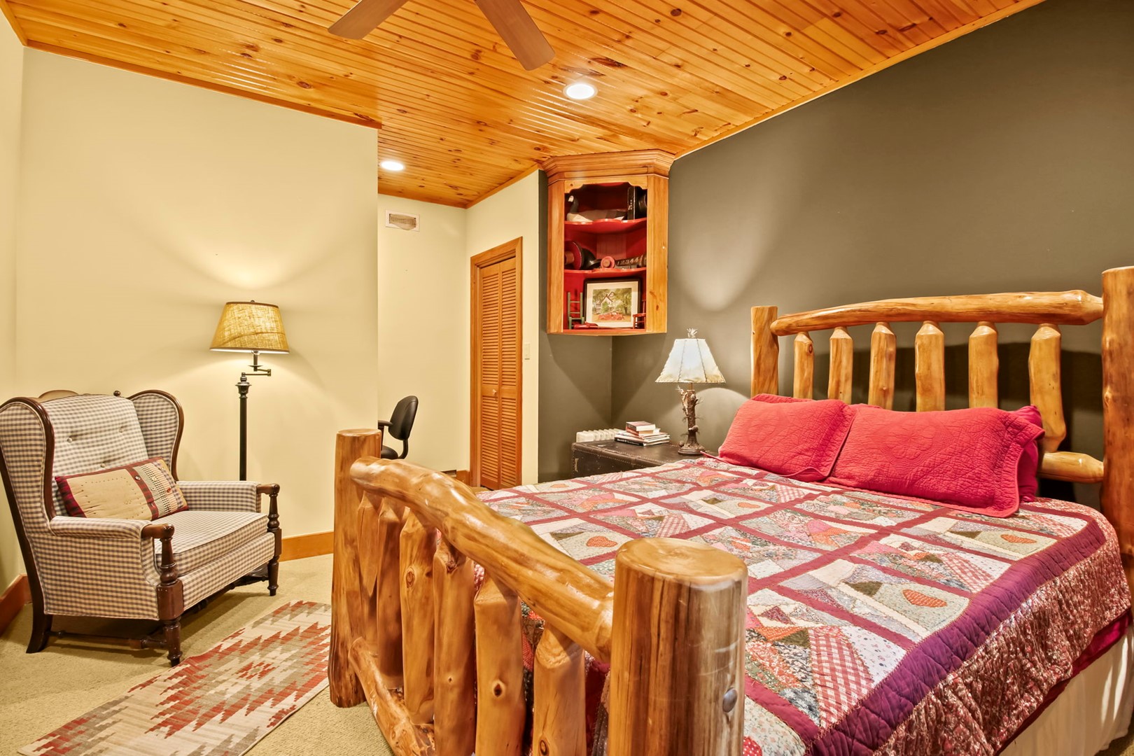 There is also another bedroom on the main level. In this warm room you will find a queen size bed. There is also a 2nd full bathroom with a step in shower across the hall from this bedroom.