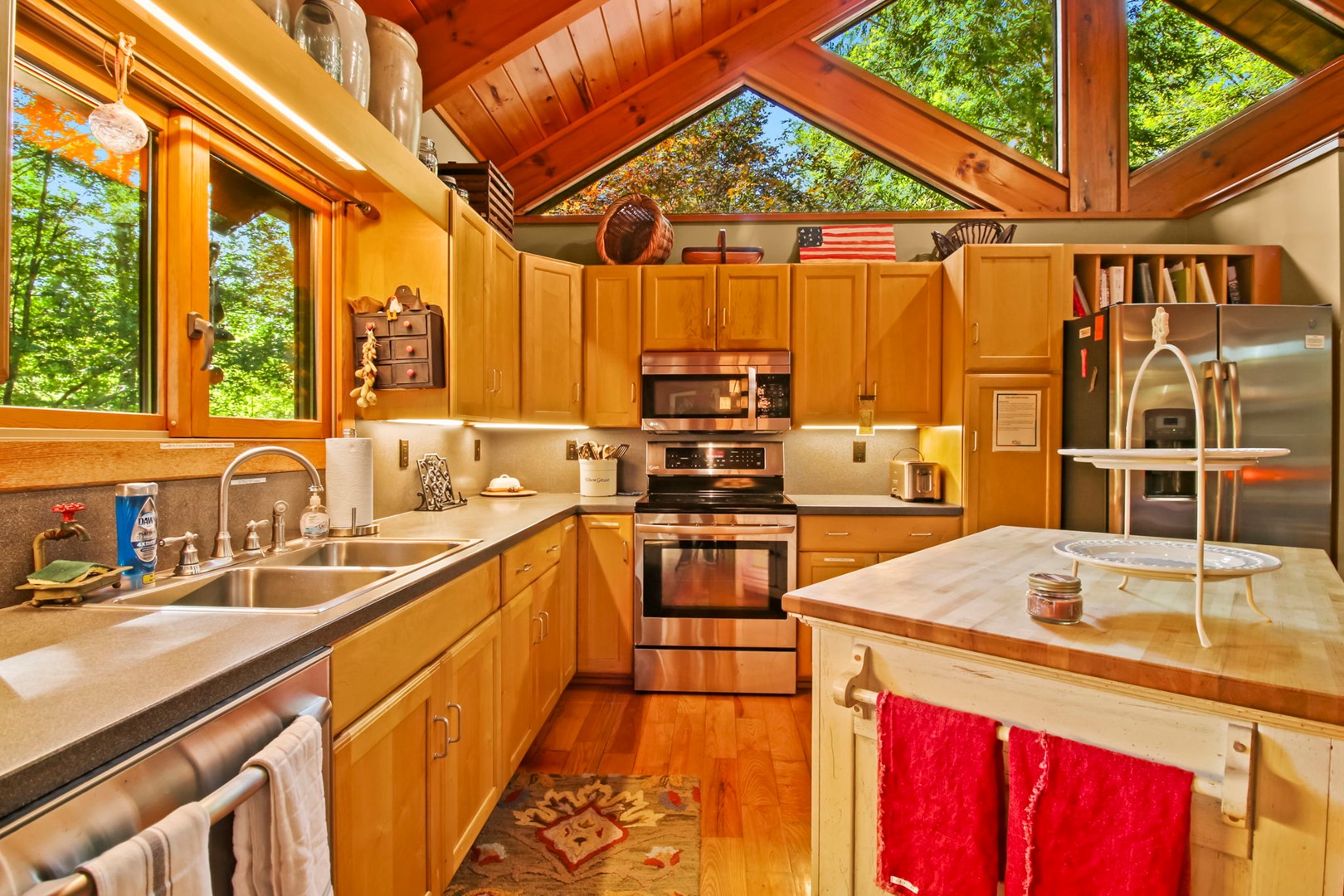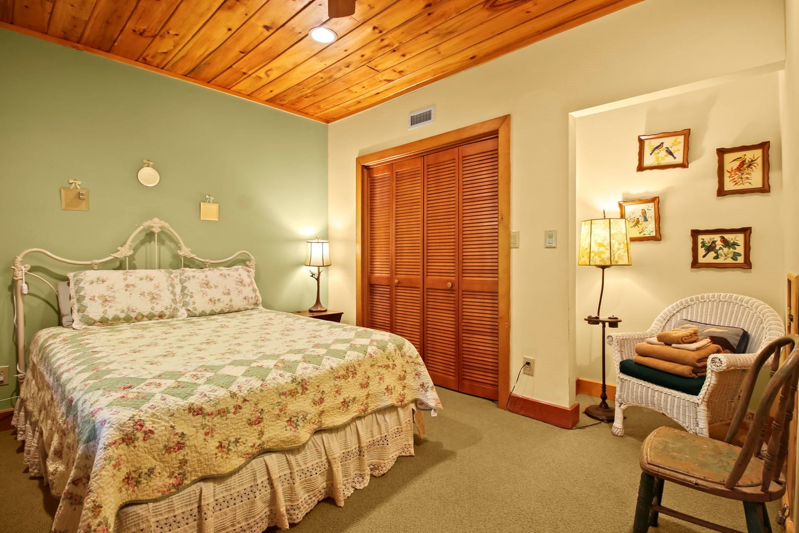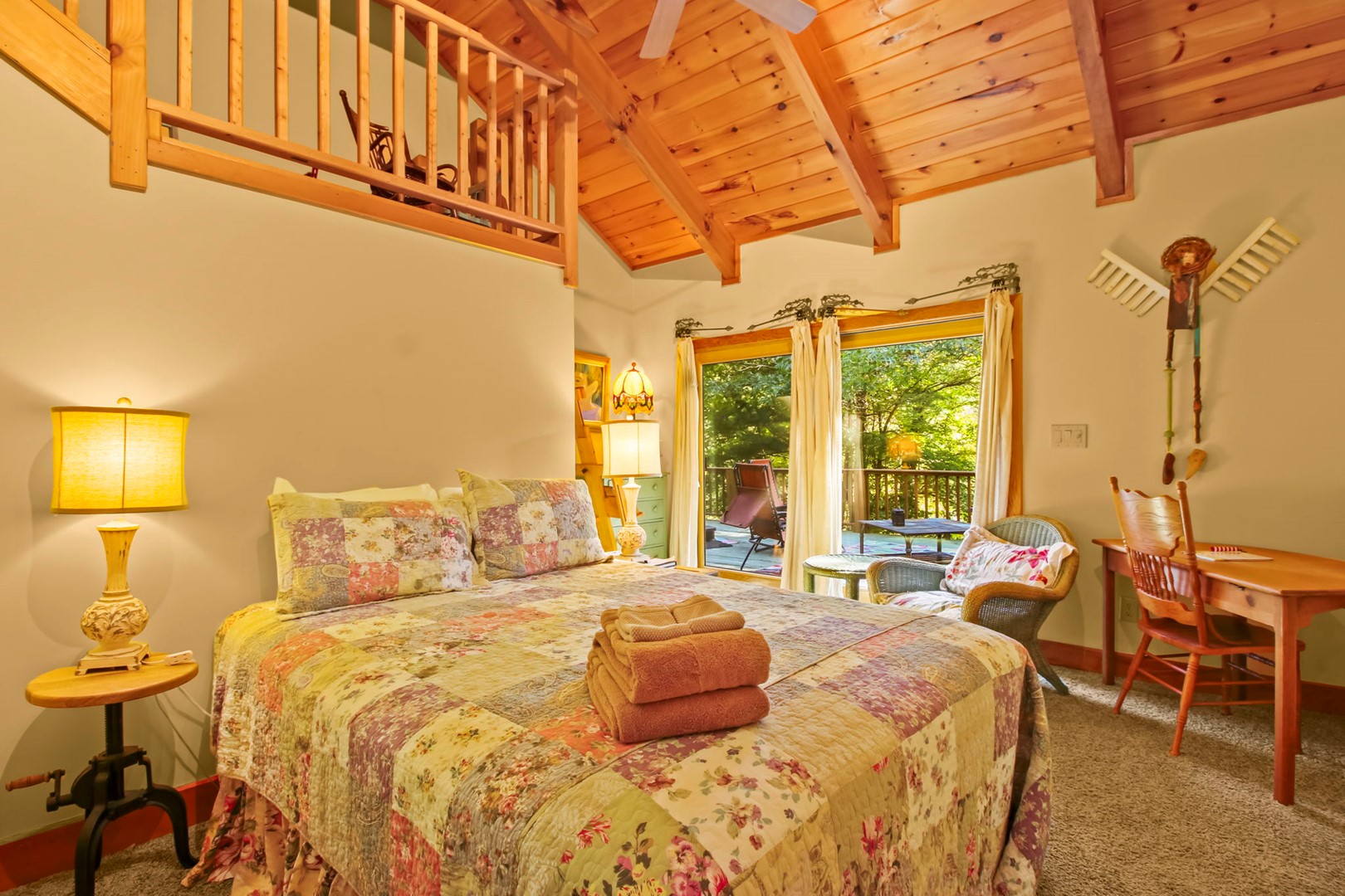 It is here that we have lovingly filled our getaway with our family heirlooms, artwork and a distinct, timeless feel of times-gone-by. White pine cathedral ceilings and wide planked ash floors provide the framework for all of this, warmly folded under quilts and the quality amenities you don’t want to do without.